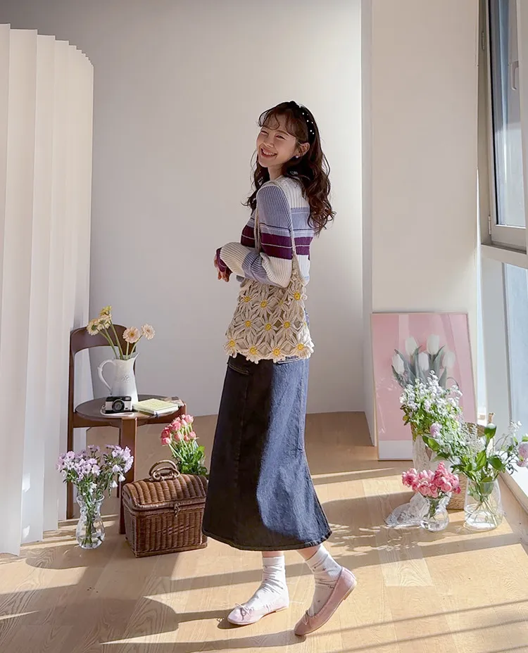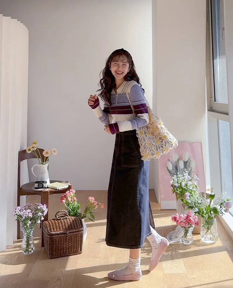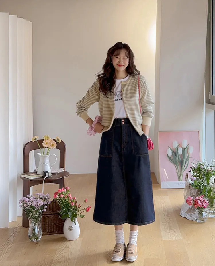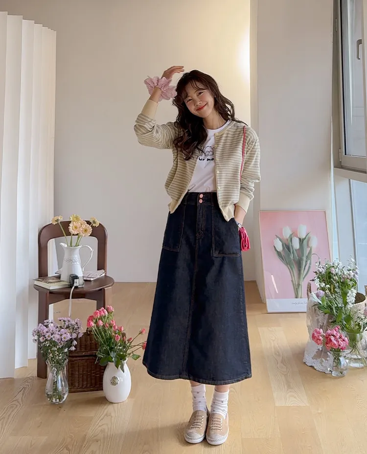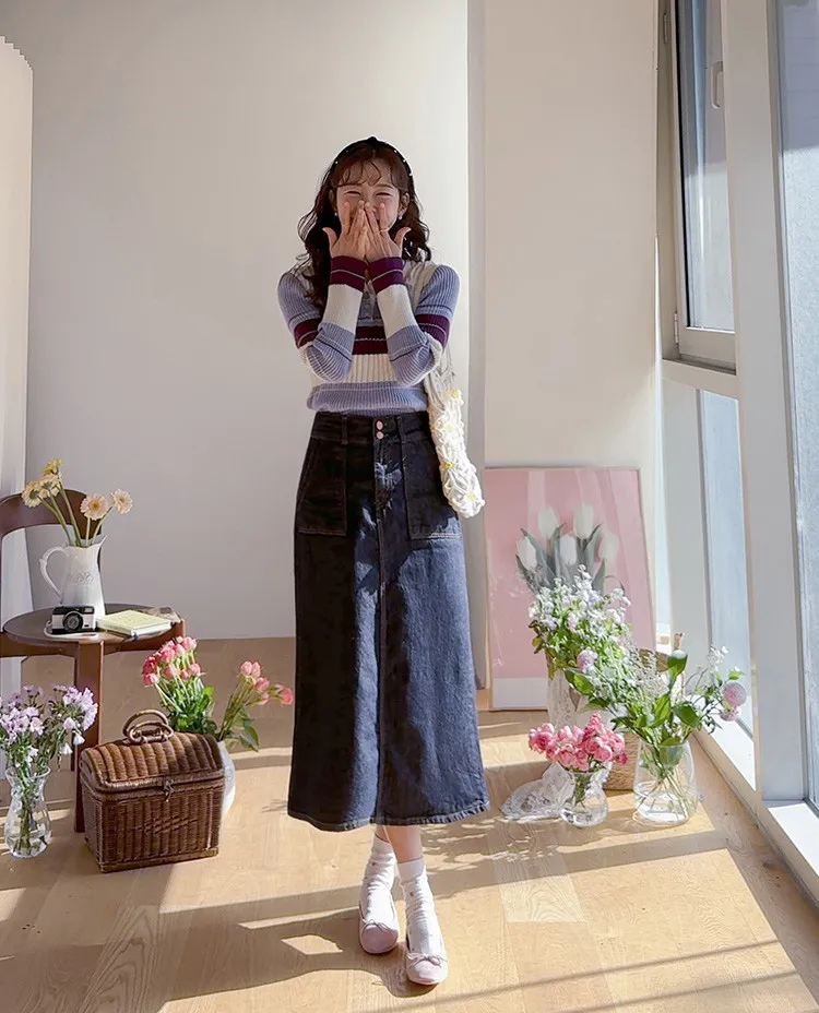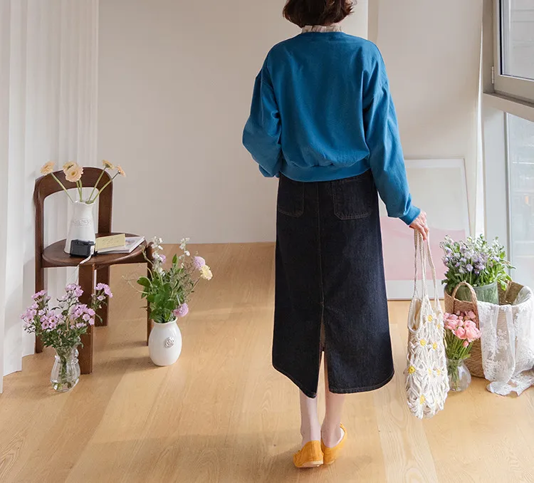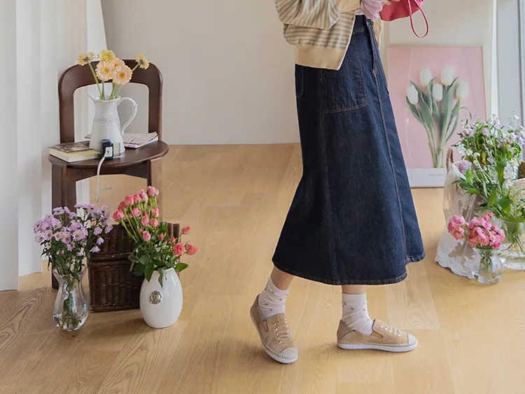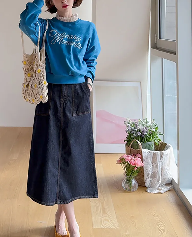 舒適雙扣A字剪裁後開衩牛仔中長裙