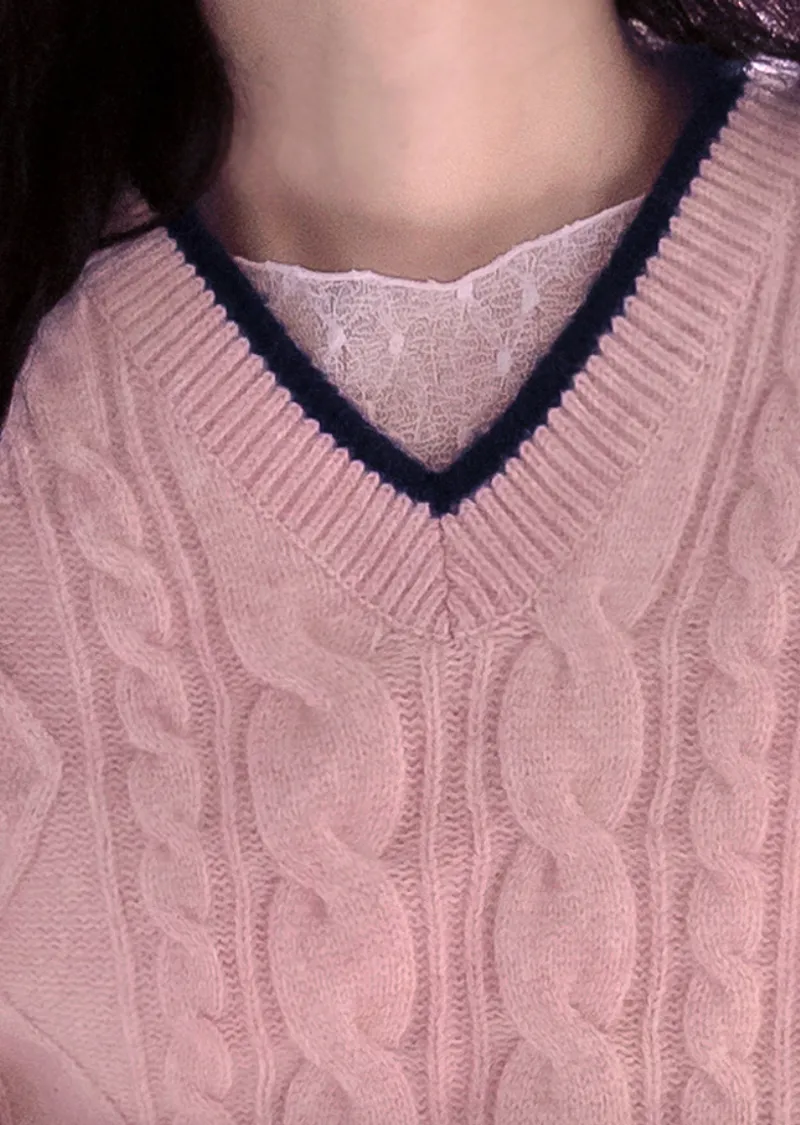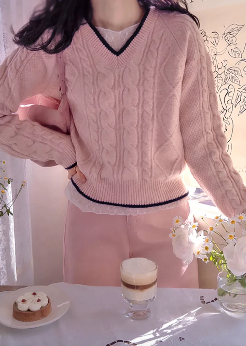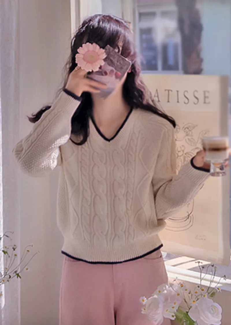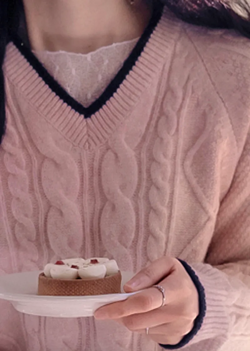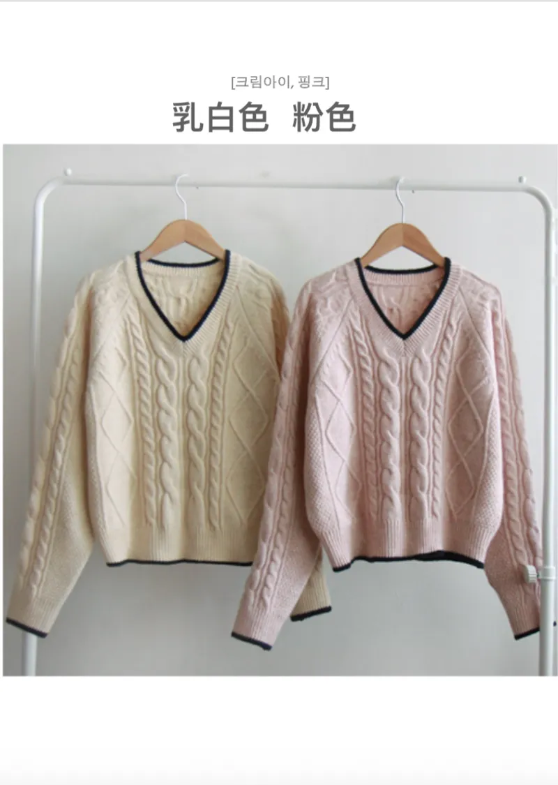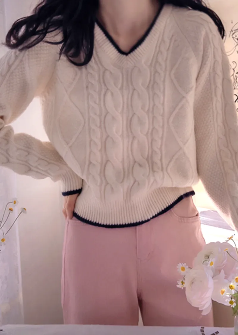 柔軟舒適配色線邊V領扭紋編織針織上衣