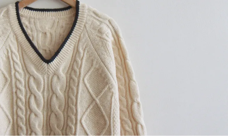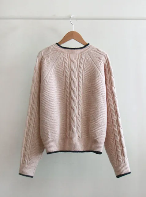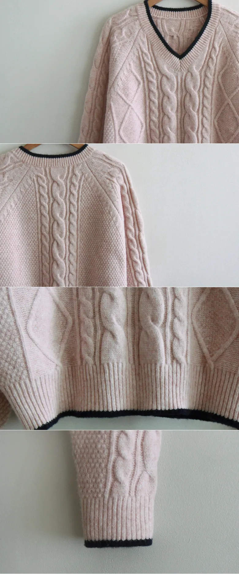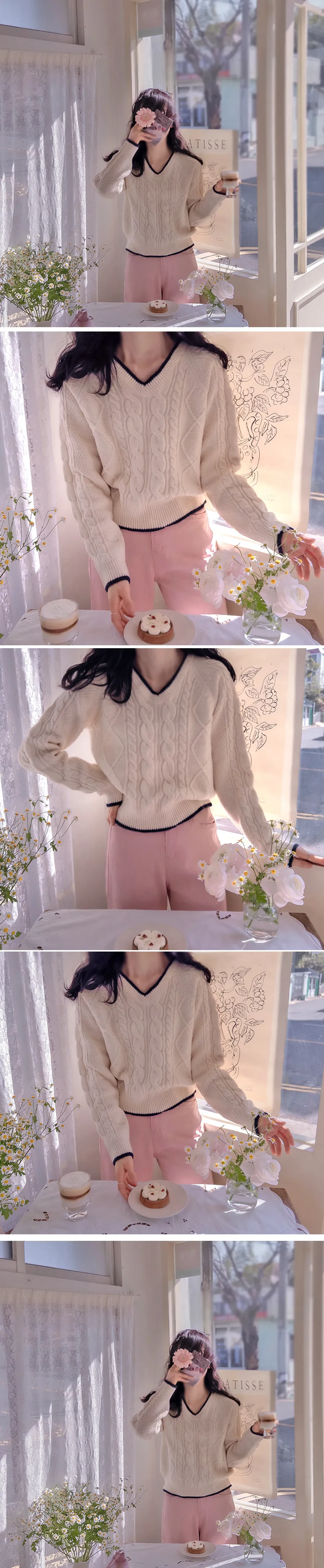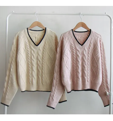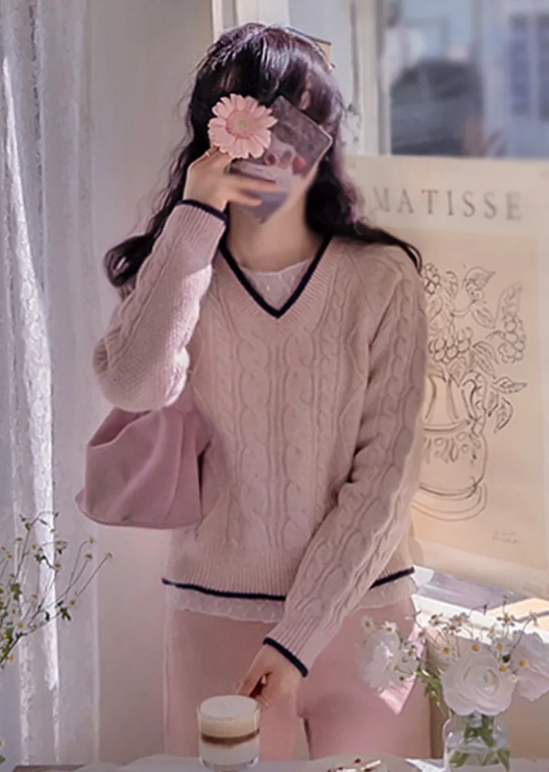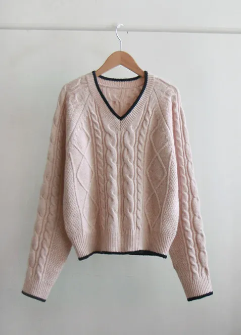 柔軟舒適配色線邊V領扭紋編織針織上衣