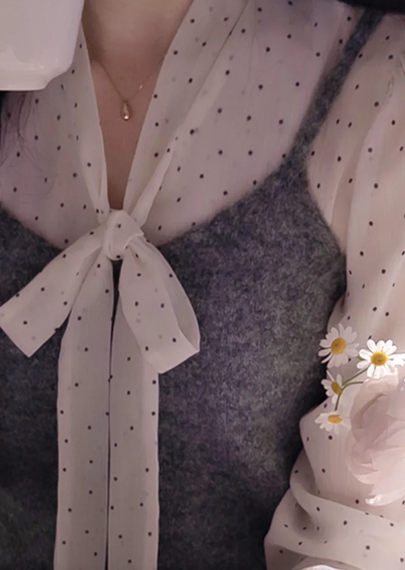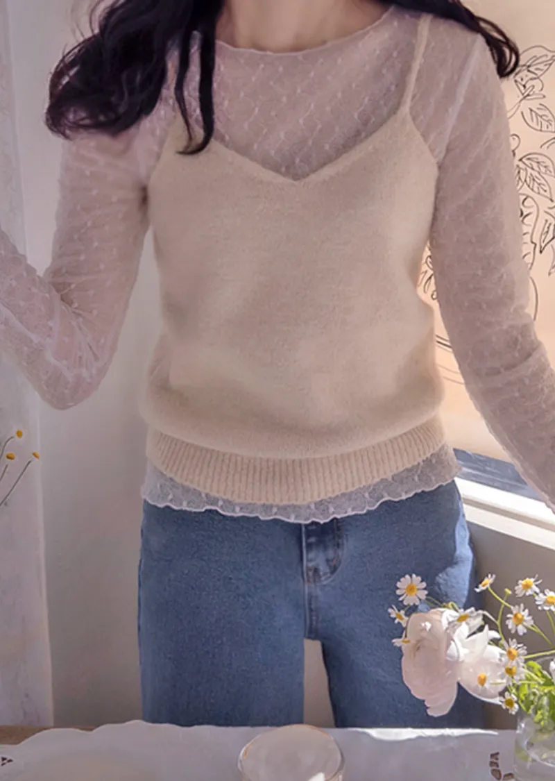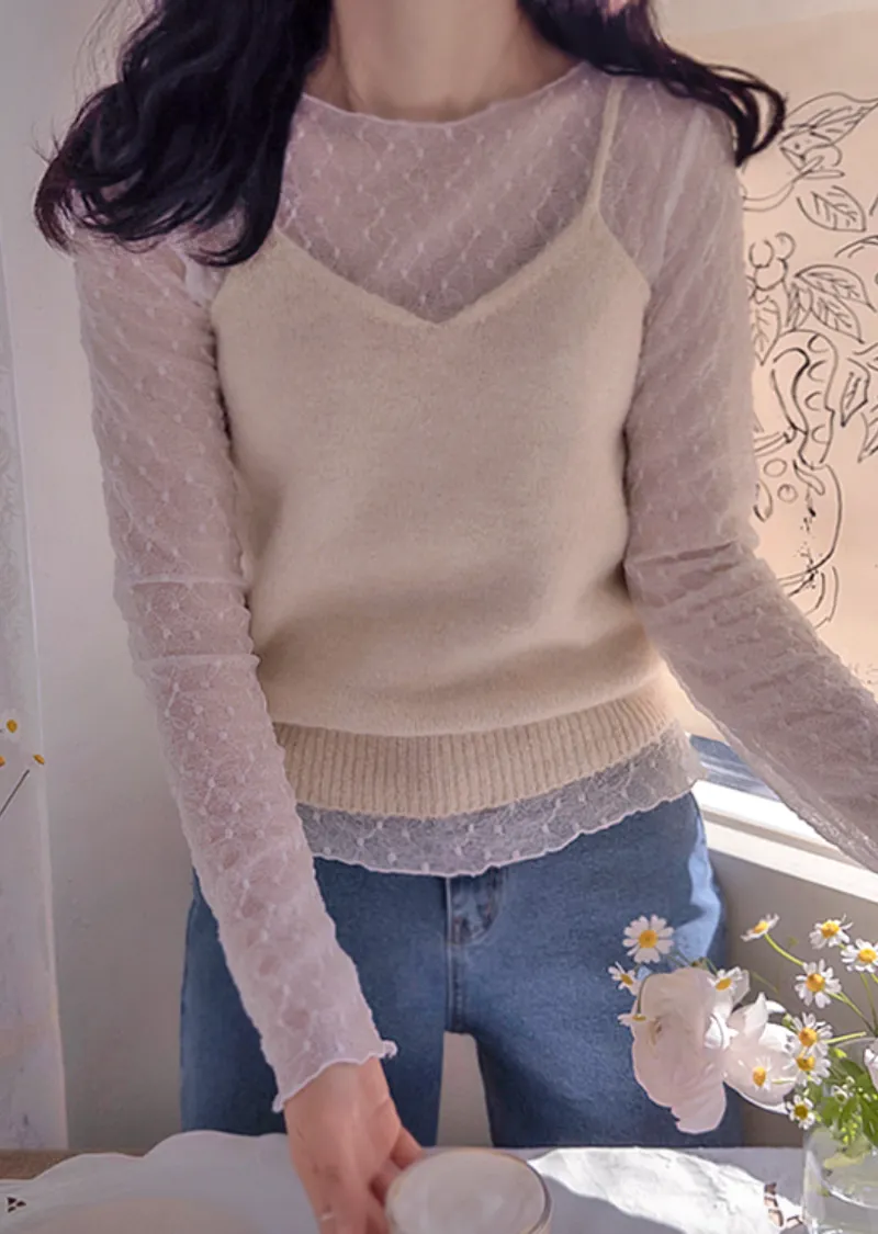 可愛圓點蕾絲透膚彈性穿搭上衣