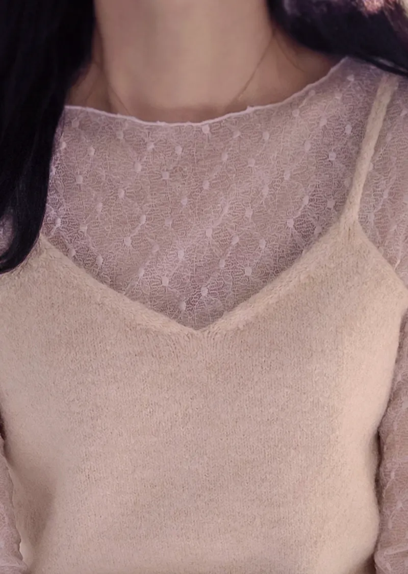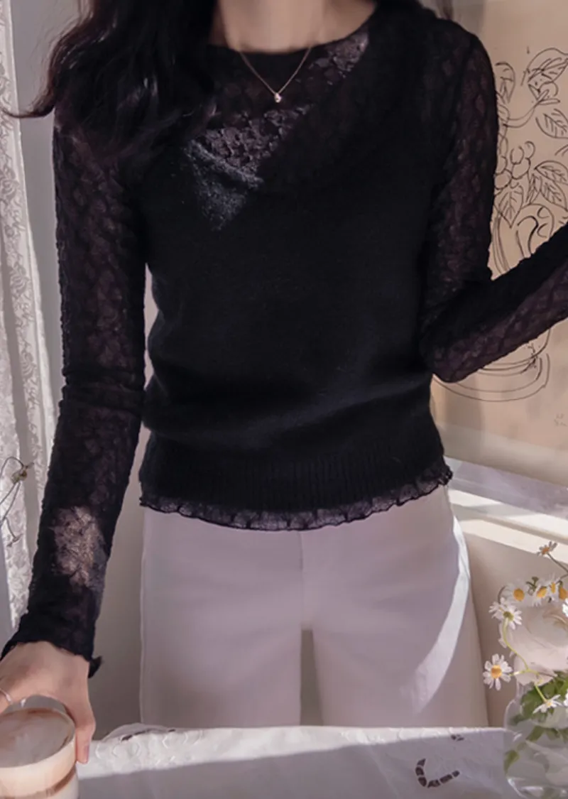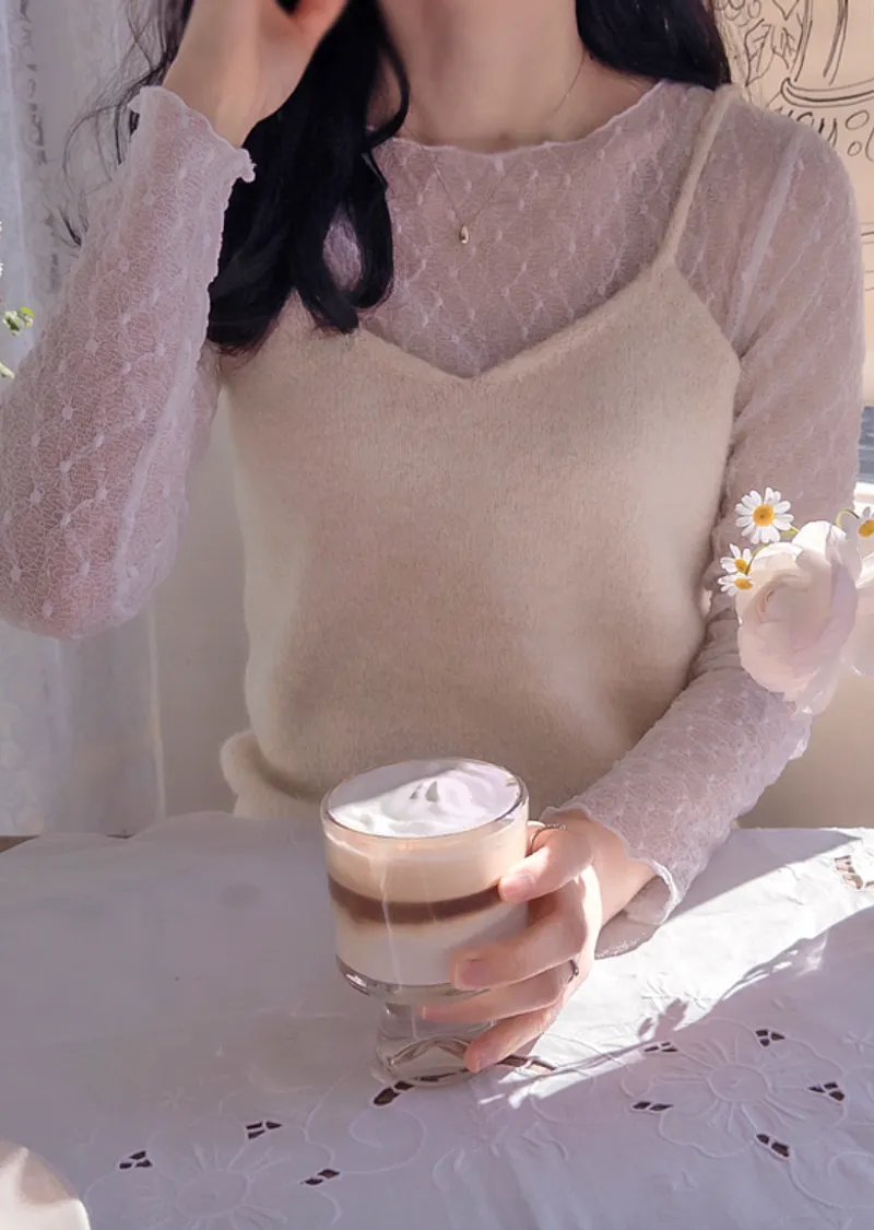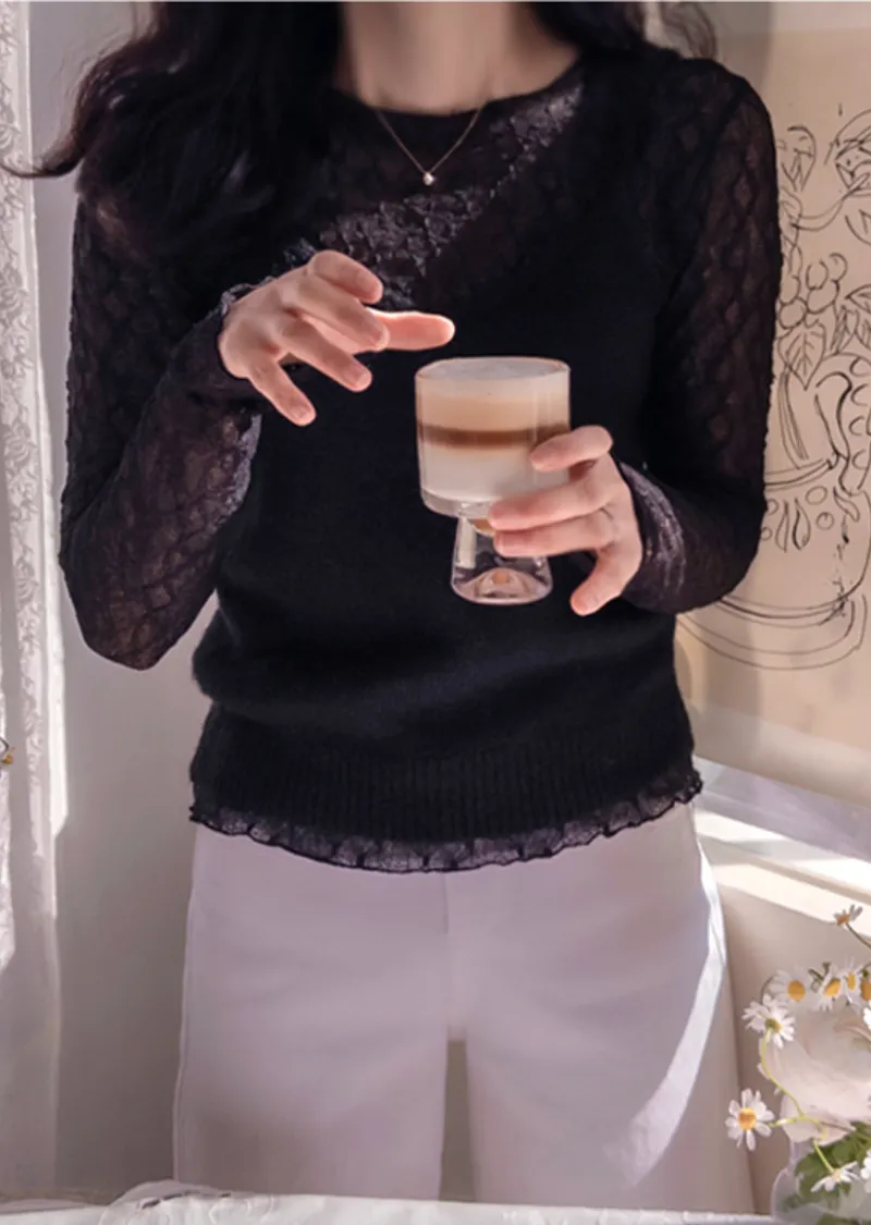 可愛圓點蕾絲透膚彈性穿搭上衣