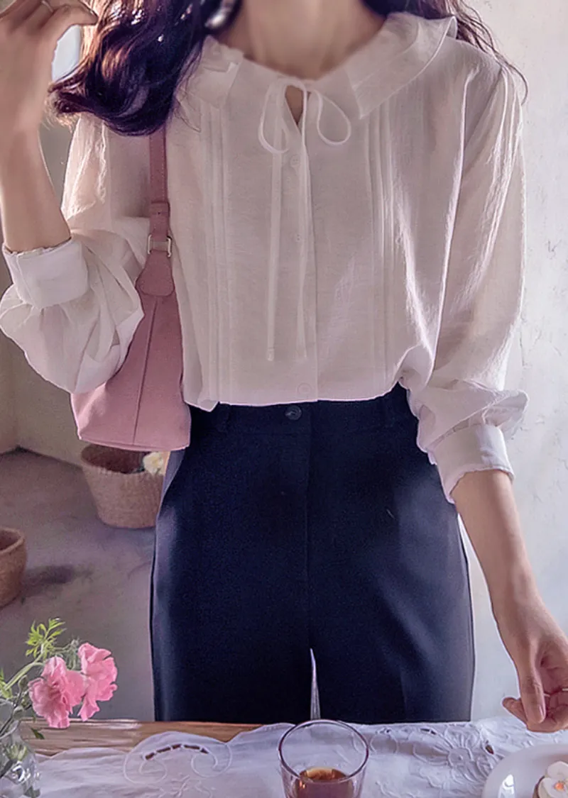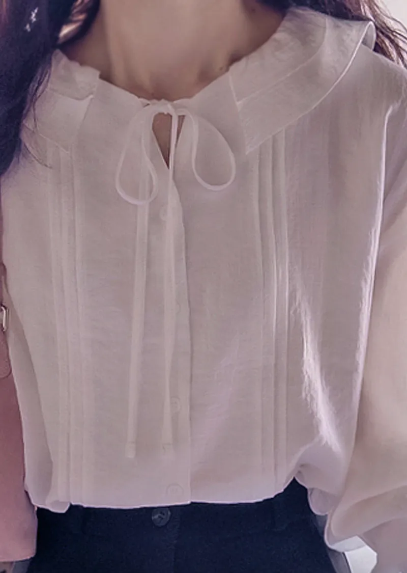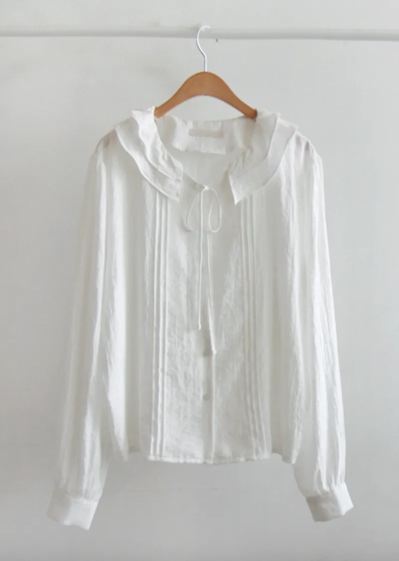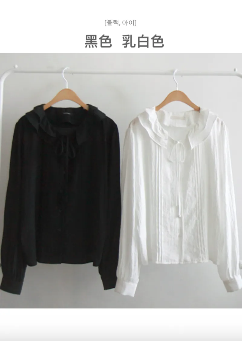【春季新品】【雙層領,展現甜美魅力】【褶襉設計與緞帶繫領,更添獨特精緻感】【柔軟彈性布料,穿著舒適優雅】【寬鬆版型,春季百搭上衣】