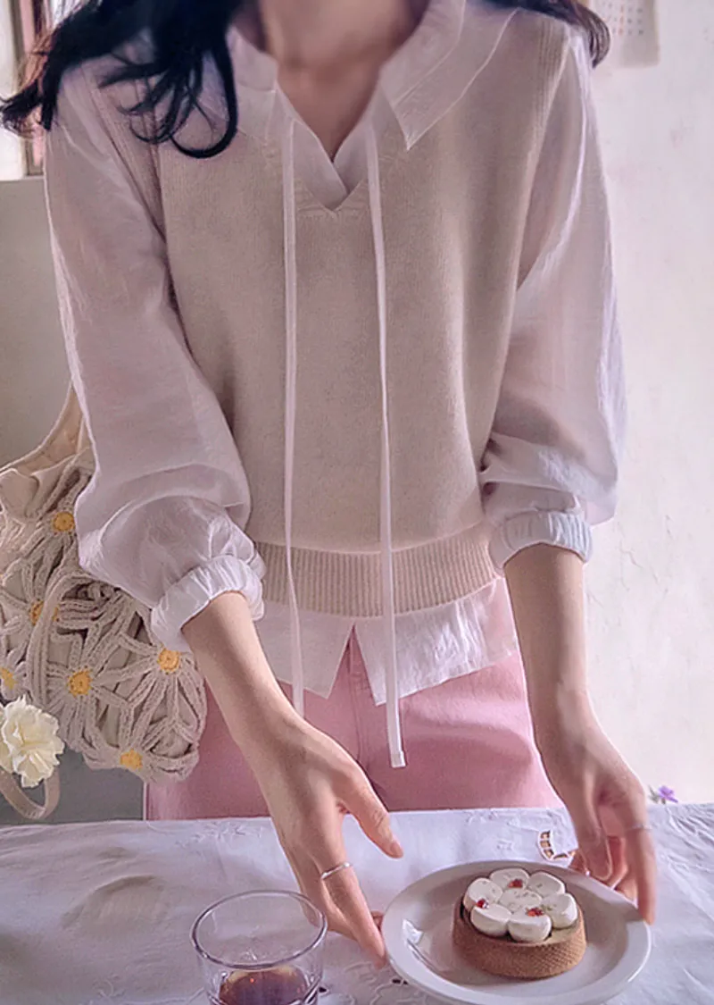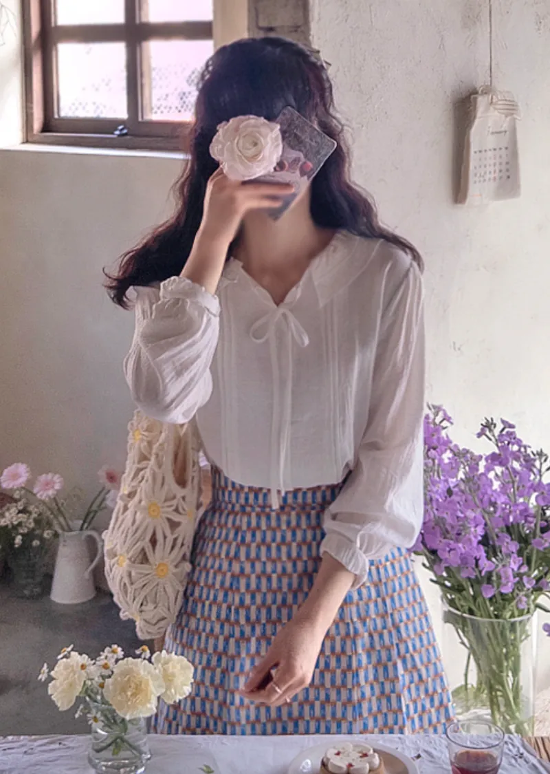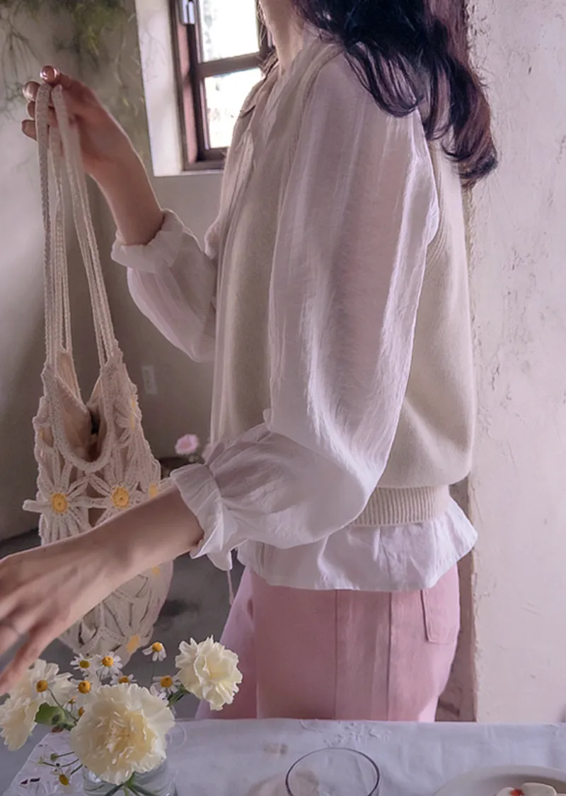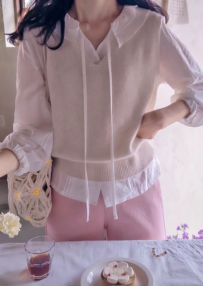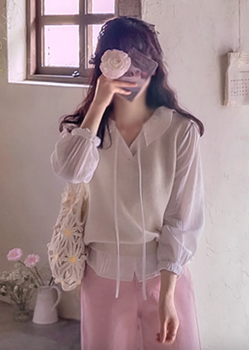 【春季新品】【雙層領,展現甜美魅力】【褶襉設計與緞帶繫領,更添獨特精緻感】【柔軟彈性布料,穿著舒適優雅】【寬鬆版型,春季百搭上衣】