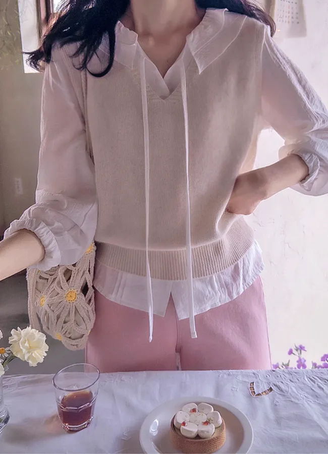 可愛甜美雙層次領綁帶褶襉排扣上衣