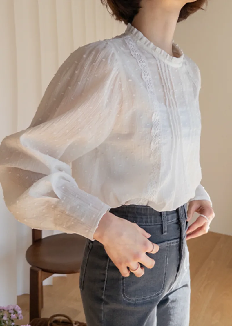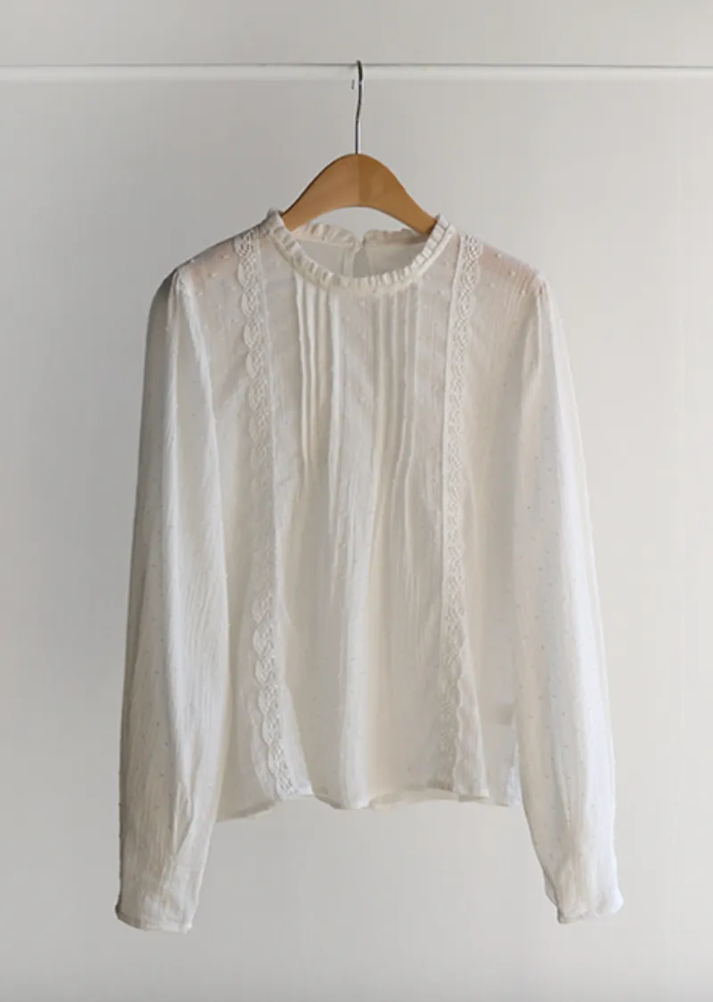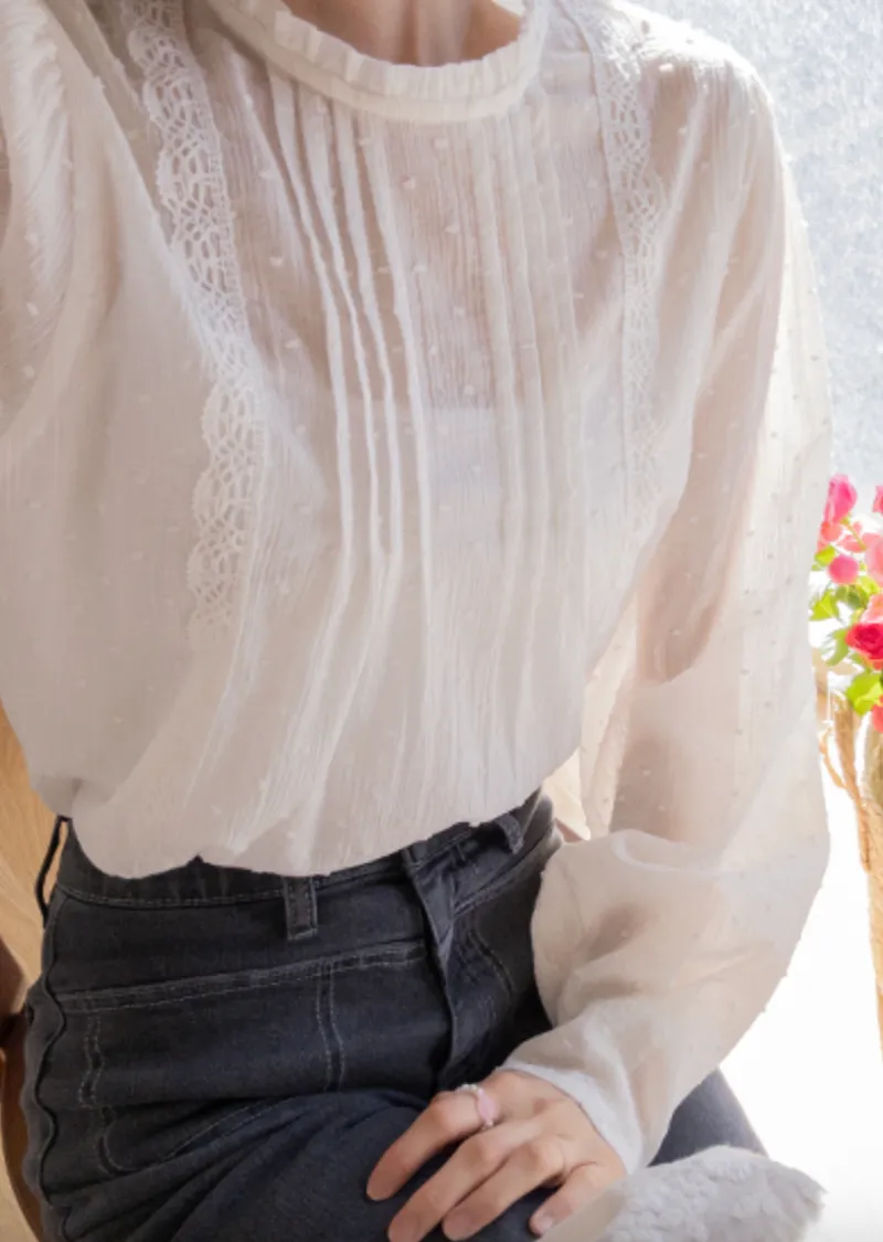 柔美摺邊領口褶襉蕾絲飾邊袖口收褶立體雪花點點上衣