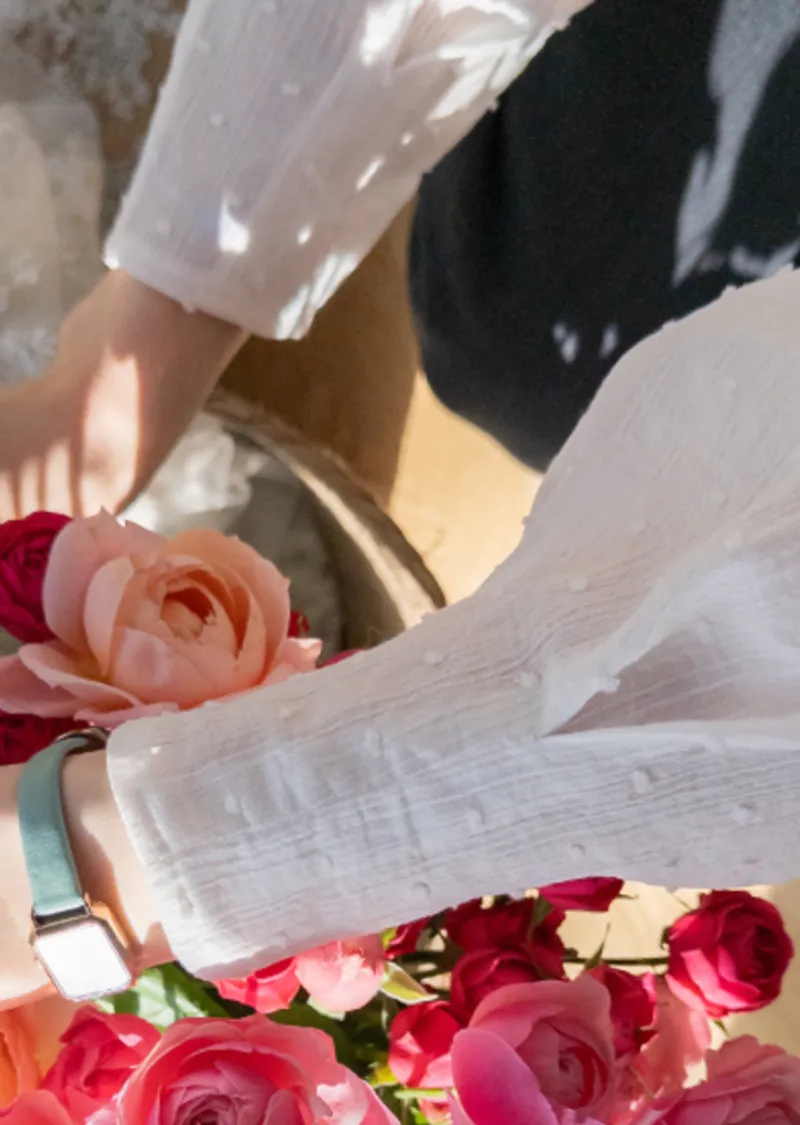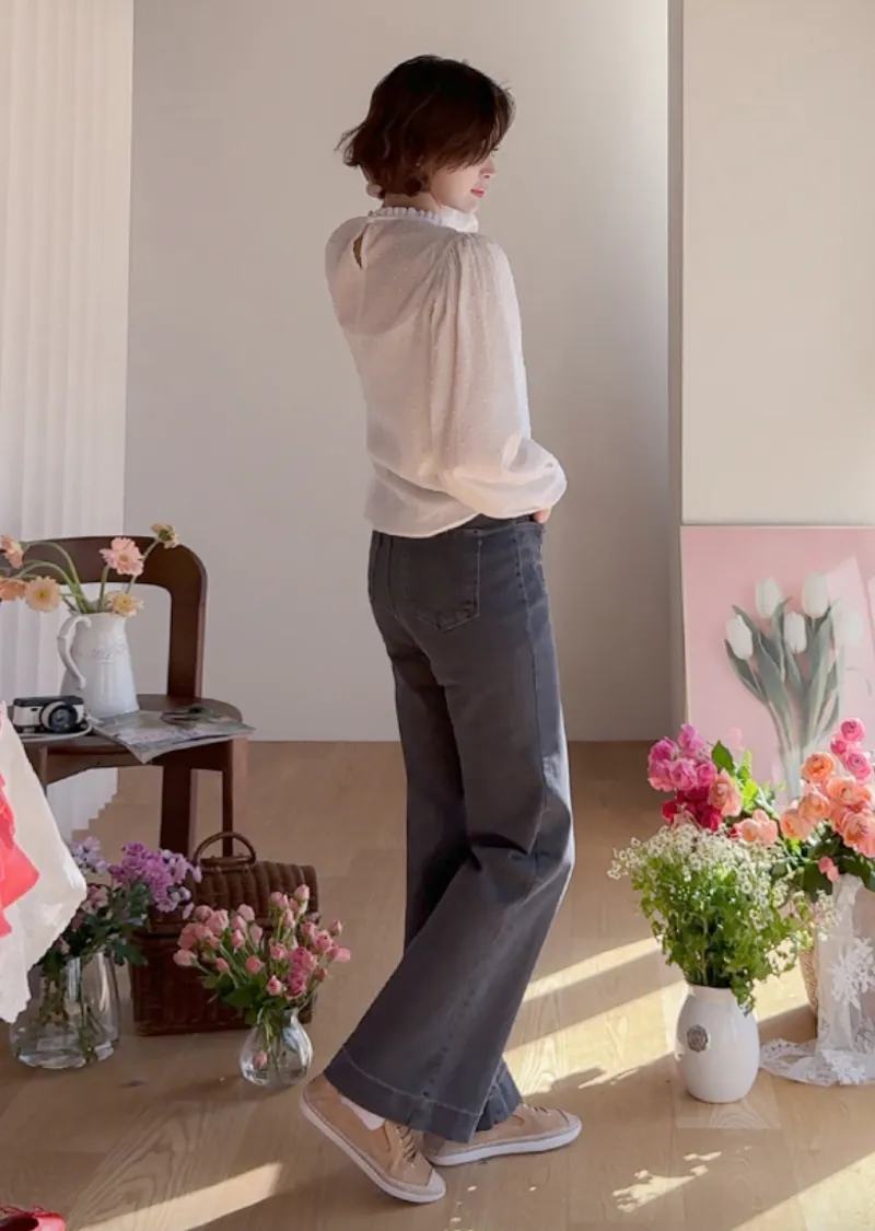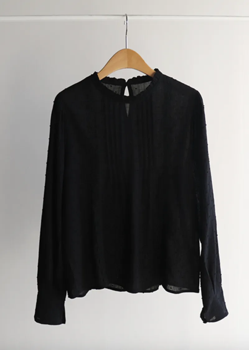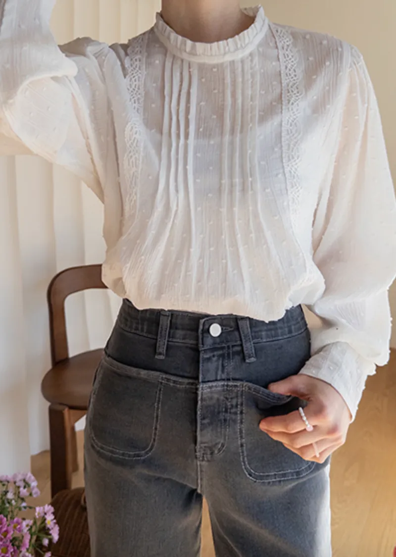 柔美摺邊領口褶襉蕾絲飾邊袖口收褶立體雪花點點上衣