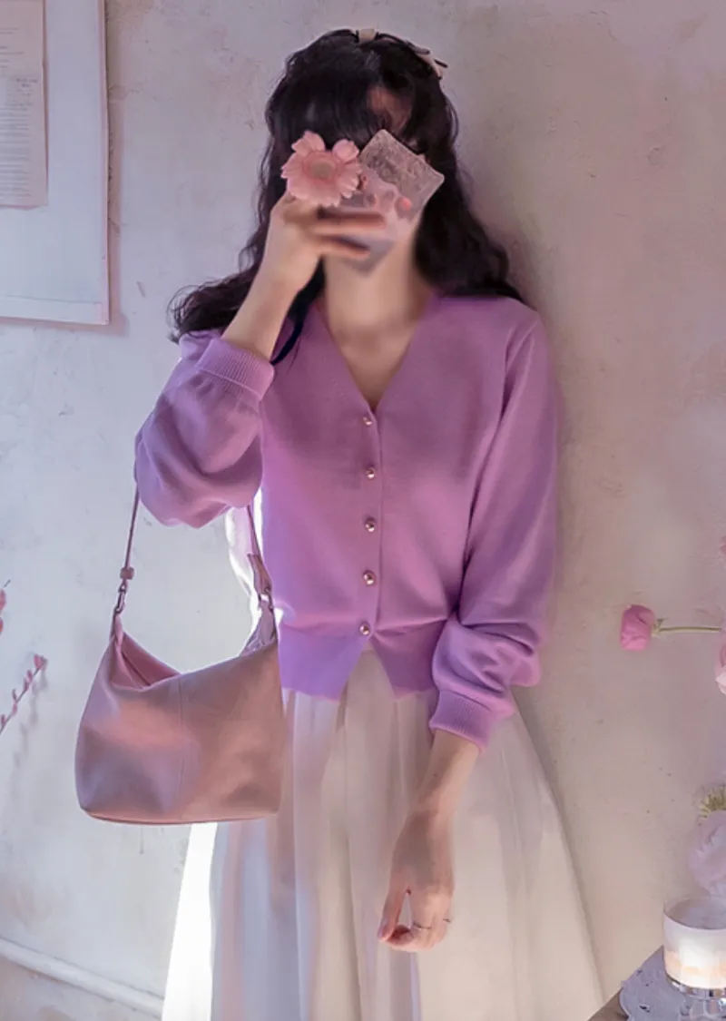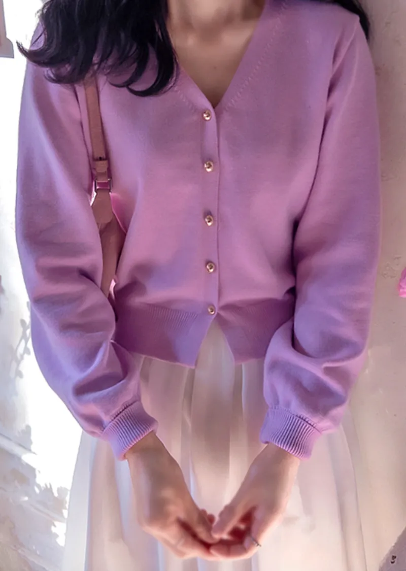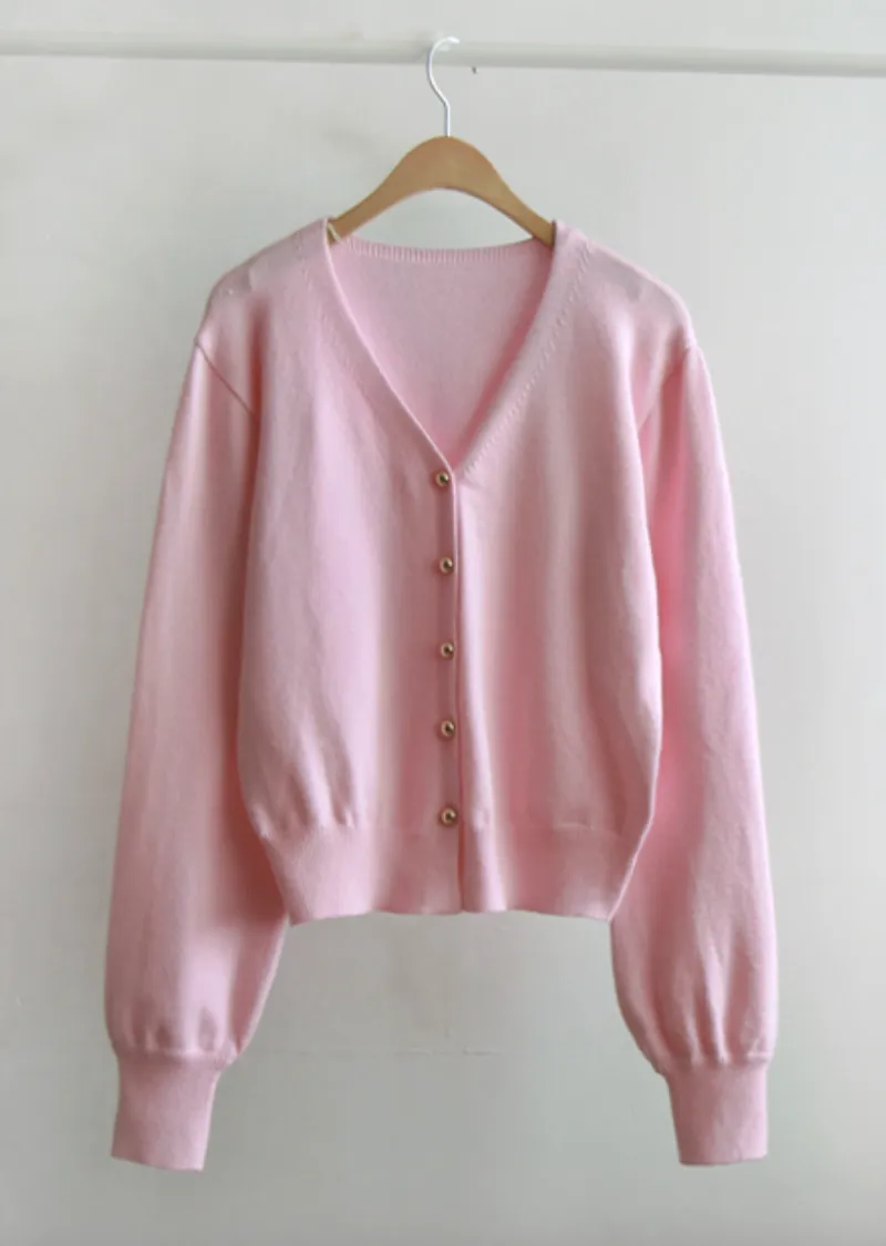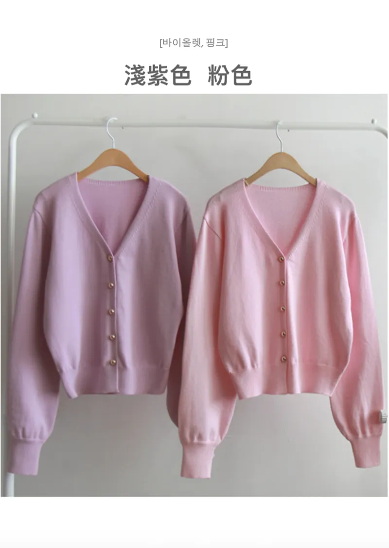 【春季新品】【柔軟彈性針織布料】【粉彩色系,充滿春日氣息的亮色針織衫】【精緻V領搭配金色鈕扣,獨特設計】【泡泡袖設計,盡顯優雅氣質】【柔軟彈性布料,穿著舒適】【充滿春日氣息的針織衫】