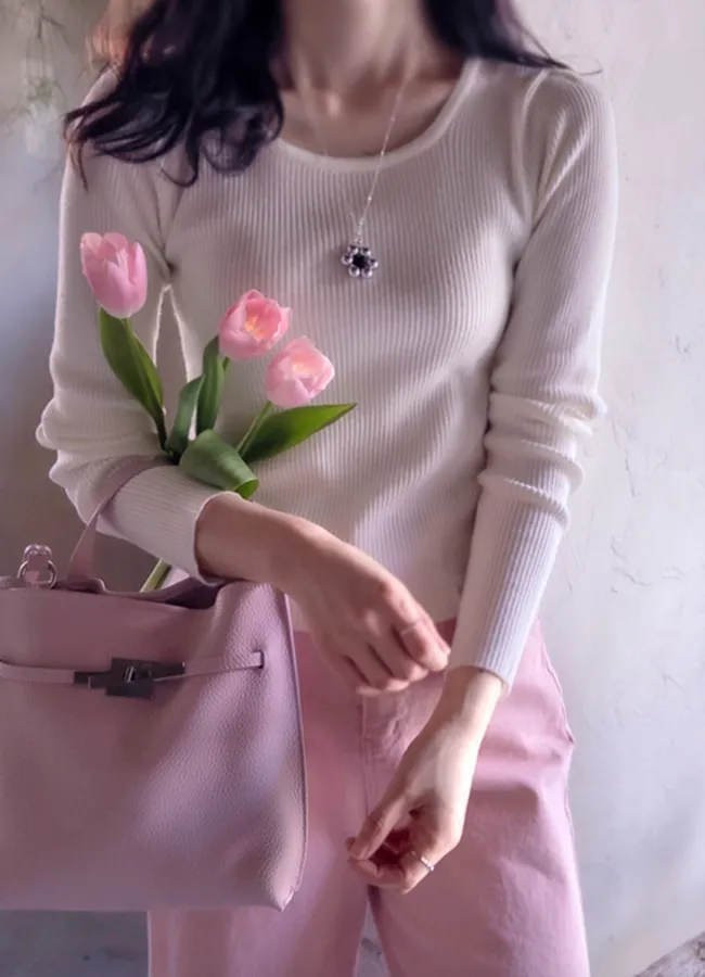 漂亮領型柔軟彈性羅紋修身針織上衣
