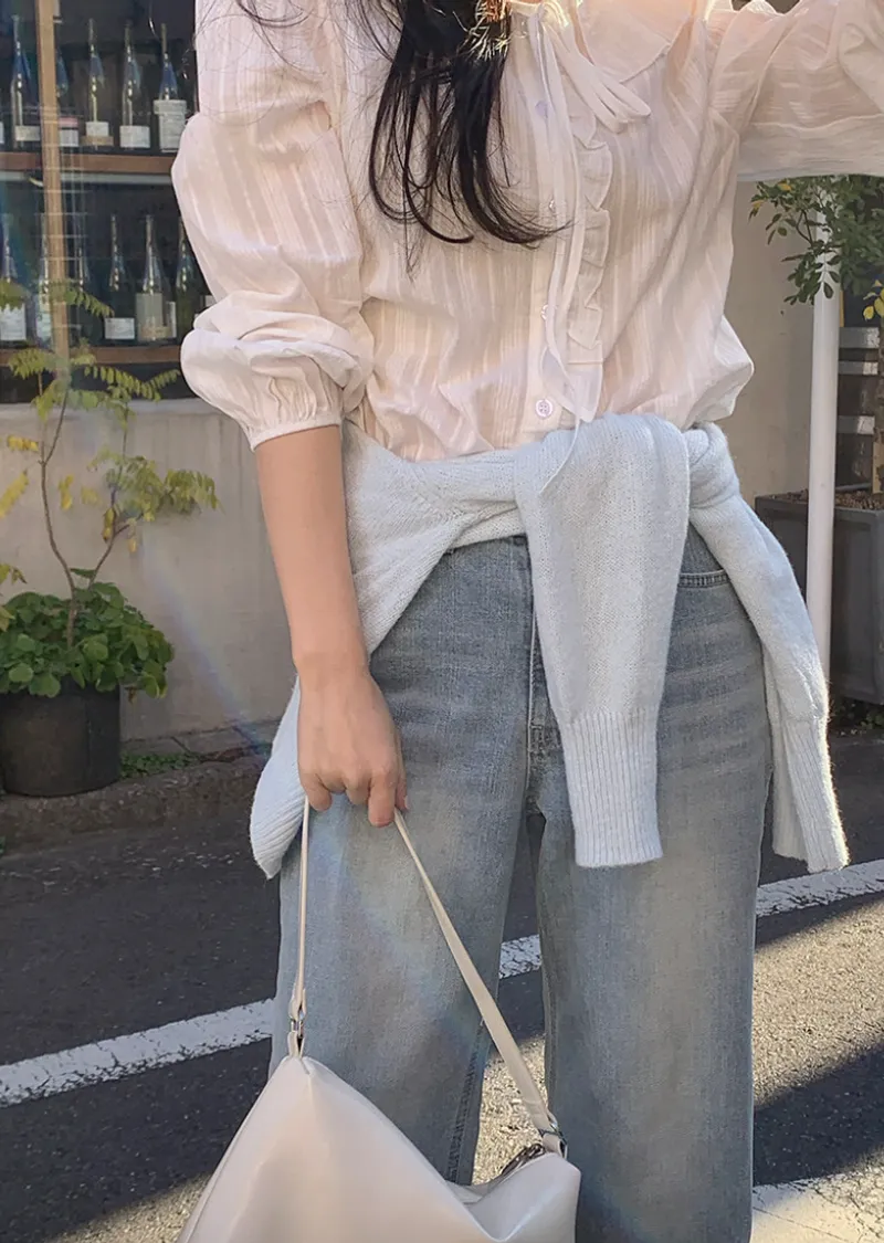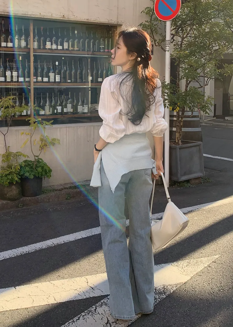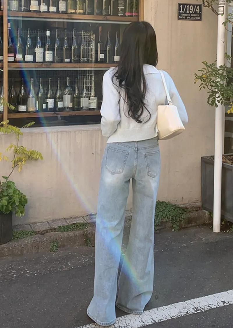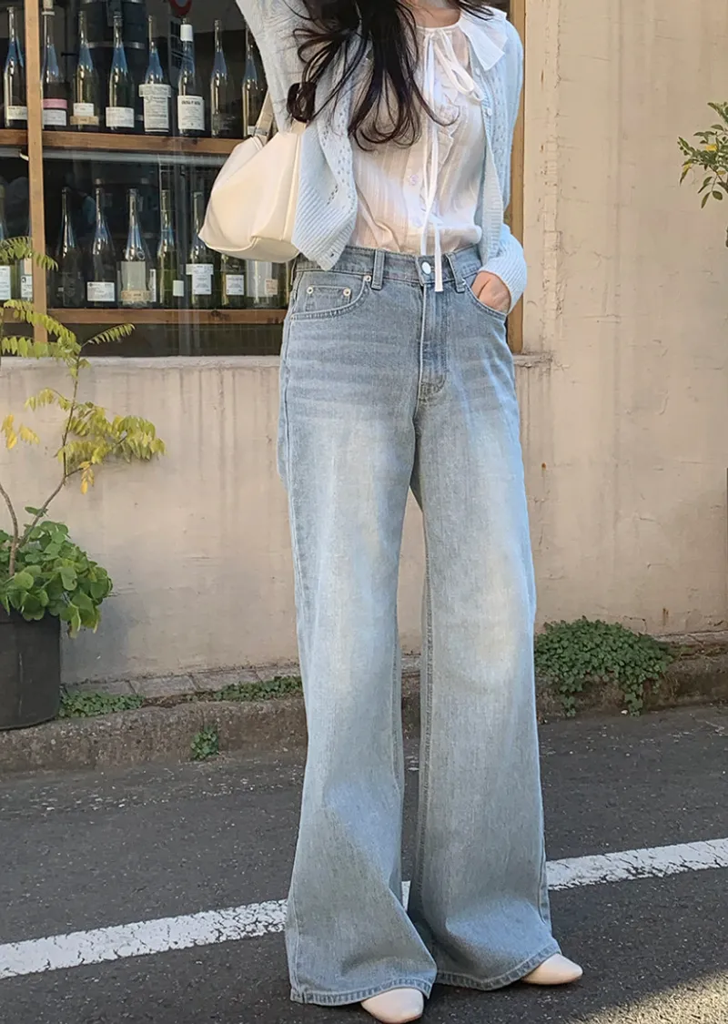 這款春季牛仔褲以明亮的淺藍色調,帶來