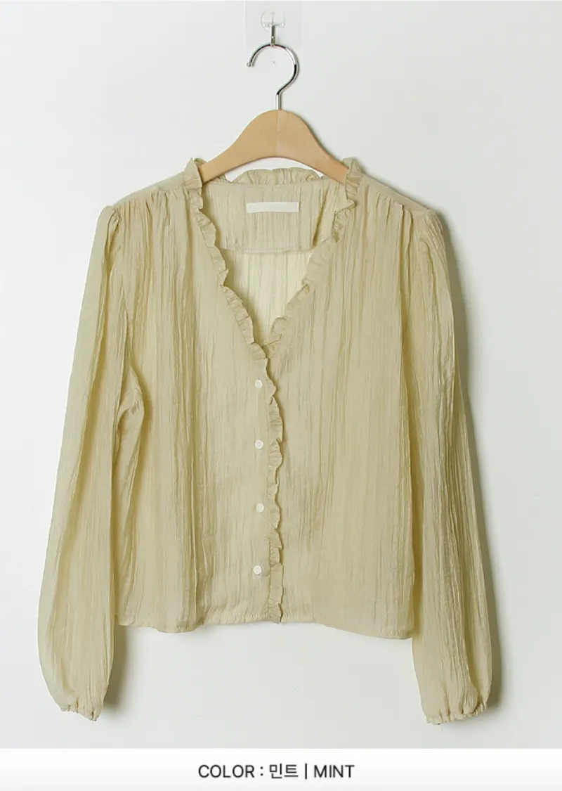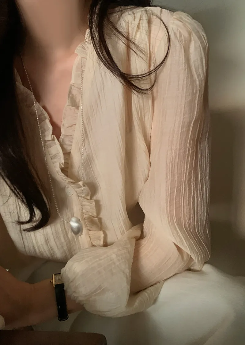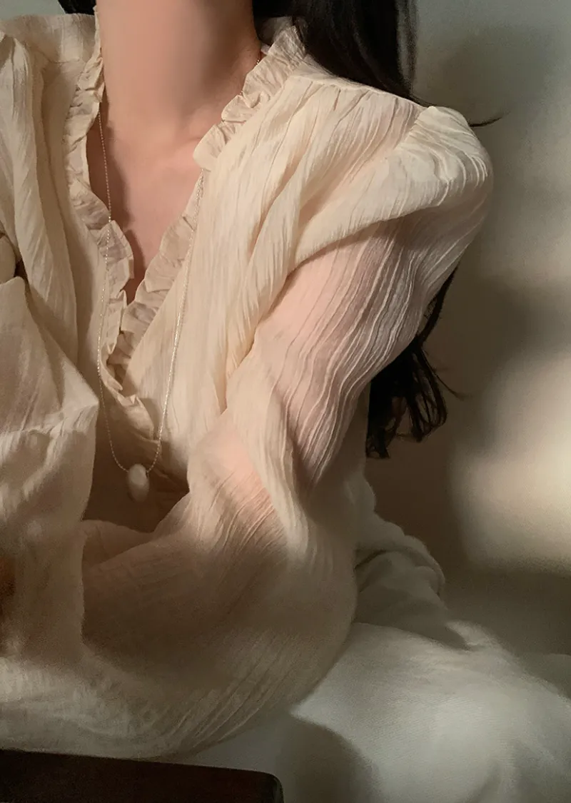 甜美荷葉摺邊領口至排扣邊柔軟褶皺排扣上衣