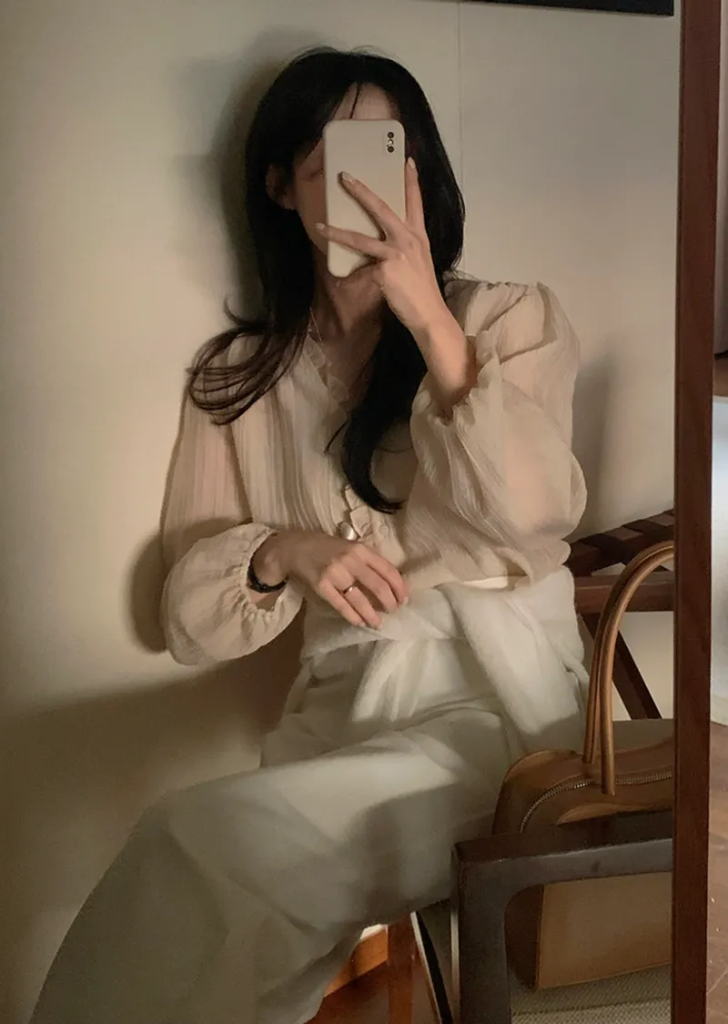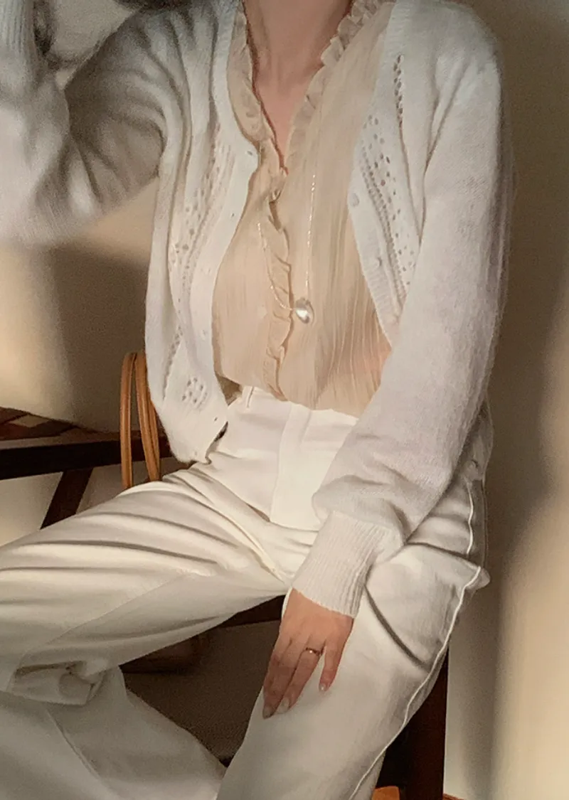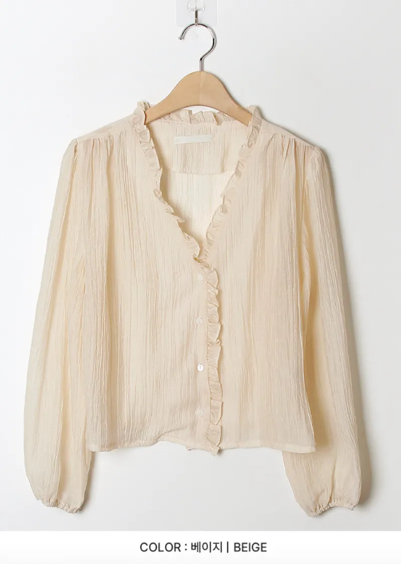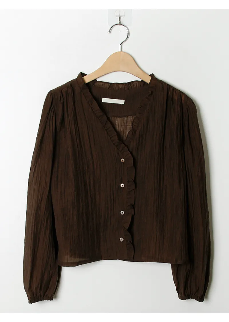 甜美荷葉摺邊領口至排扣邊柔軟褶皺排扣上衣