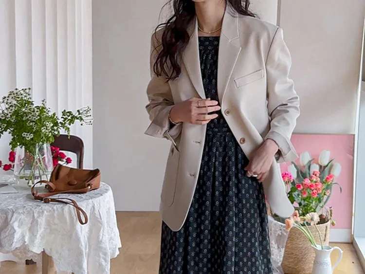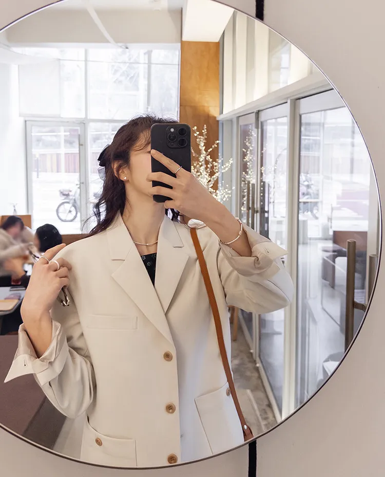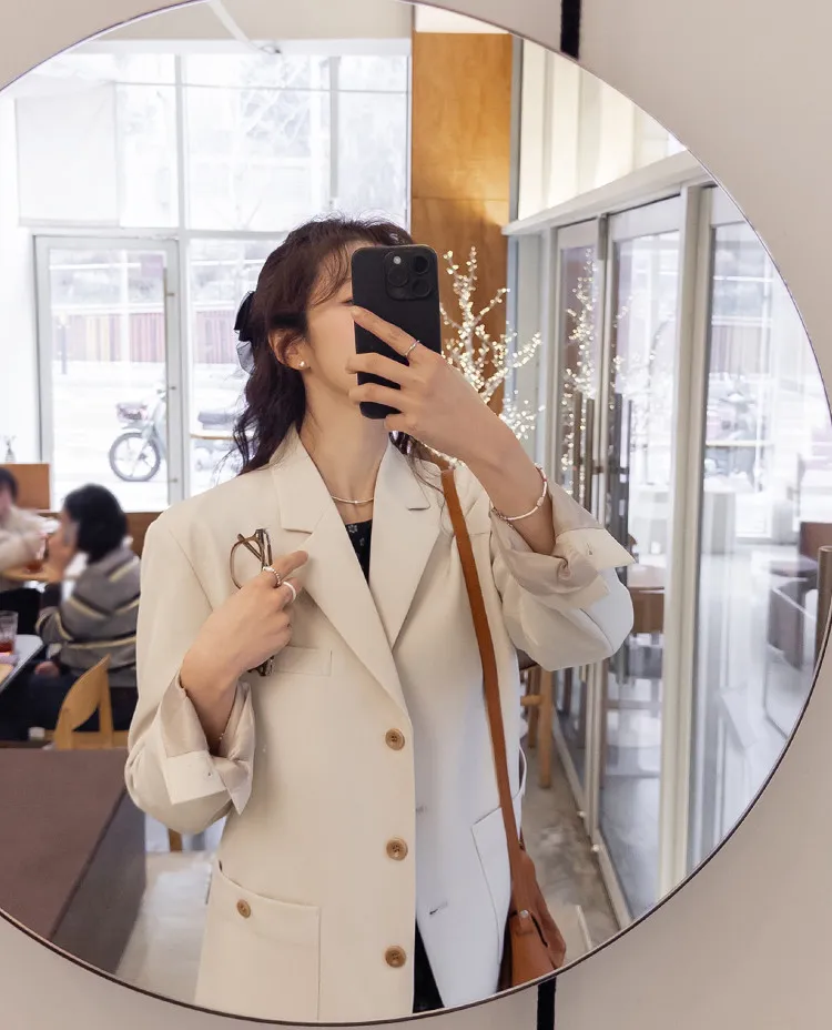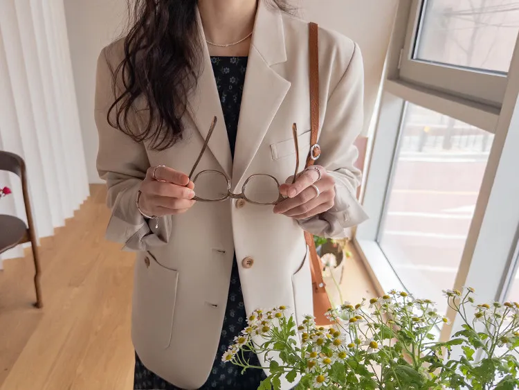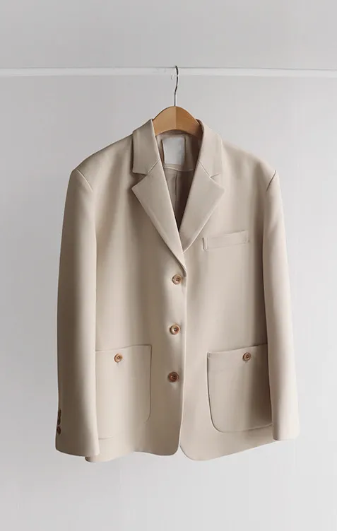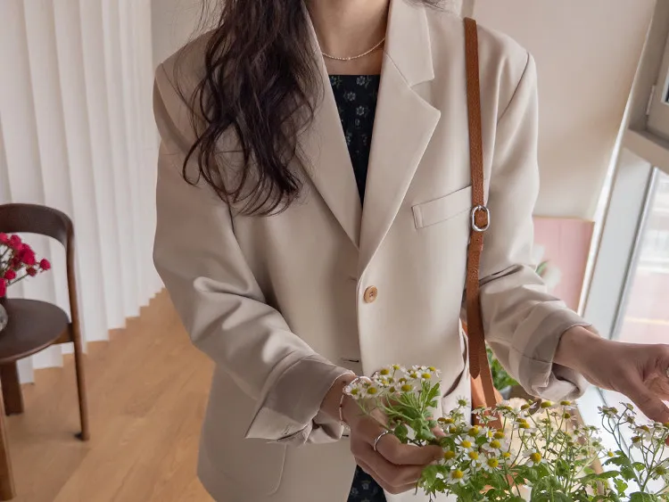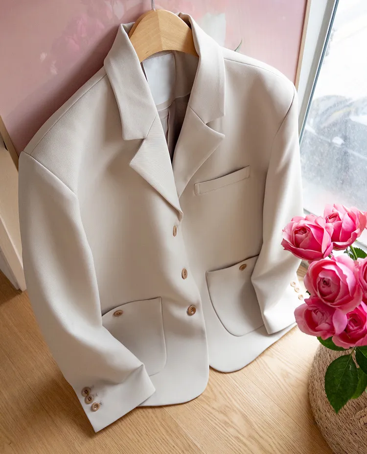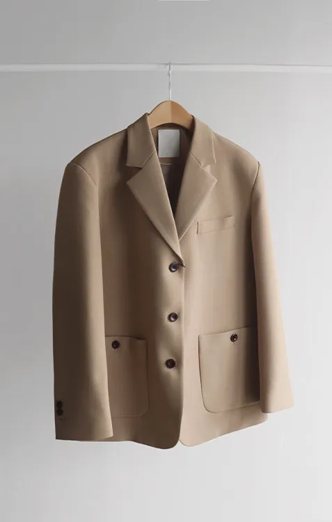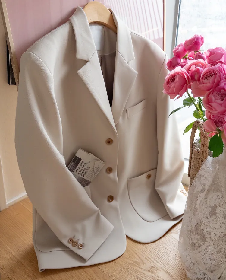 【簡潔俐落的線條,無繁複裝飾】【簡約單排扣設計】【長度適中,略微遮住臀部】【用途廣泛,從日常到正式場合均可穿著】