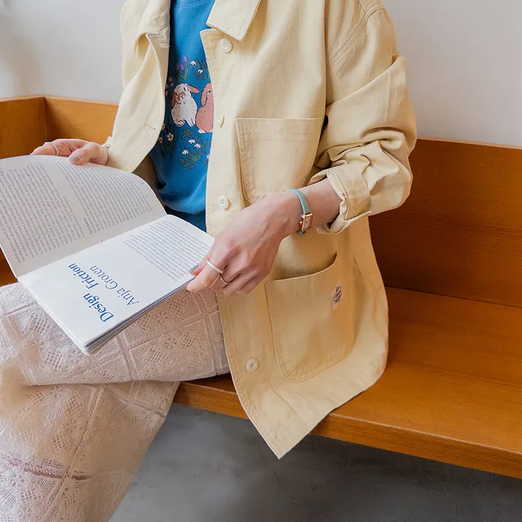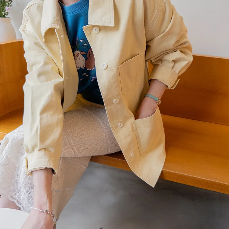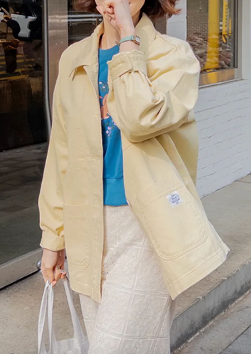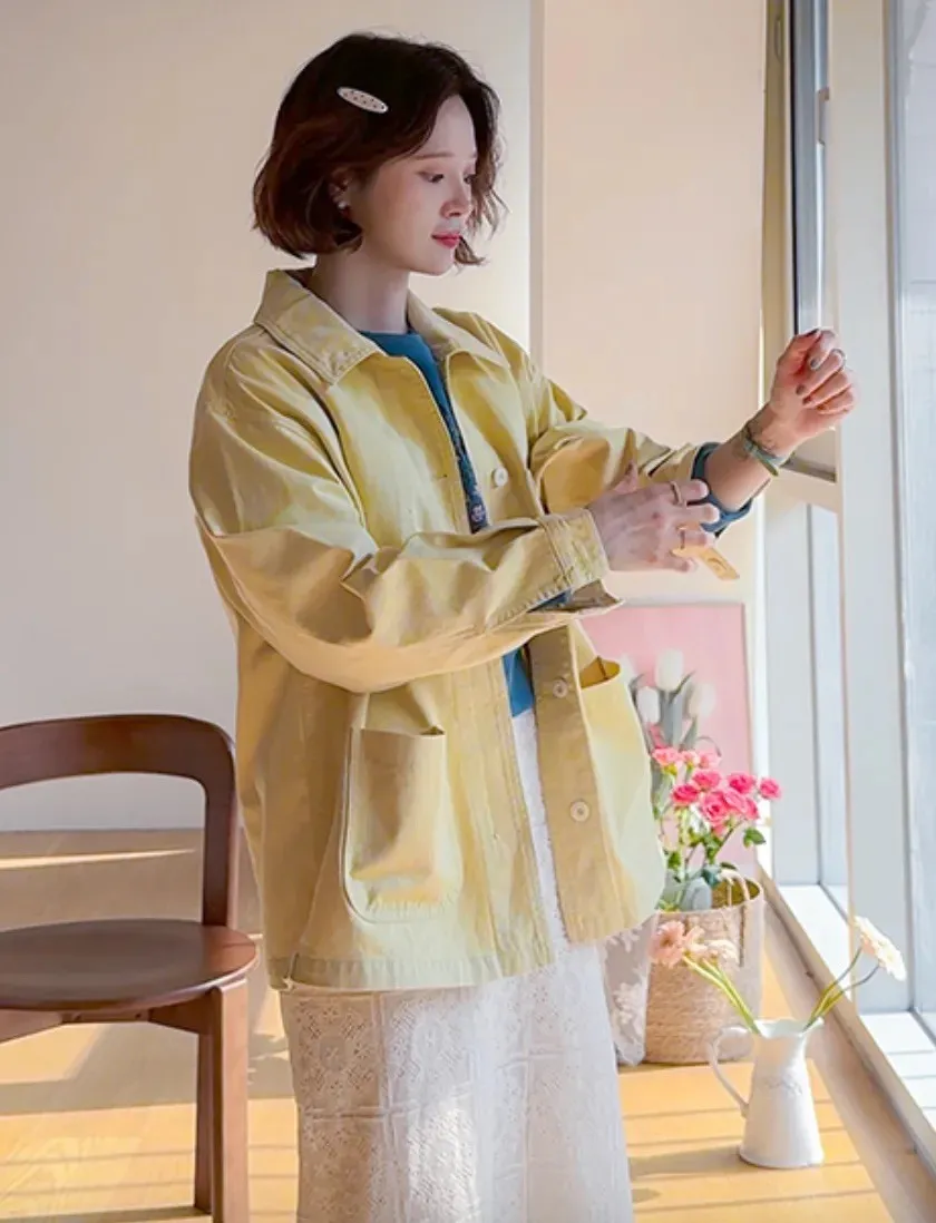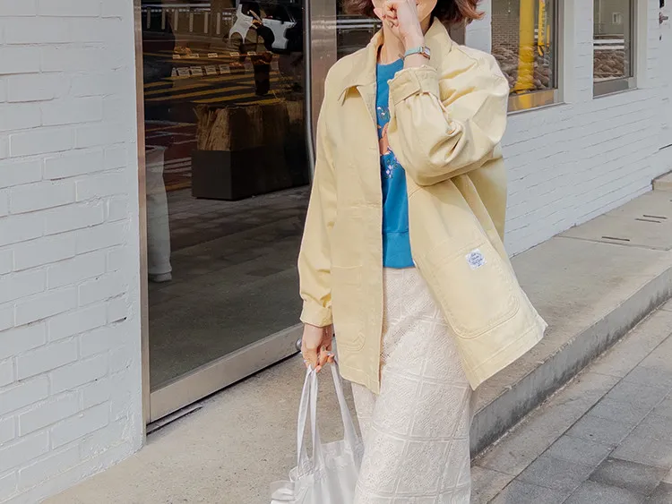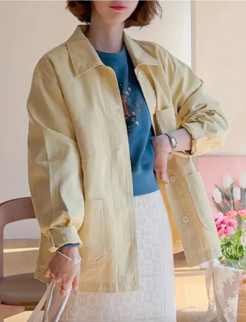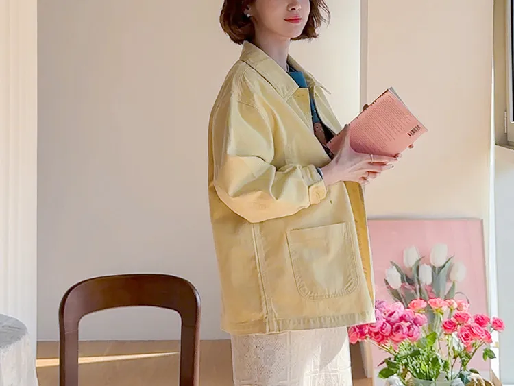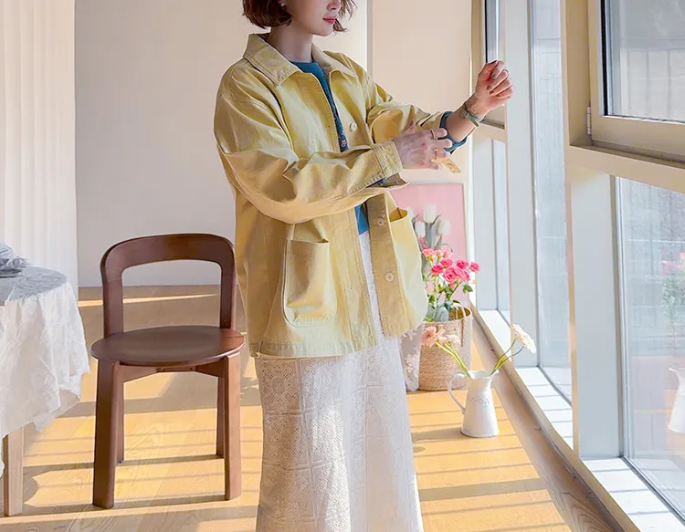 【寬鬆版型,休閒口袋貼片設計】【柔和的黃色,帶來明亮心情】【寬鬆長度,遮住臀部,穿著舒適】【可作襯衫或外套的百搭單品】