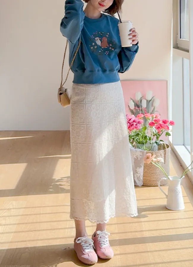 柔美氣息波浪裙擺精緻蕾絲花朵H剪裁中長裙