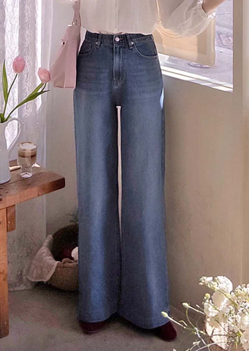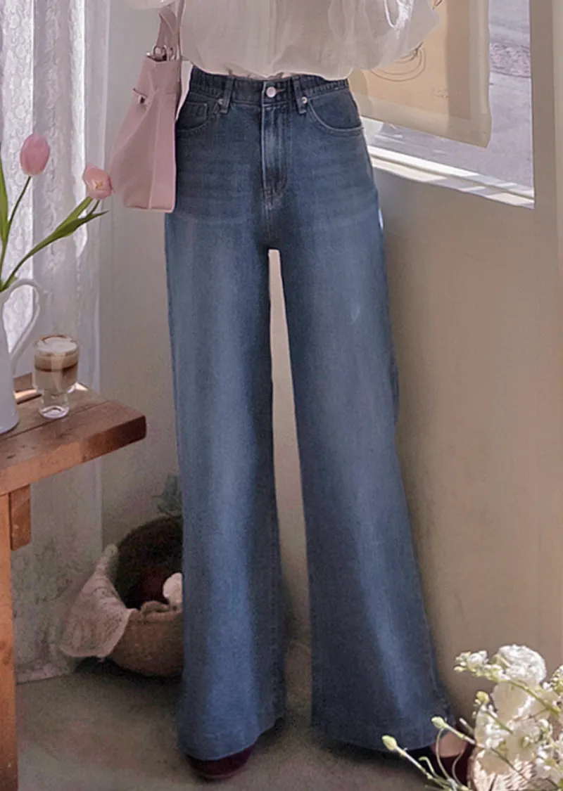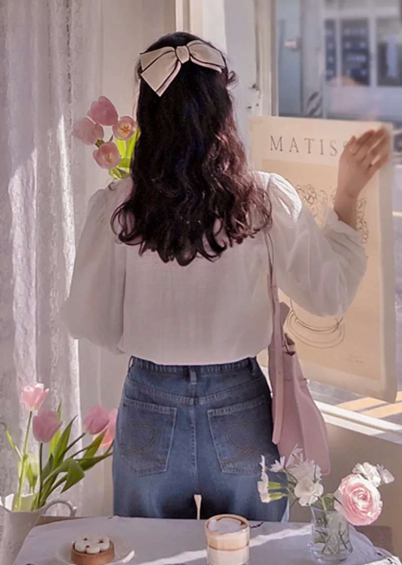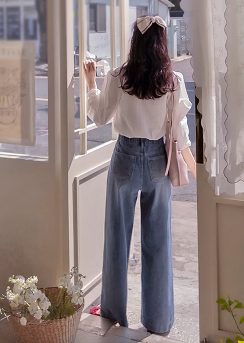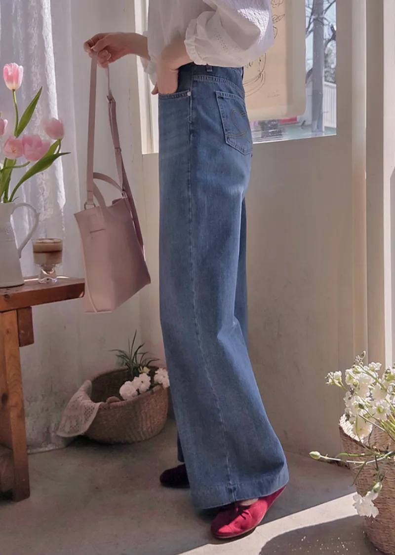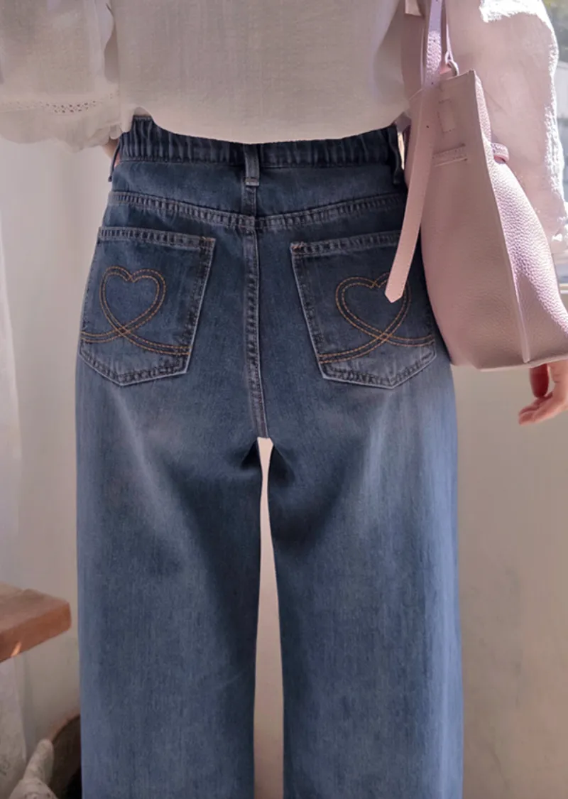 點綴後口袋愛心線條刺繡修身半寬版型牛仔褲