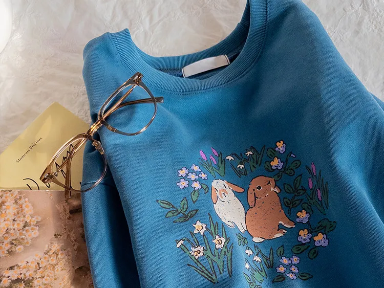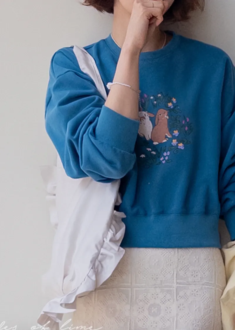 可愛花朵兔子印花半剪裁長度穿搭上衣