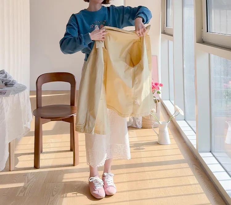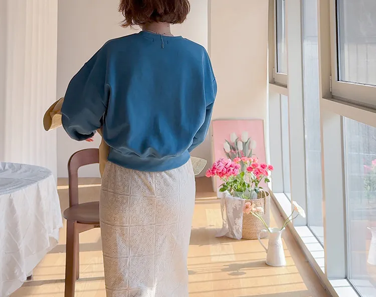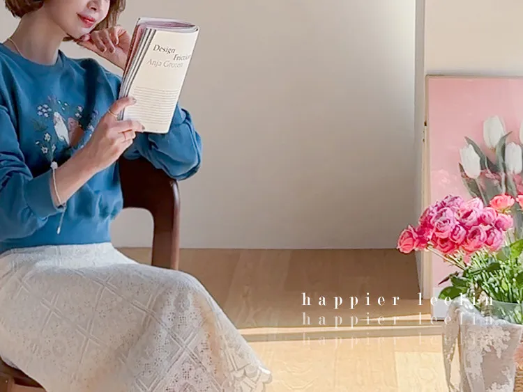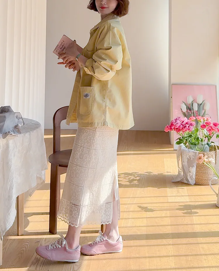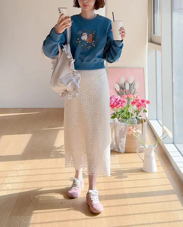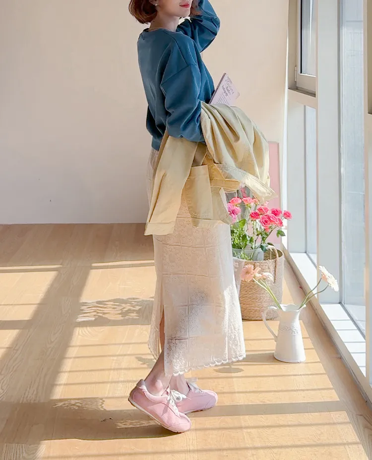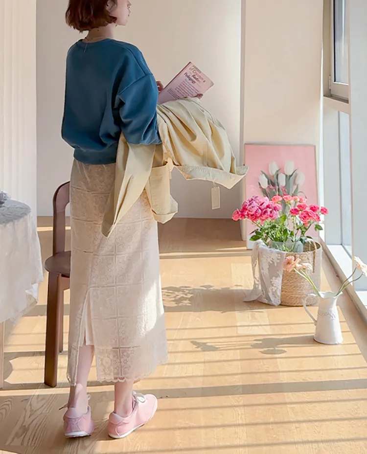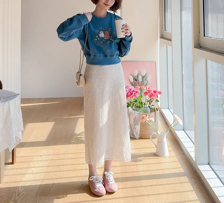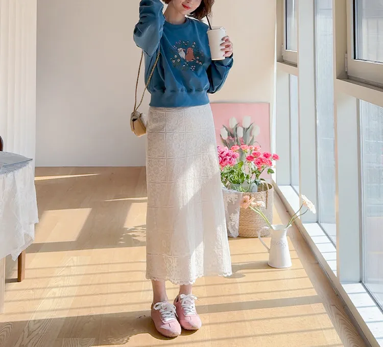 柔美氣息波浪裙擺精緻蕾絲花朵H剪裁中長裙
