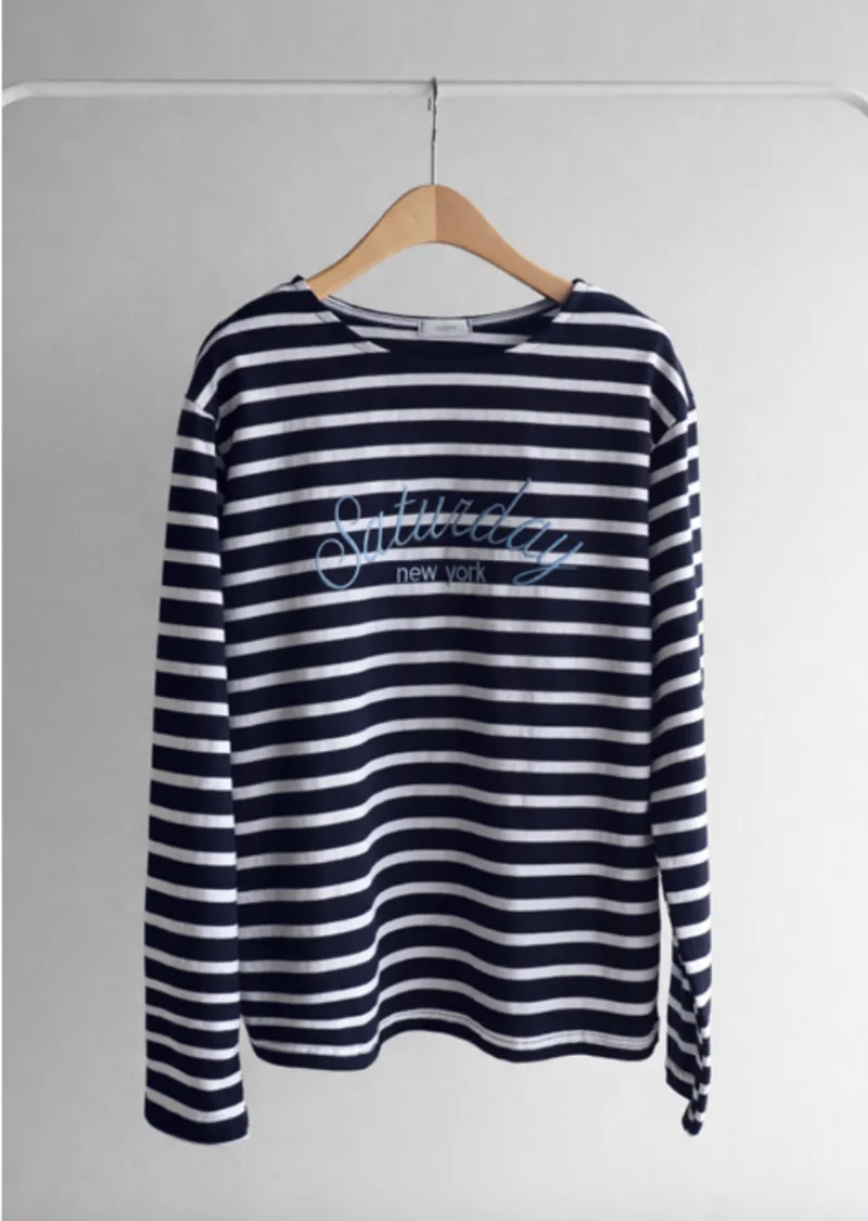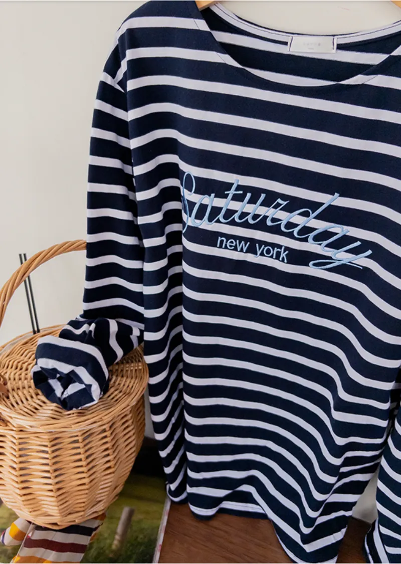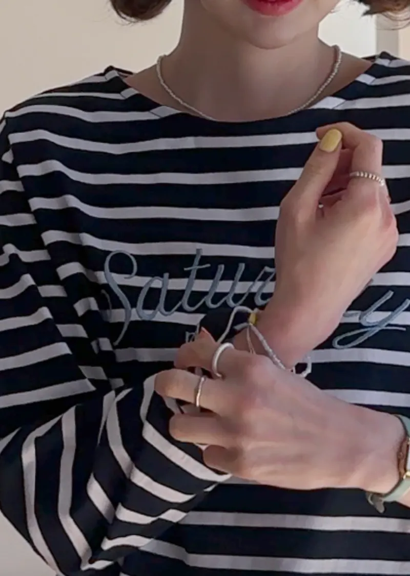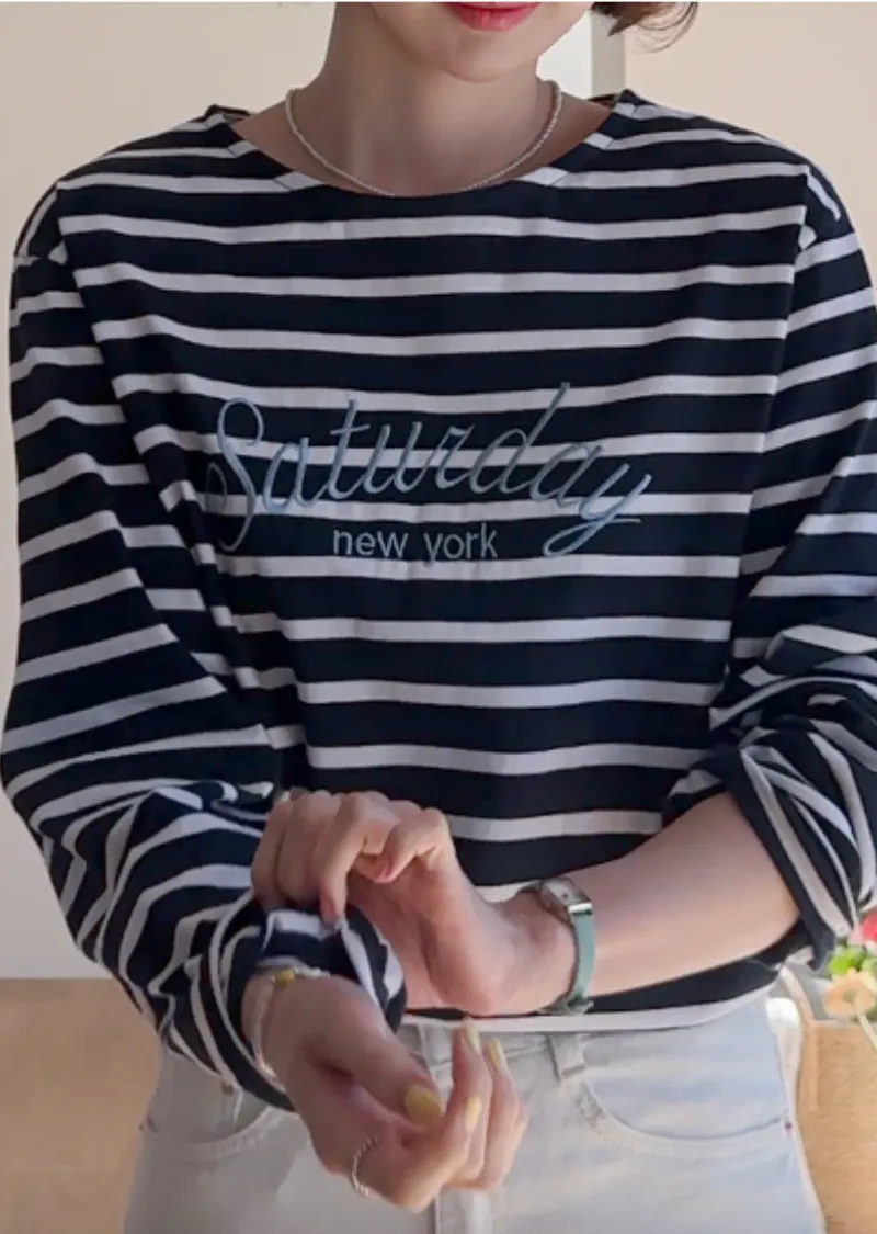 點綴精緻字母刺繡圓領基本款條紋上衣