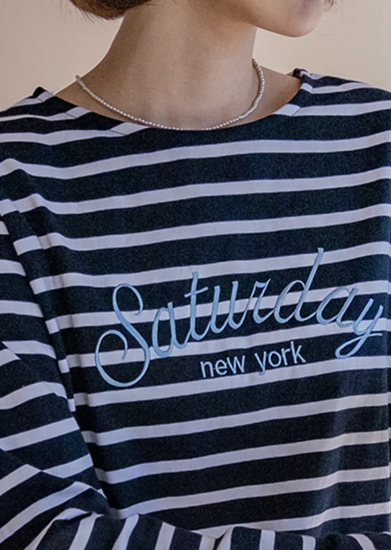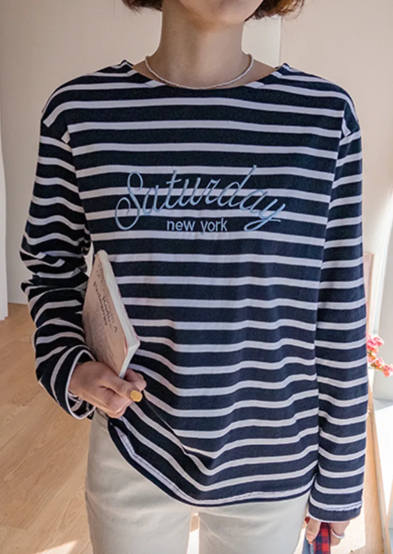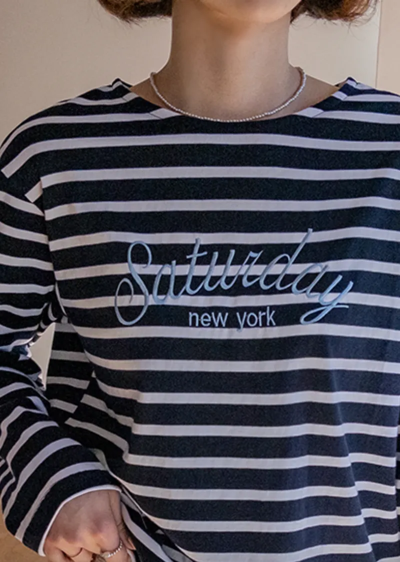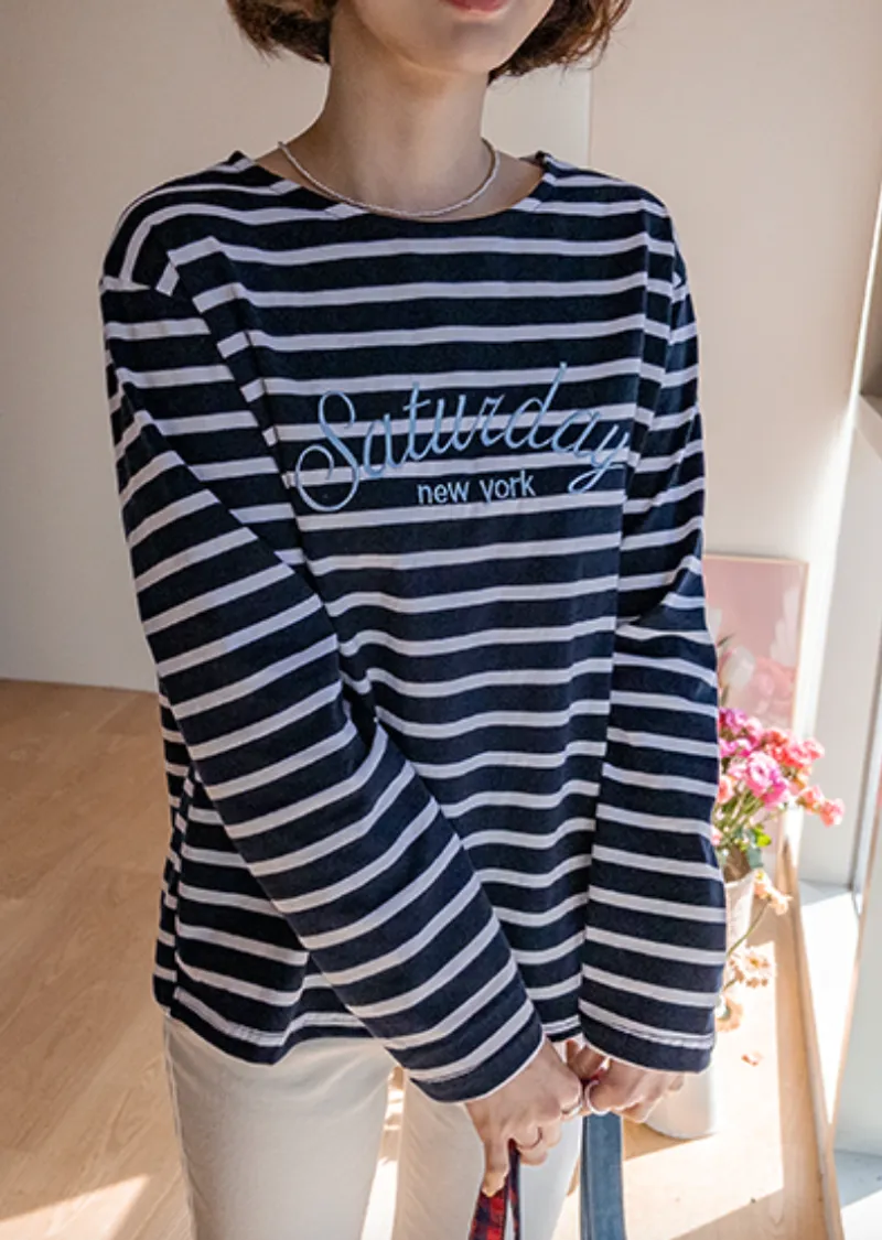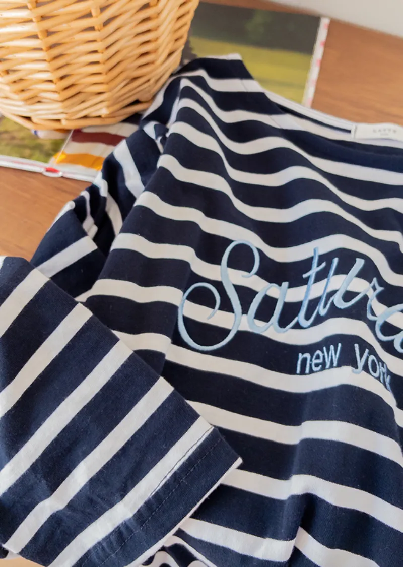 點綴精緻字母刺繡圓領基本款條紋上衣