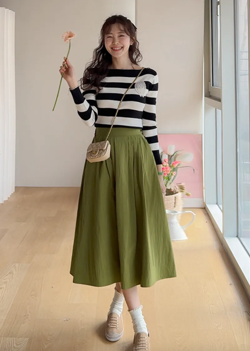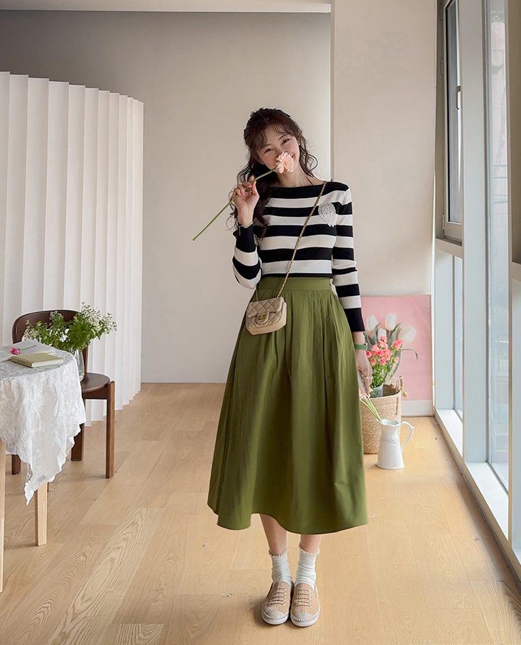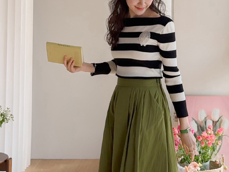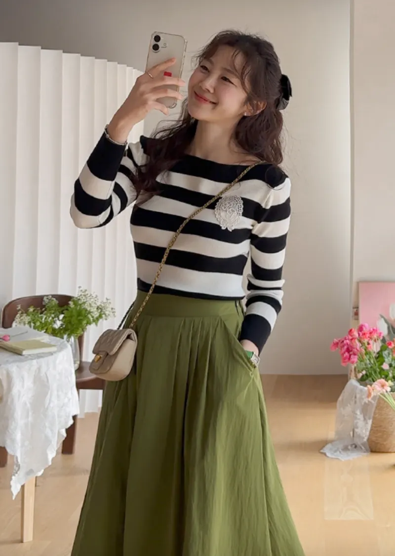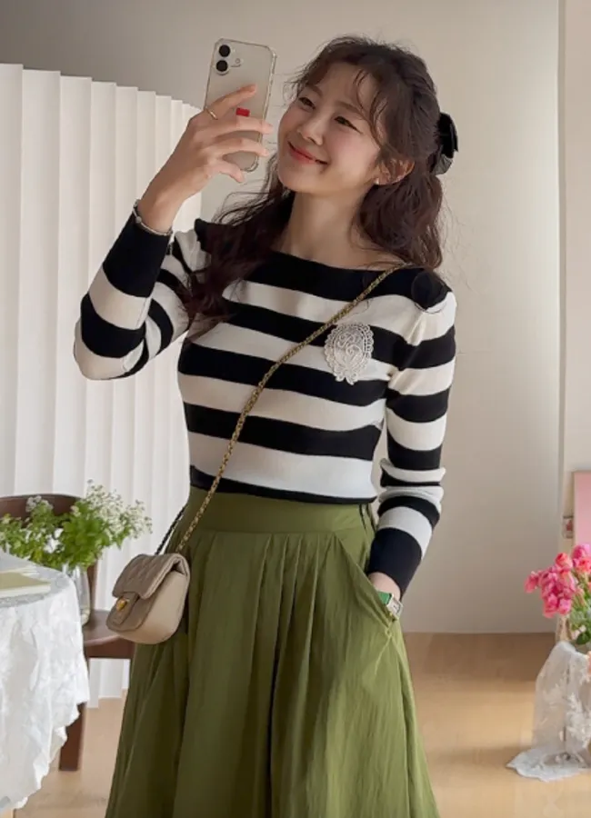柔美領口線條點綴胸前蕾絲刺繡條紋針織上衣