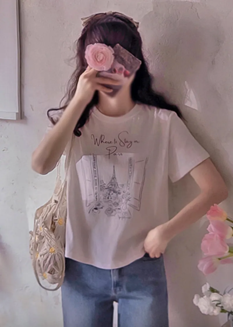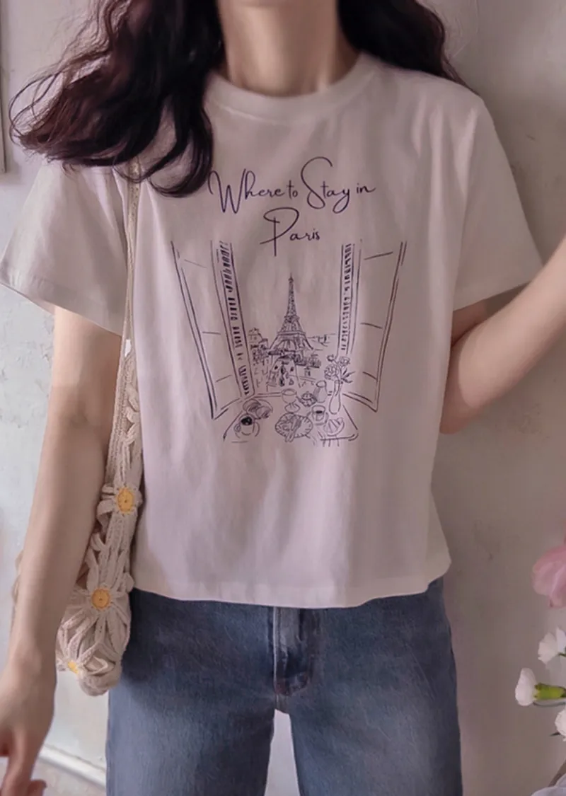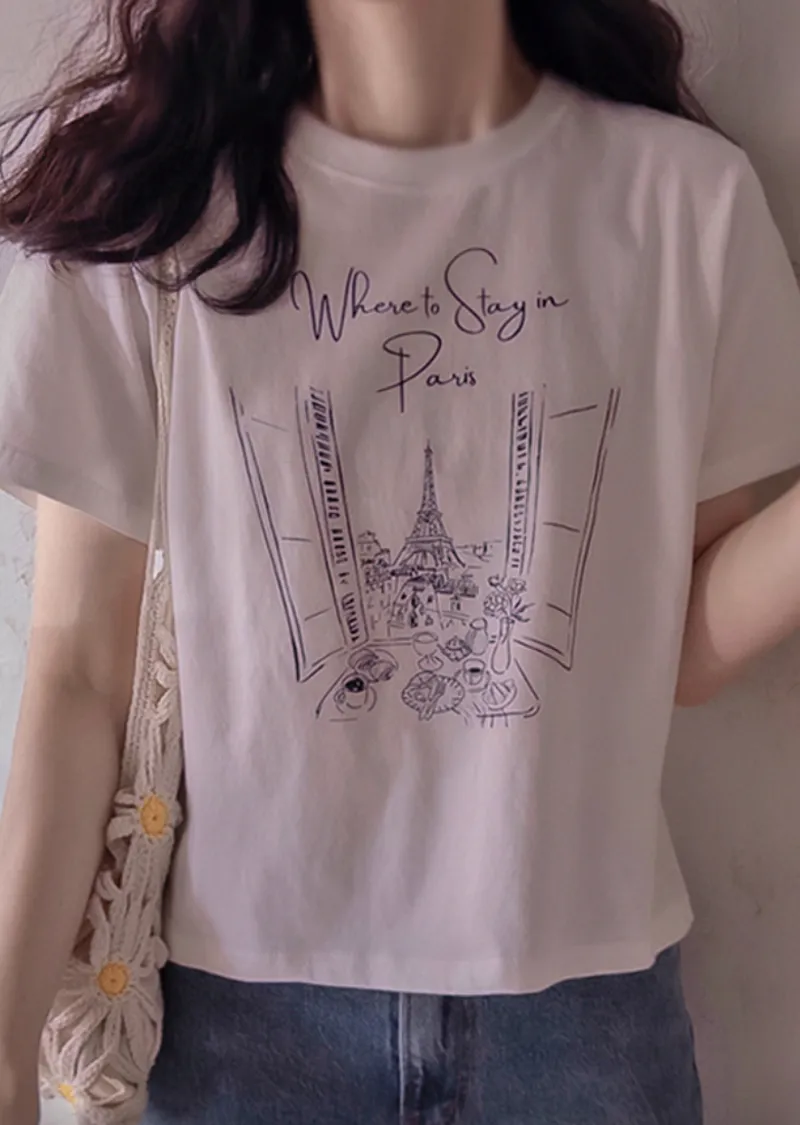 優雅氛圍手繪巴黎景色柔軟絲質短袖上衣