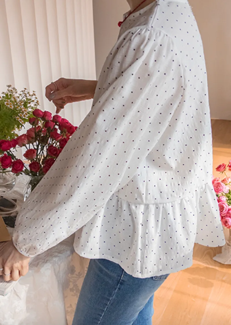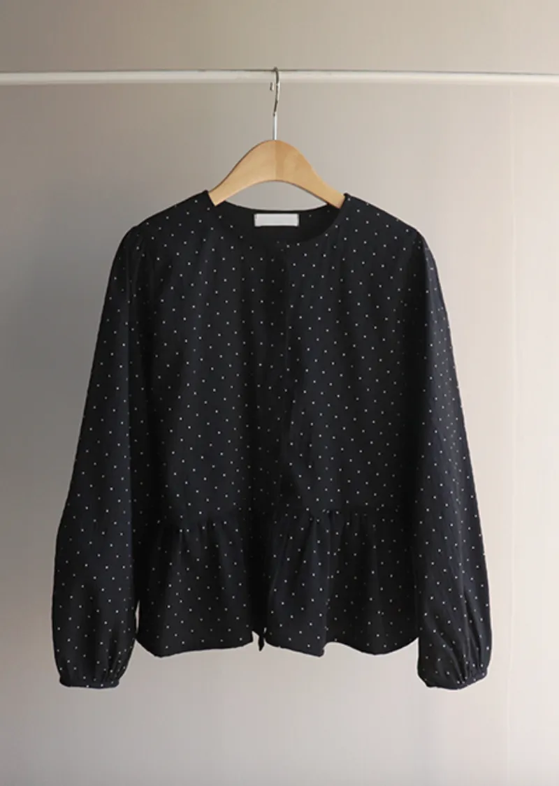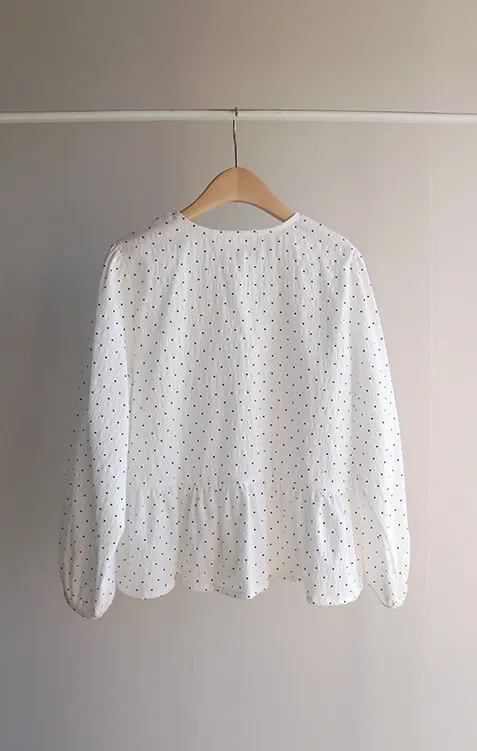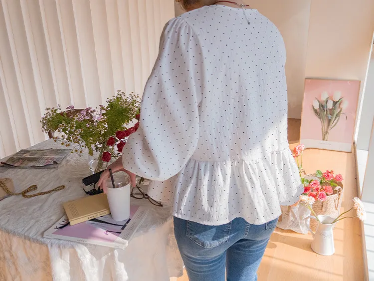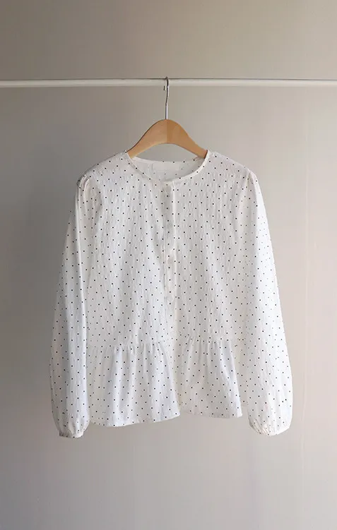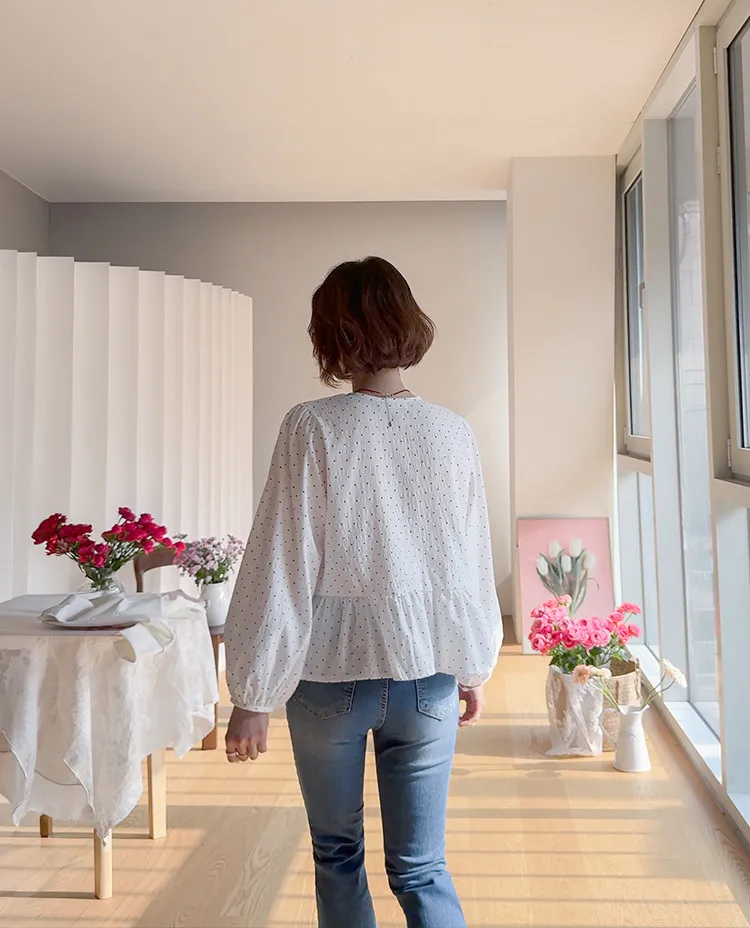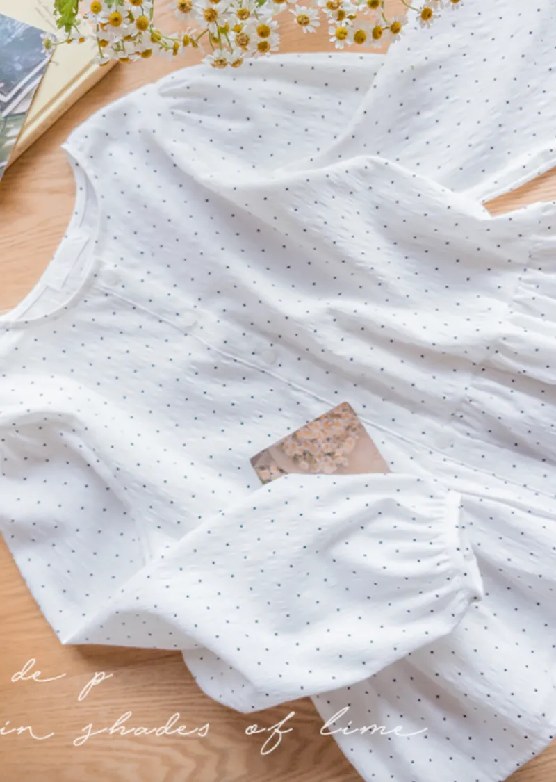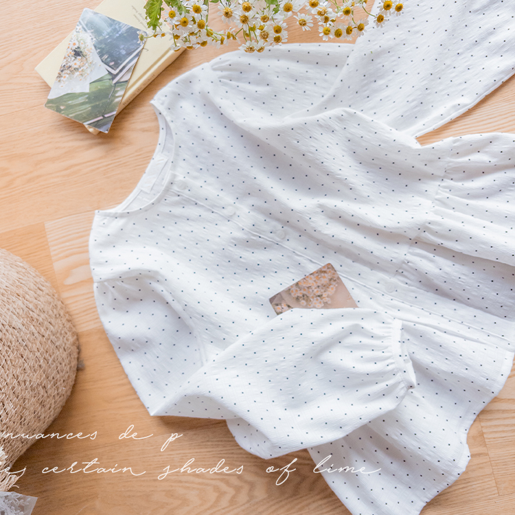 【一款飾有迷人情調圓點點圖案的上衣】【泡泡袖設計,勾勒出優雅的輪廓】【A字版型和傘擺下擺自然修飾身材】【可單穿或疊穿的百搭單品】
