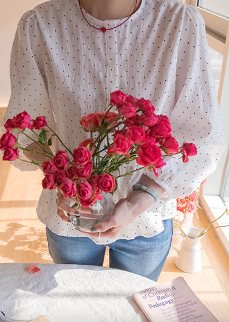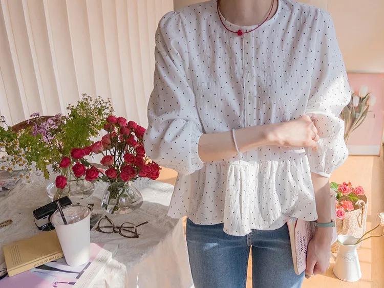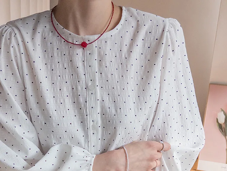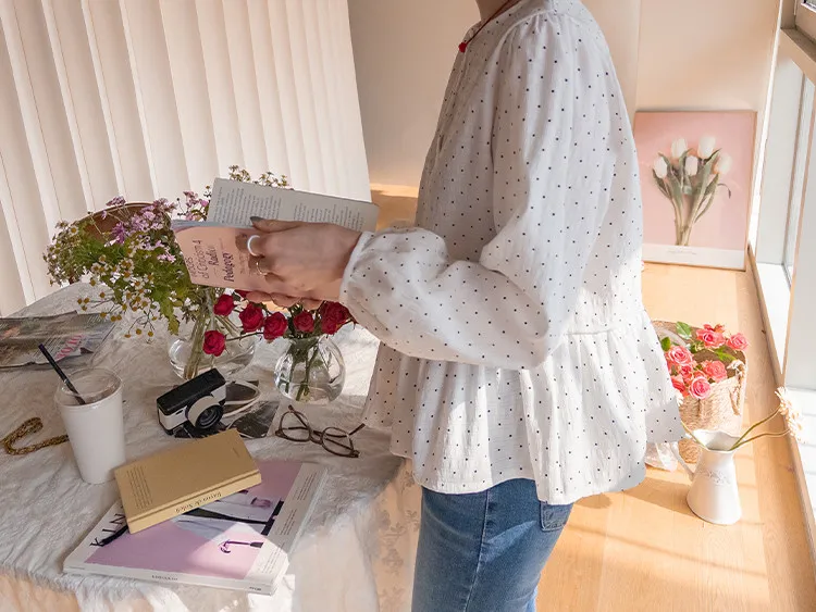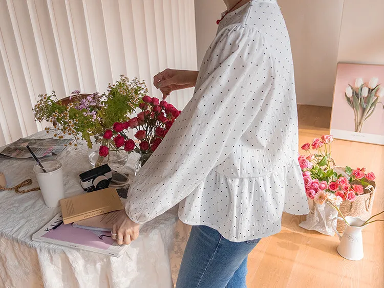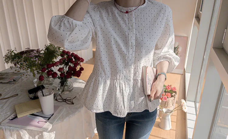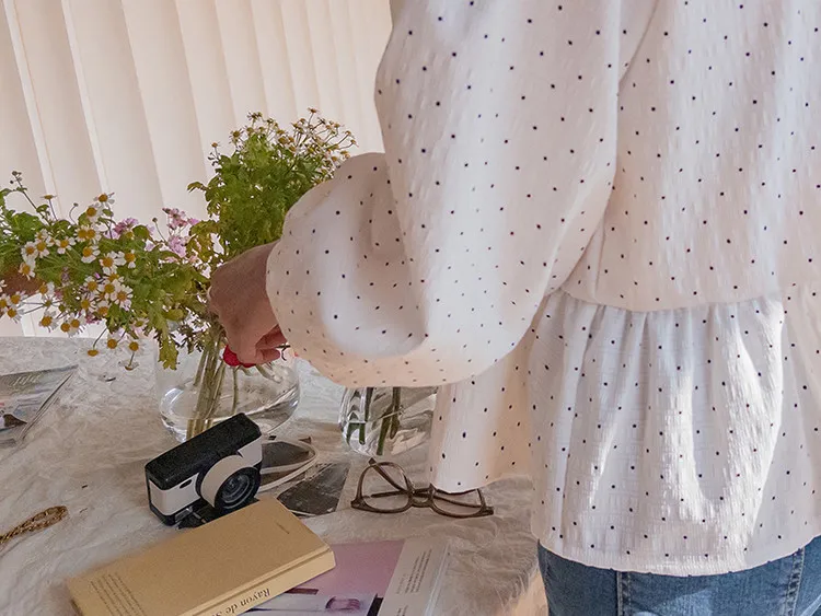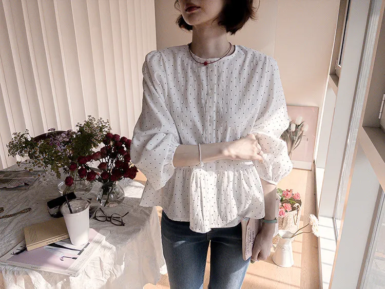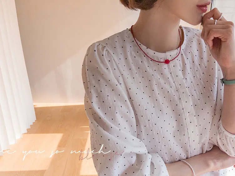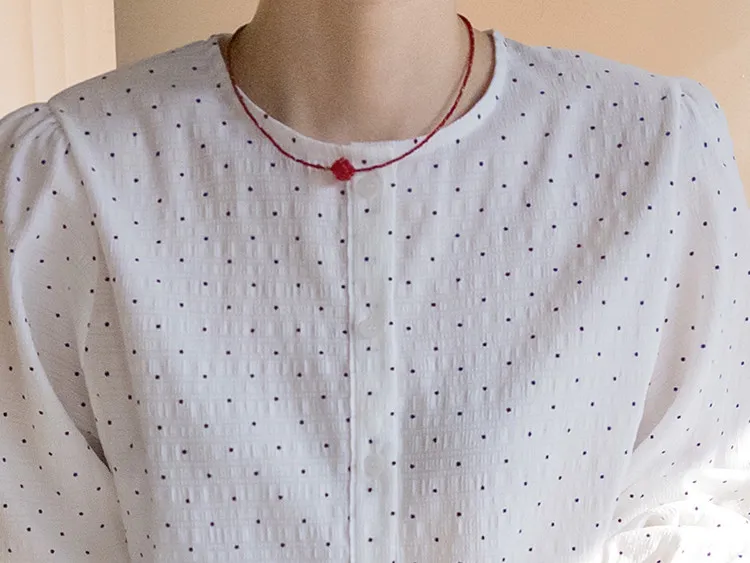 【一款飾有迷人情調圓點點圖案的上衣】【泡泡袖設計,勾勒出優雅的輪廓】【A字版型和傘擺下擺自然修飾身材】【可單穿或疊穿的百搭單品】