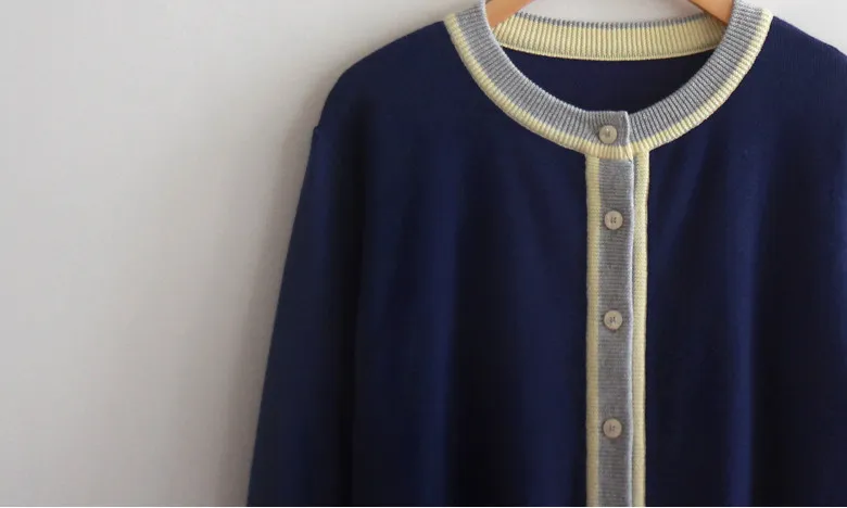 獨特領口鈕扣帶配色設計袖口層疊針織開衫