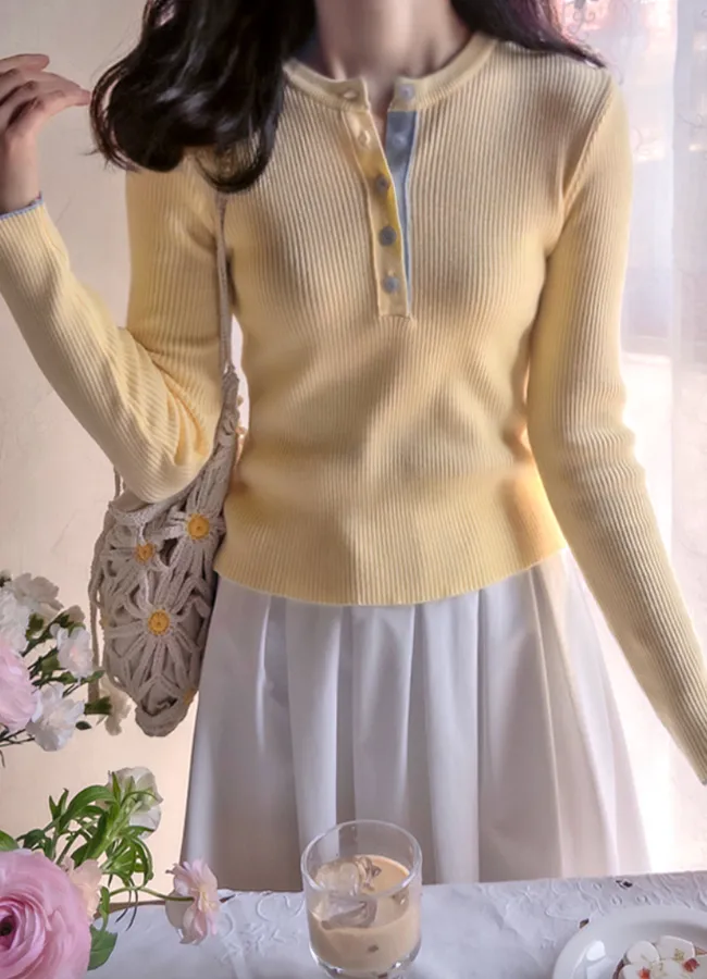 柔軟舒適配色鈕扣襯邊羅紋修身針織上衣