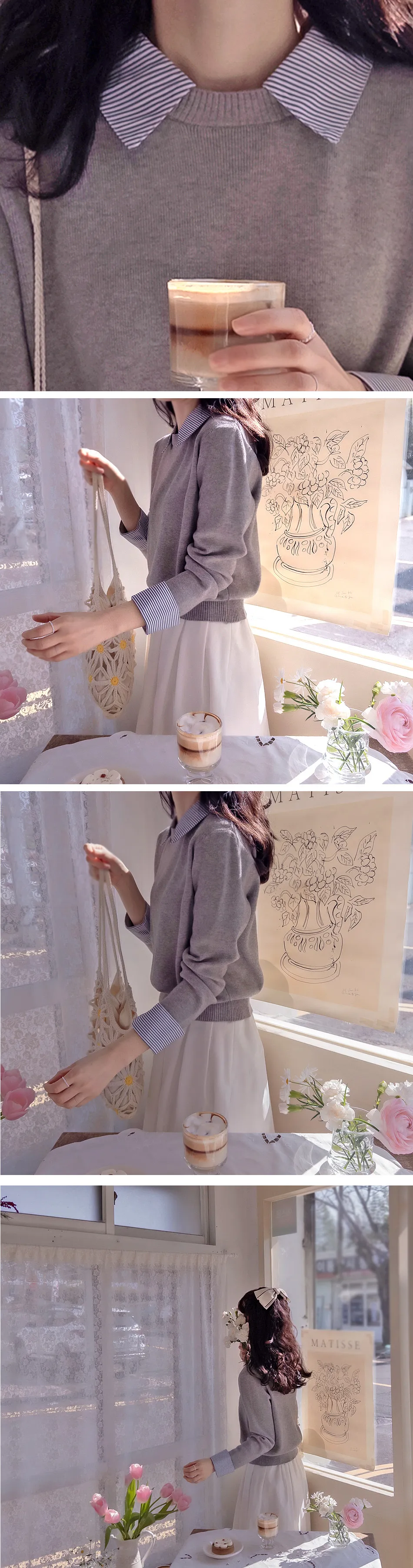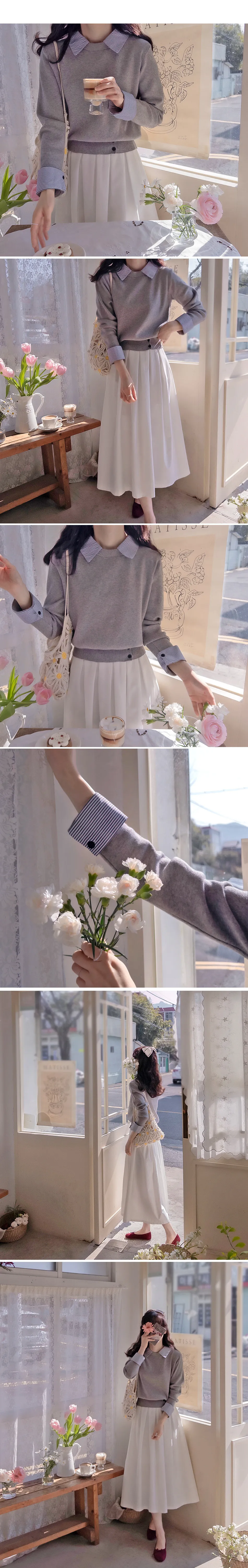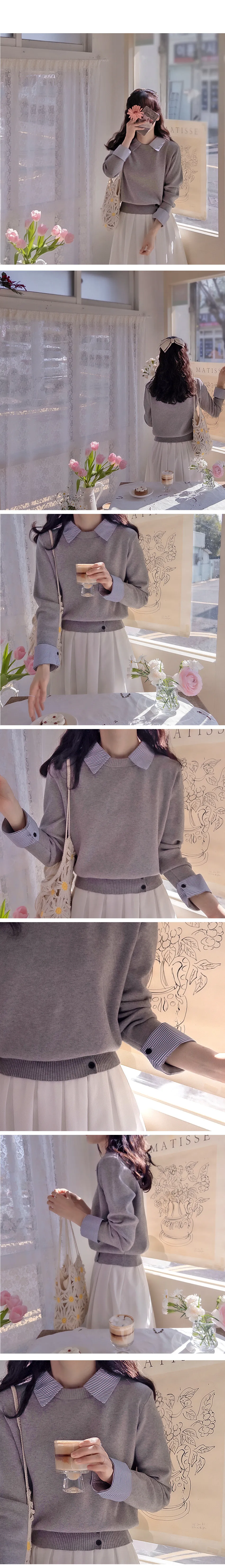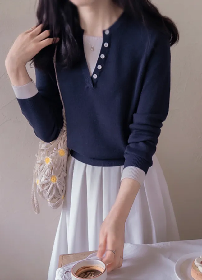領口層疊配色點綴鈕扣柔軟舒適針織上衣