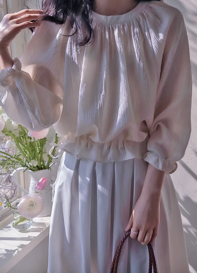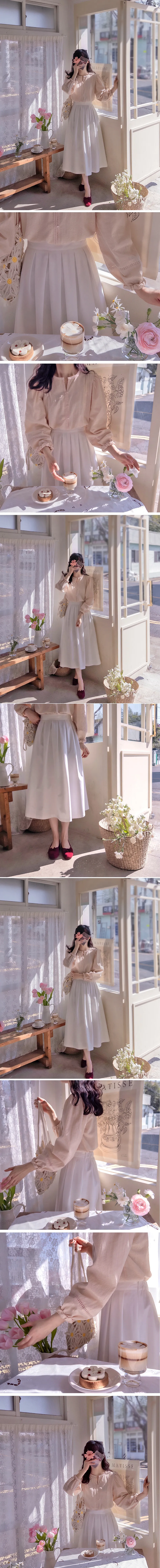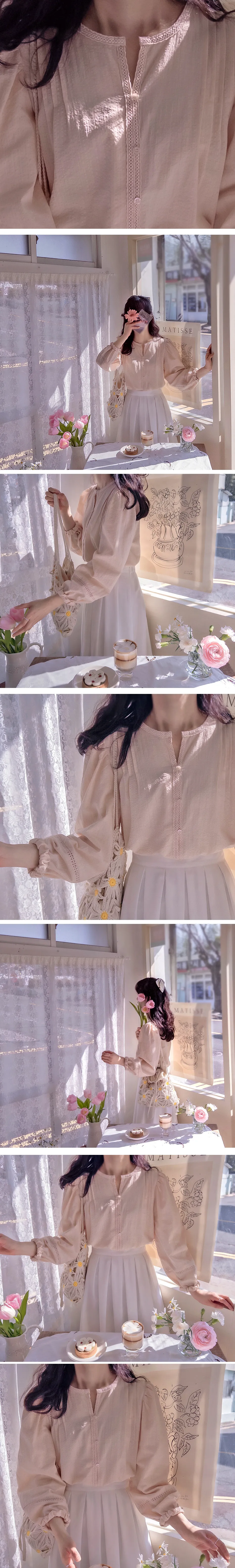 輕盈飄逸波浪領口及下擺柔美排扣上衣 杏粉色穿搭照