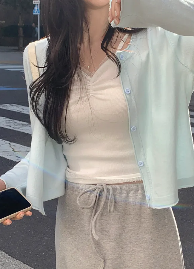 柔美氣息點綴胸前褶皺領口蕾絲摺邊無袖上衣