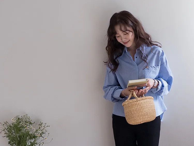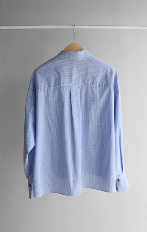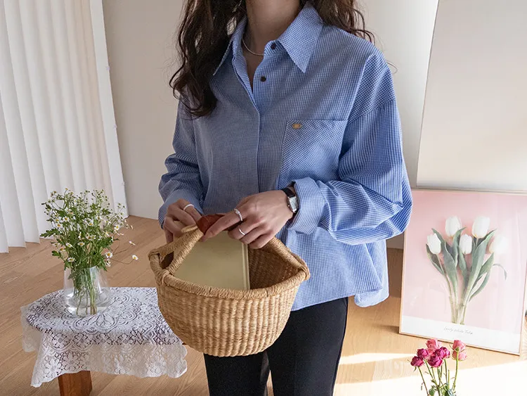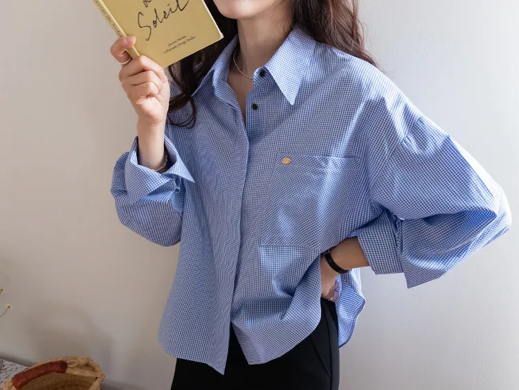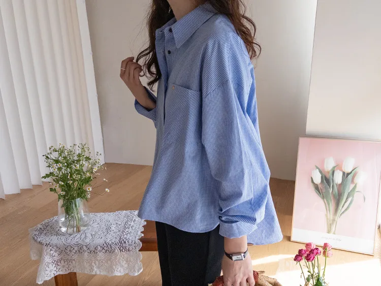 休閒俐落胸前口袋隱藏鈕扣格紋排扣上衣