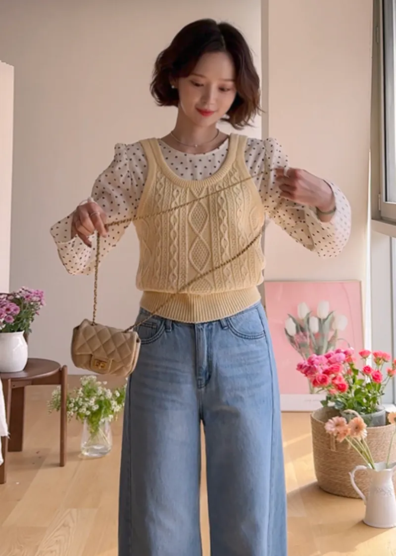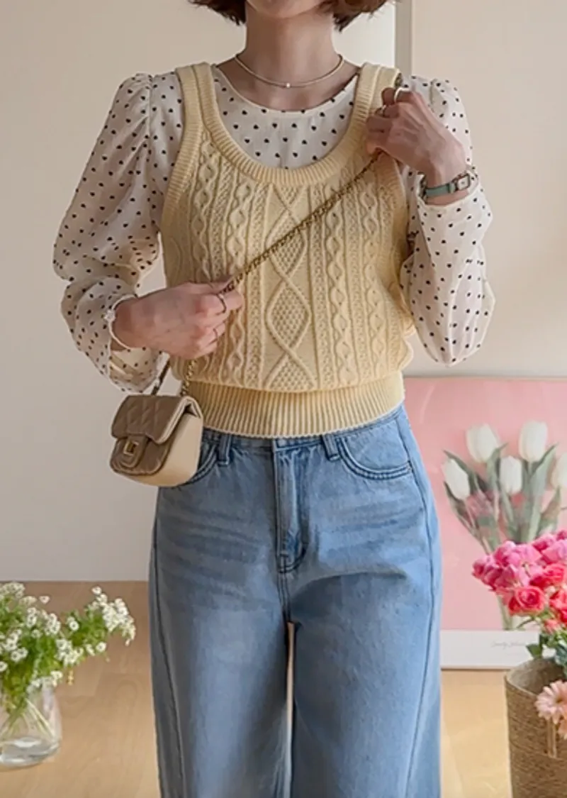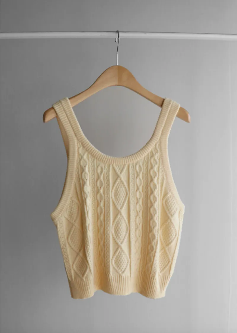 【一款針織背心,飾有扭紋針織紋理】【柔和的黃色點綴,增添一抹亮色】【修身剪裁,自然貼合身形】【日常百搭單品,適合疊穿】