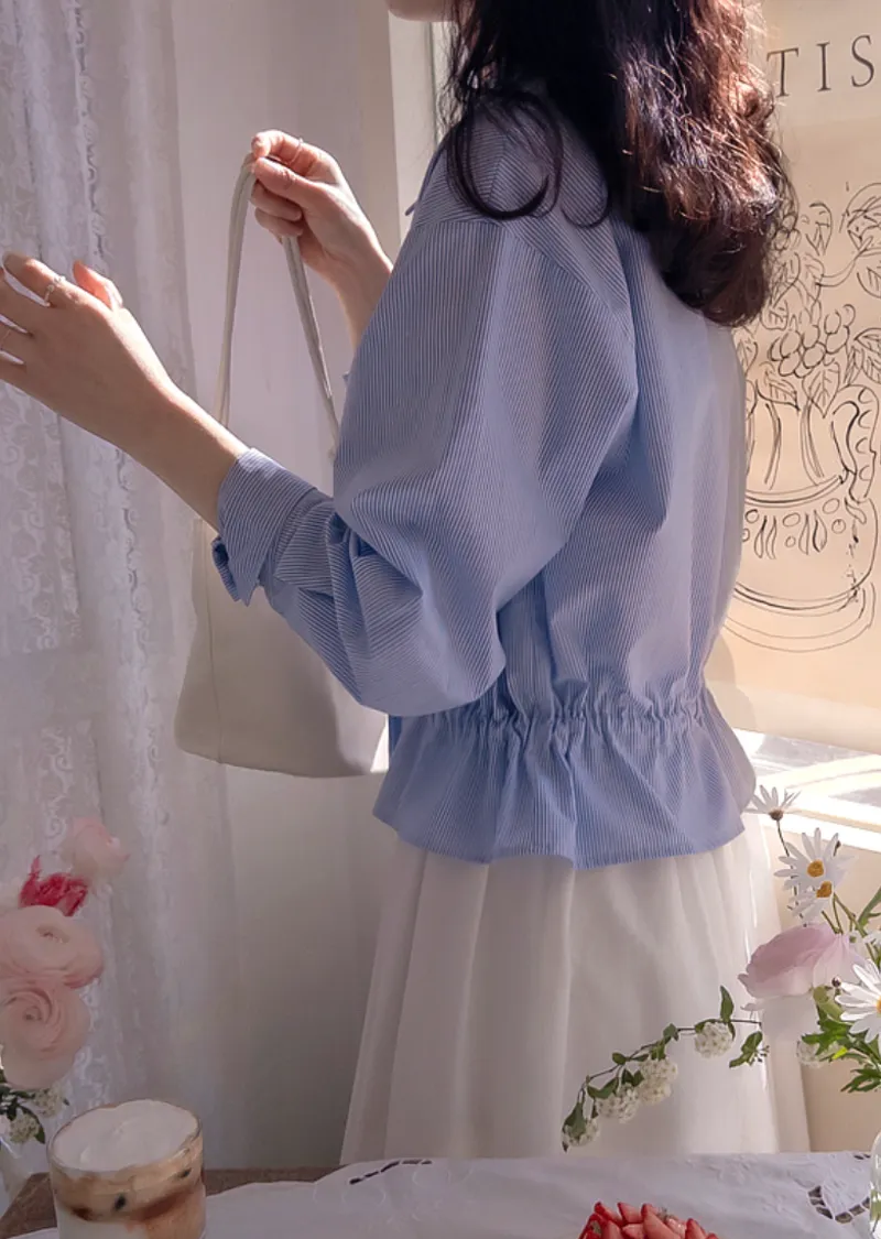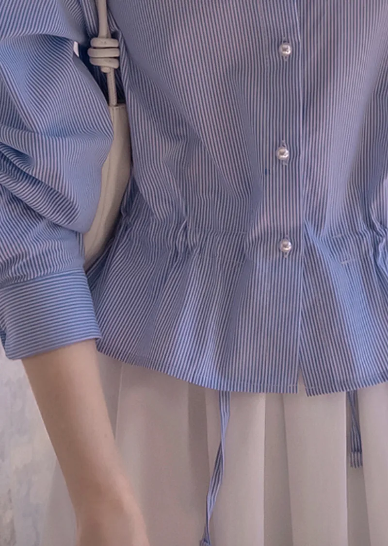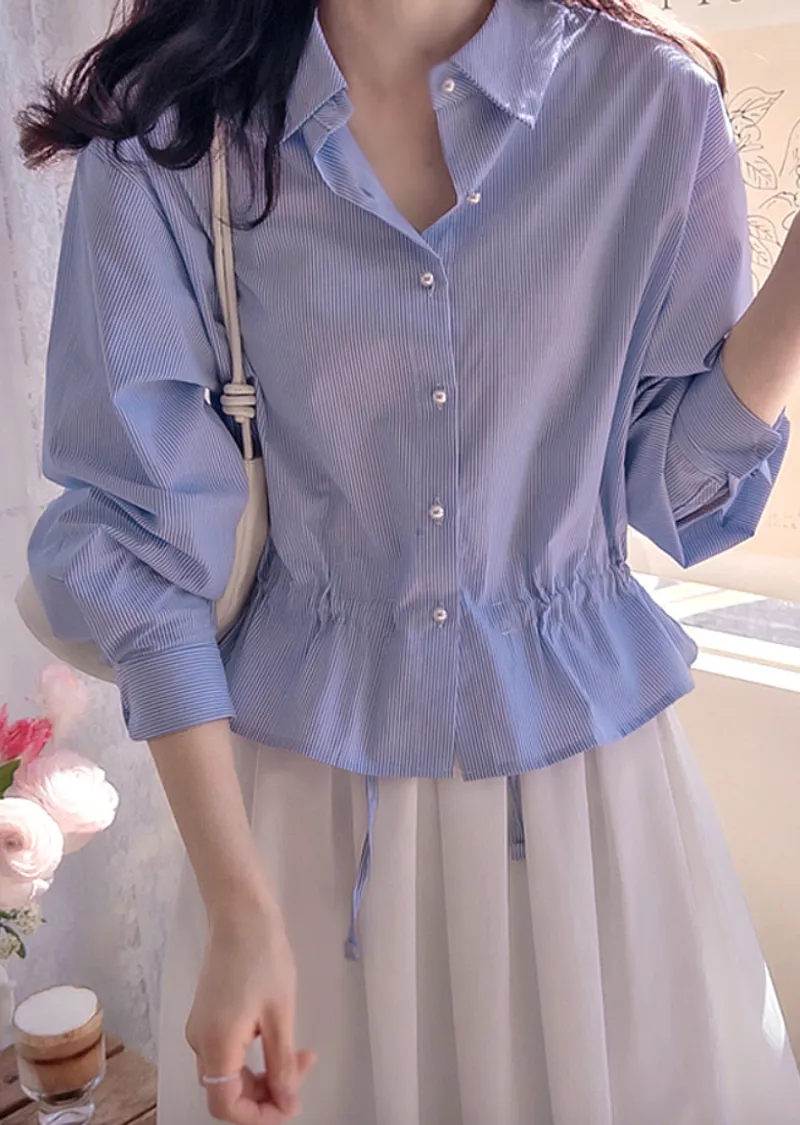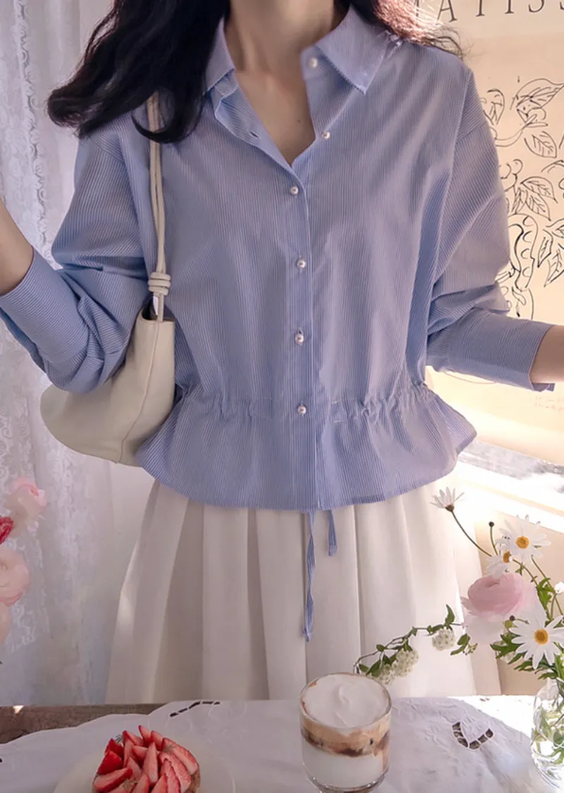 優雅氣質珍珠鈕扣綁帶收腰柔和條紋排扣上衣