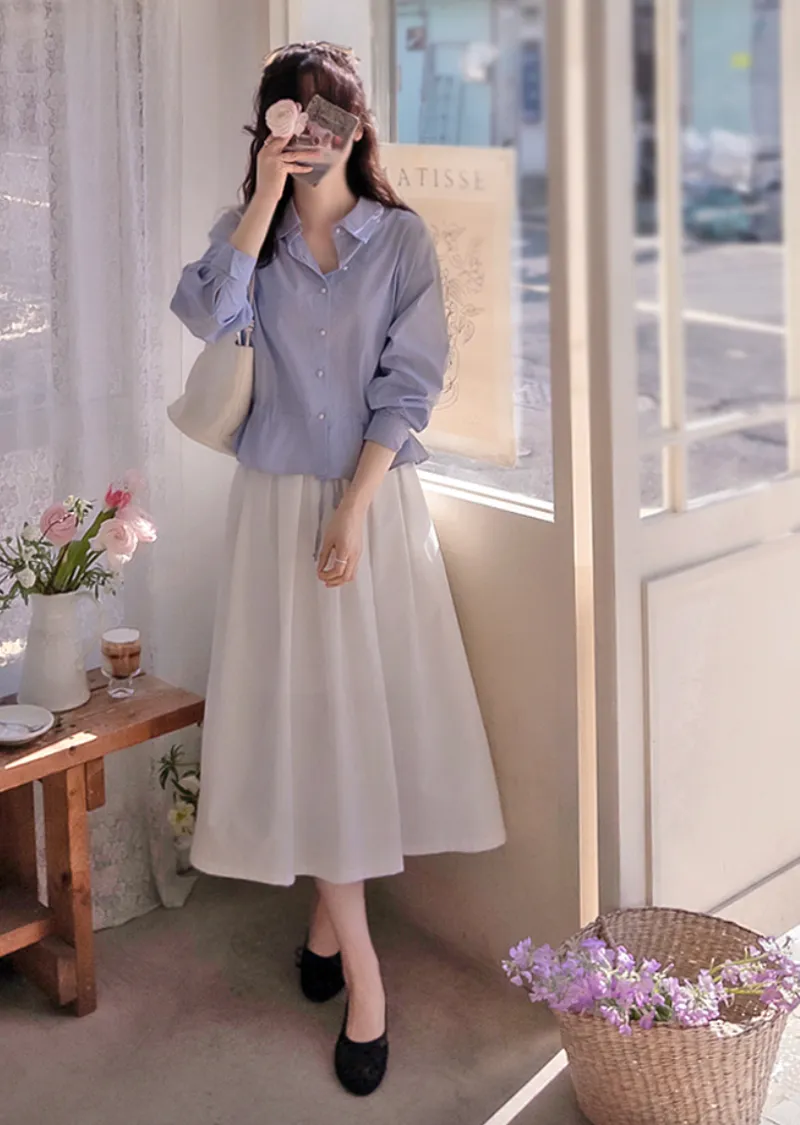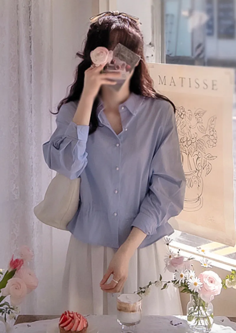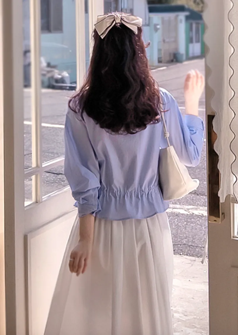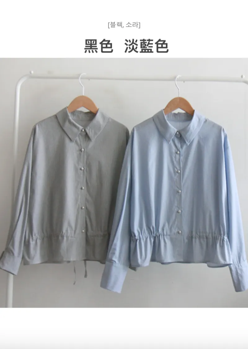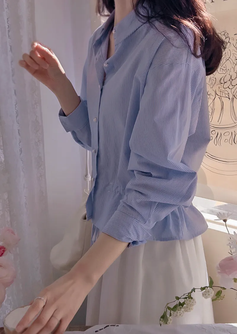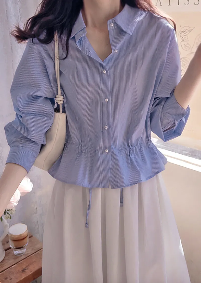 【調整內側腰綁帶,可營造褶皺效果,非常漂亮】【優質紗線】【彈性舒適的上衣】【精緻的條紋排扣上衣】【捲起袖子也很好看】【從現在開始,一年四季都可以穿的上衣】【珍珠紐扣,盡顯優雅氣質】