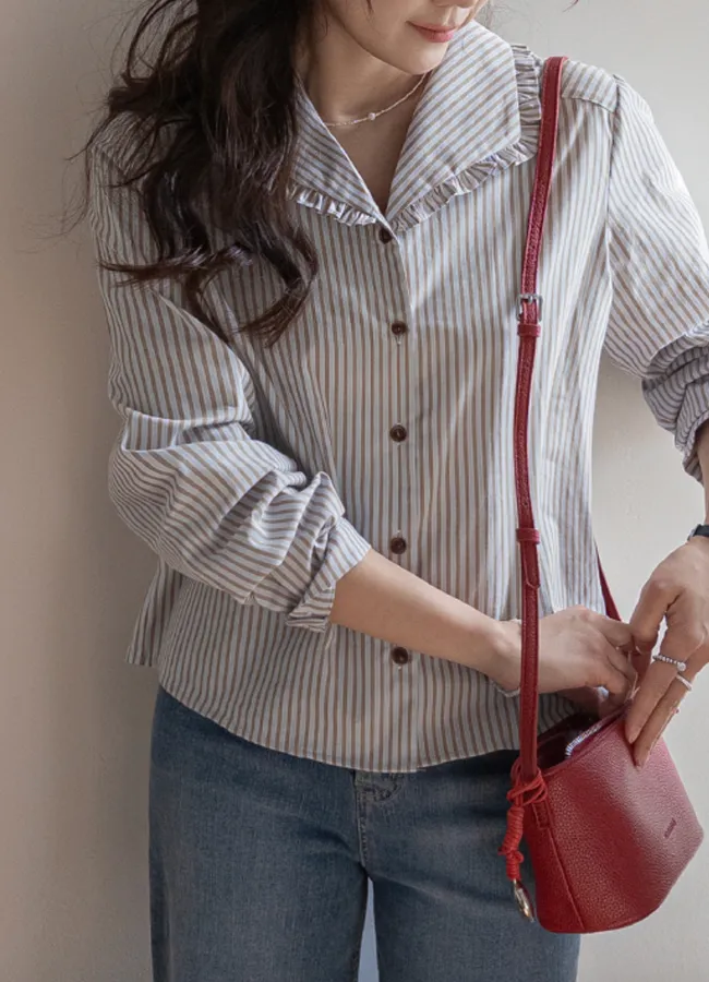 柔美氣質點綴領口摺邊排扣上衣 純色款/條紋款