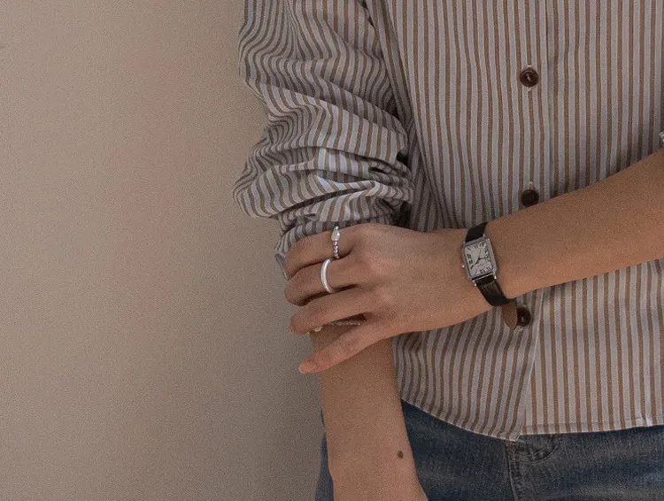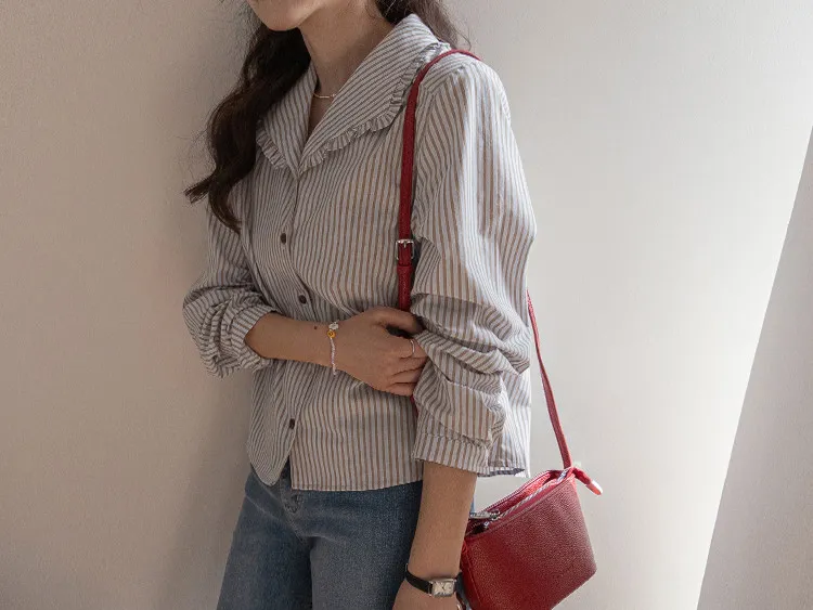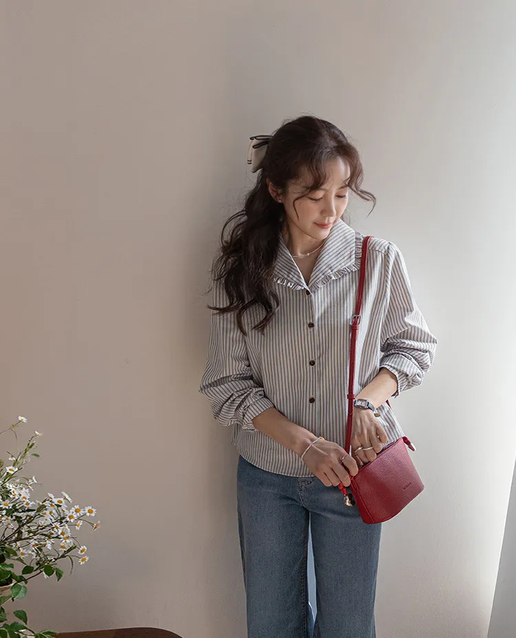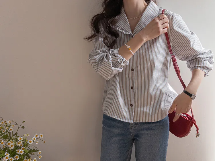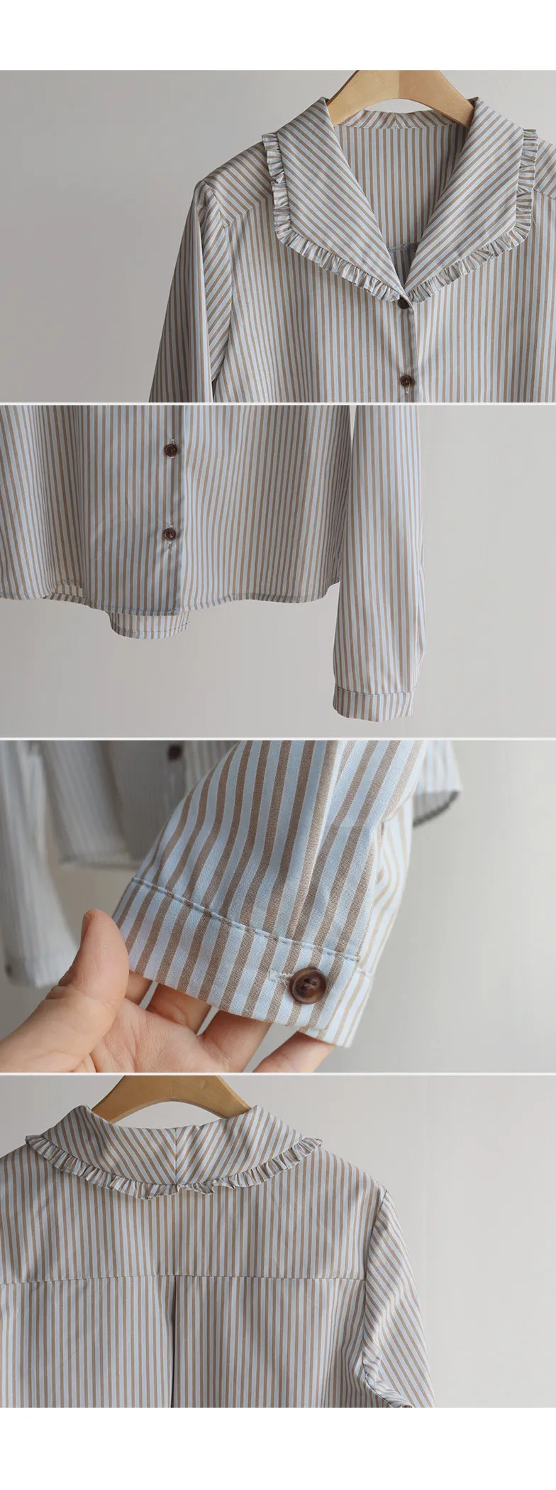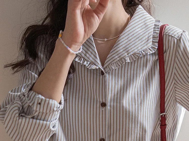 柔美氣質點綴領口摺邊排扣上衣 純色款/條紋款