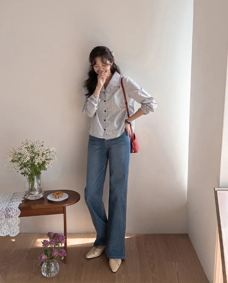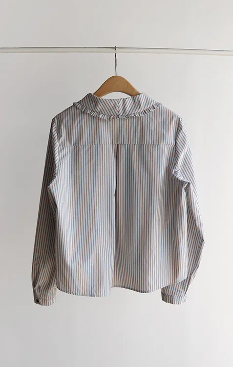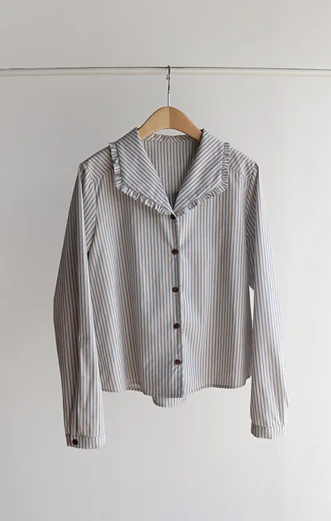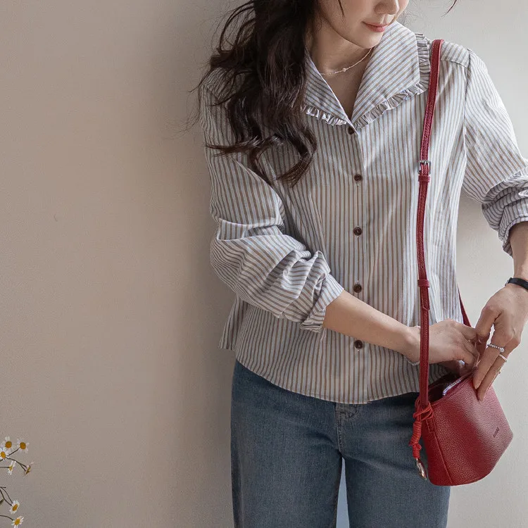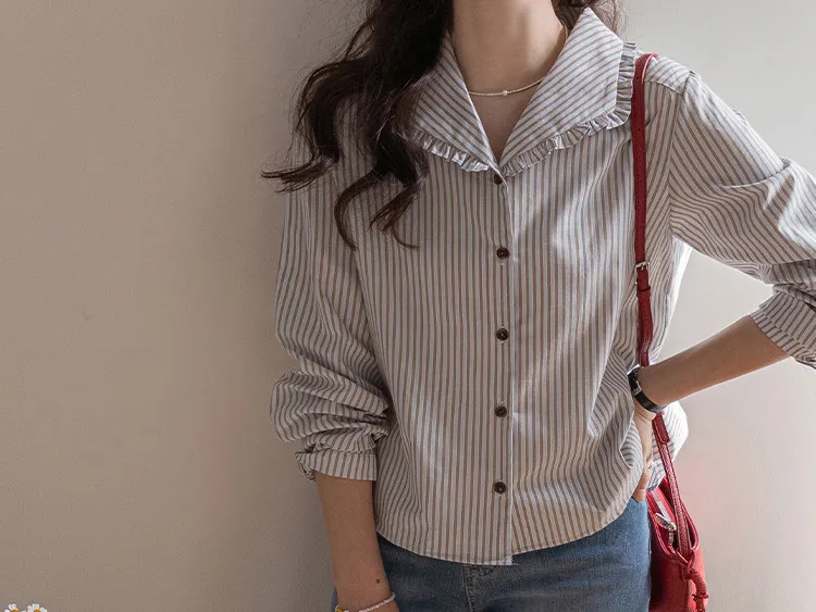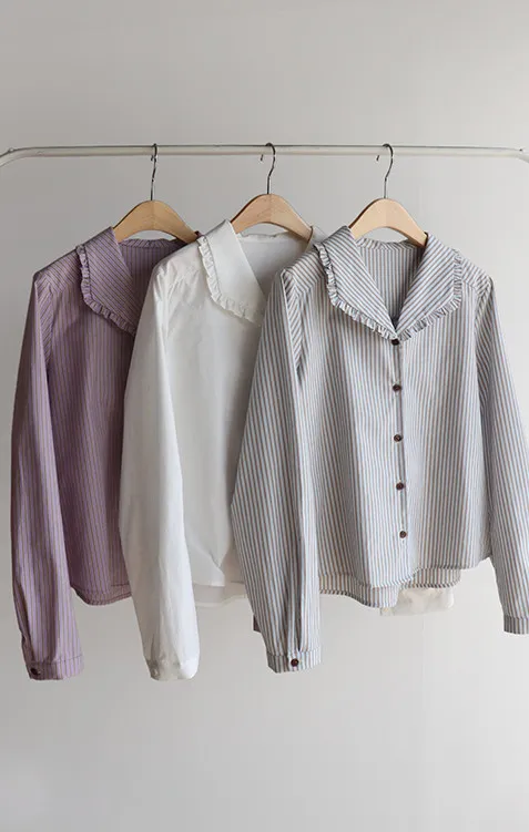 【寬大的領口設計讓臉型看起來更小巧】【領口飾有可愛的荷葉邊】【100%純棉面料,穿著舒適】【象牙白(純色)和條紋配色,滿足不同喜好】