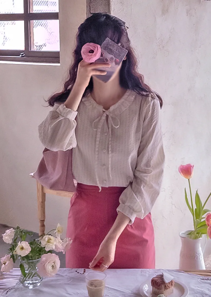 ][領口設計,營造甜美氛圍][彈性舒適的布料][柔軟抗皺布料,減少褶皺][領口繫帶,打造優雅氣質][推薦春季穿著的精緻上衣‘][柔和的粉彩色系]