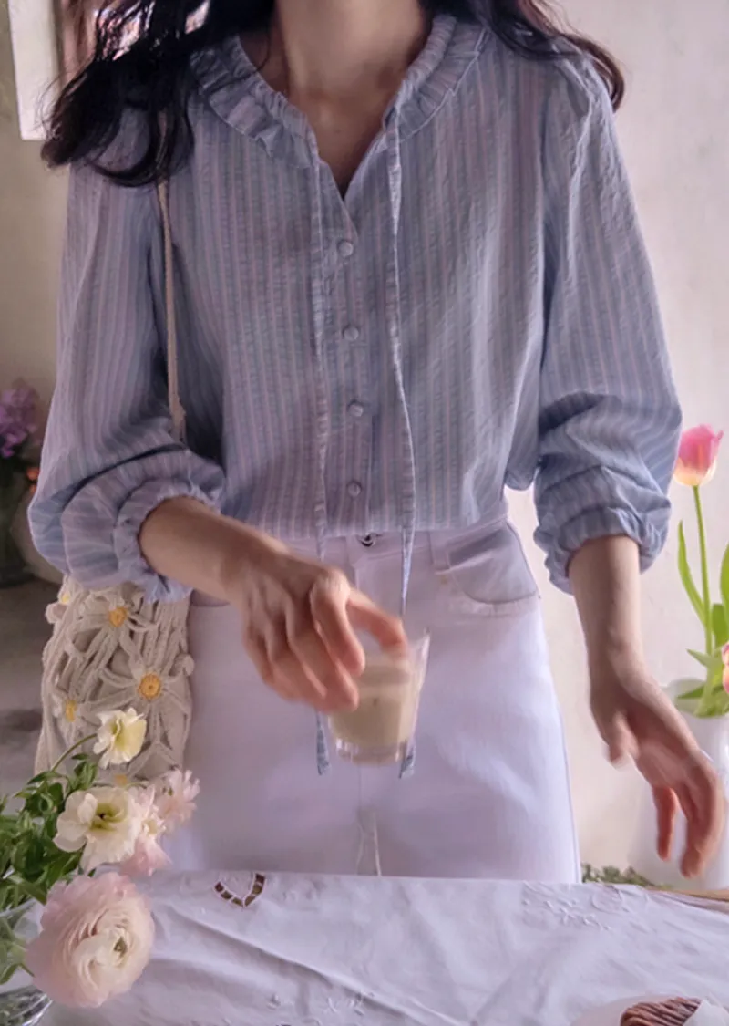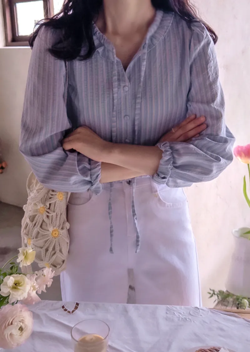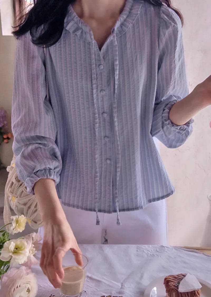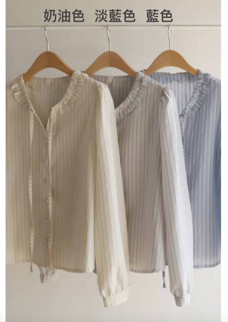 柔和色系條紋摺邊領口綁帶排扣上衣