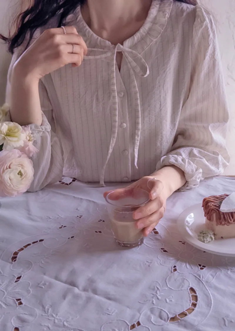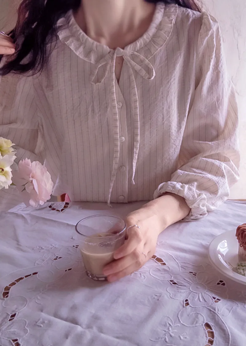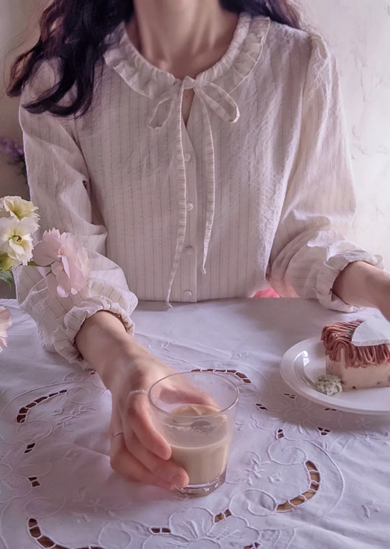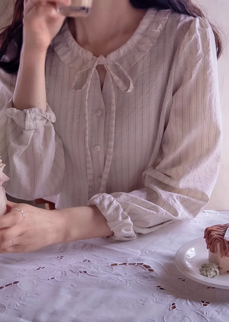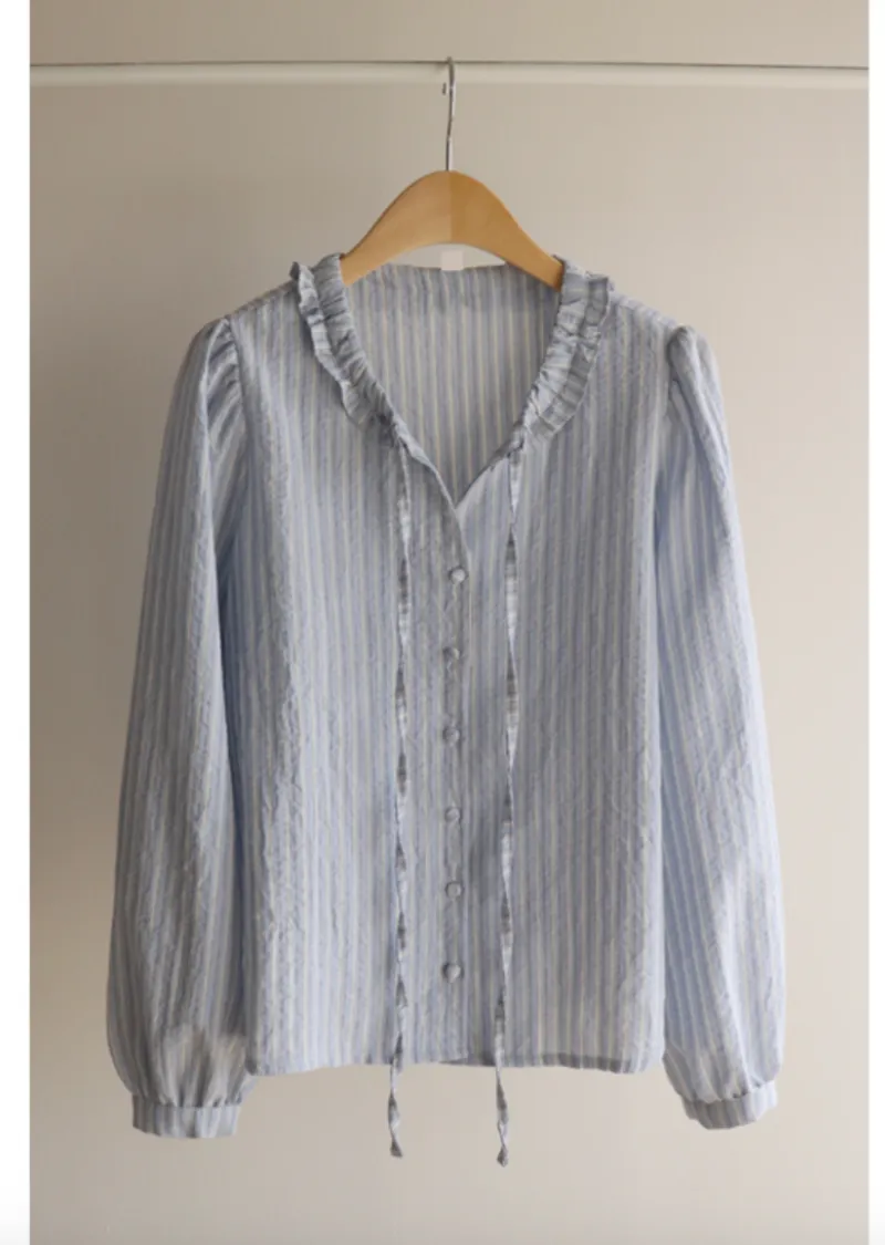 柔和色系條紋摺邊領口綁帶排扣上衣