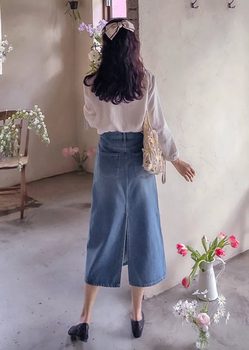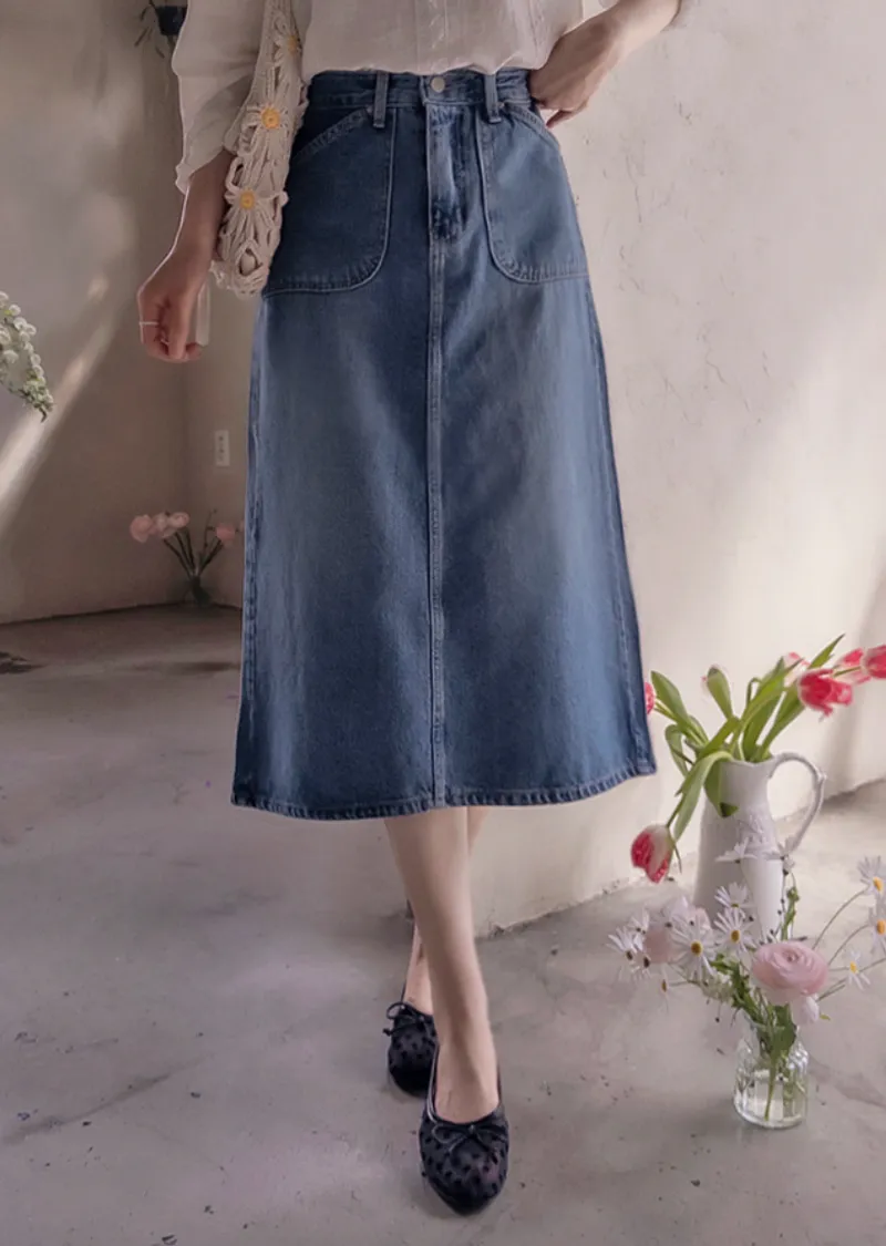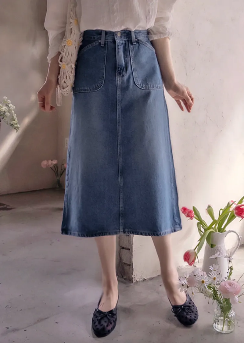 舒適修身剪裁口袋線條後開衩牛仔中長裙