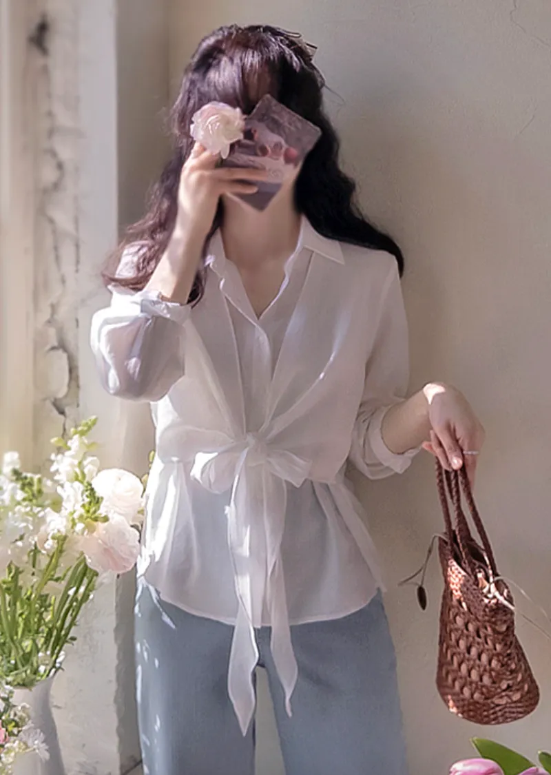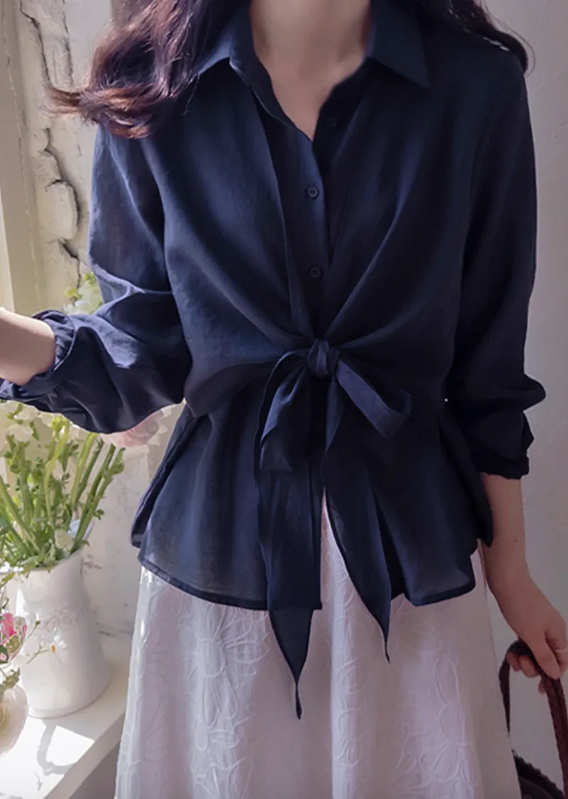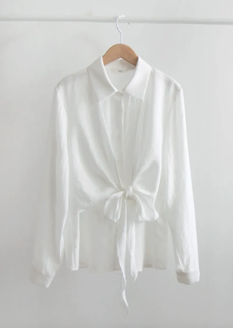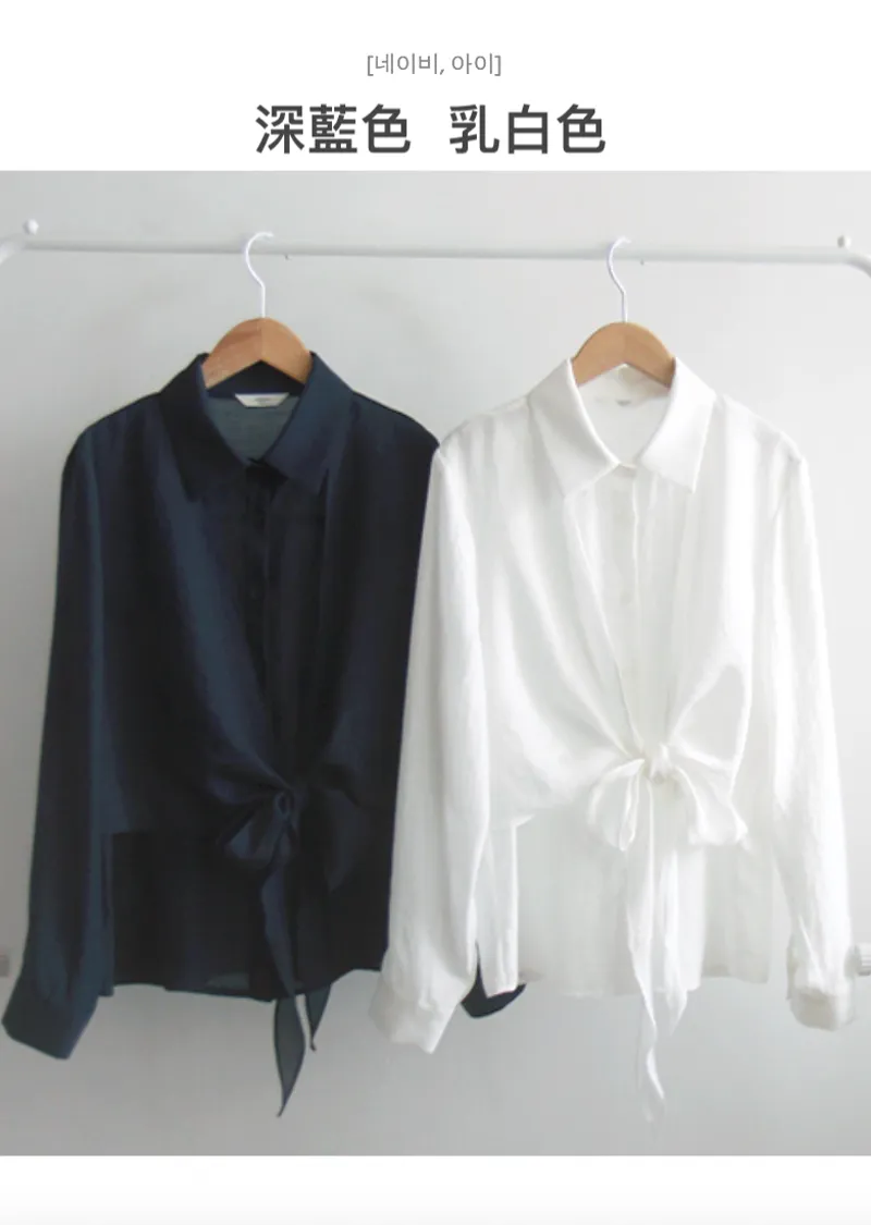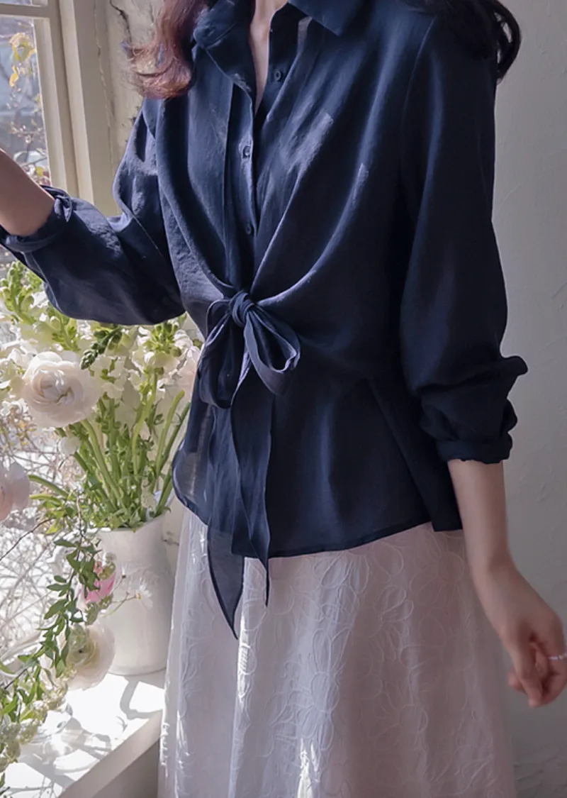 柔美簡約前側裹身綁帶飄逸排扣上衣