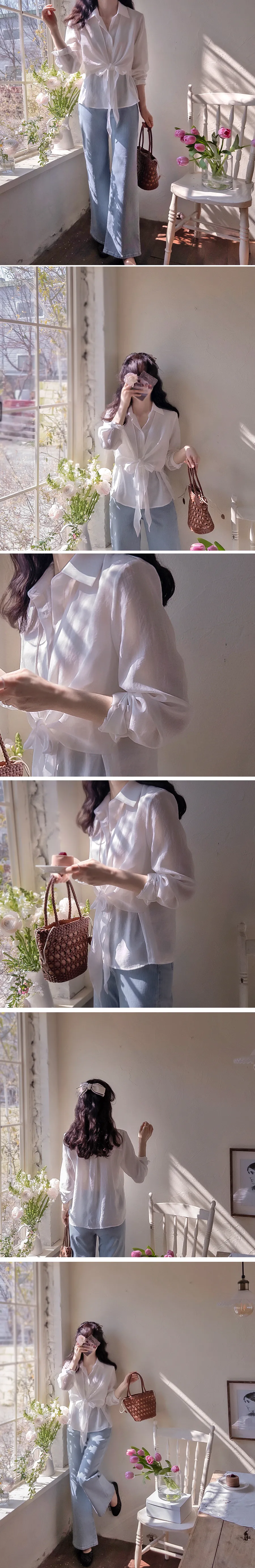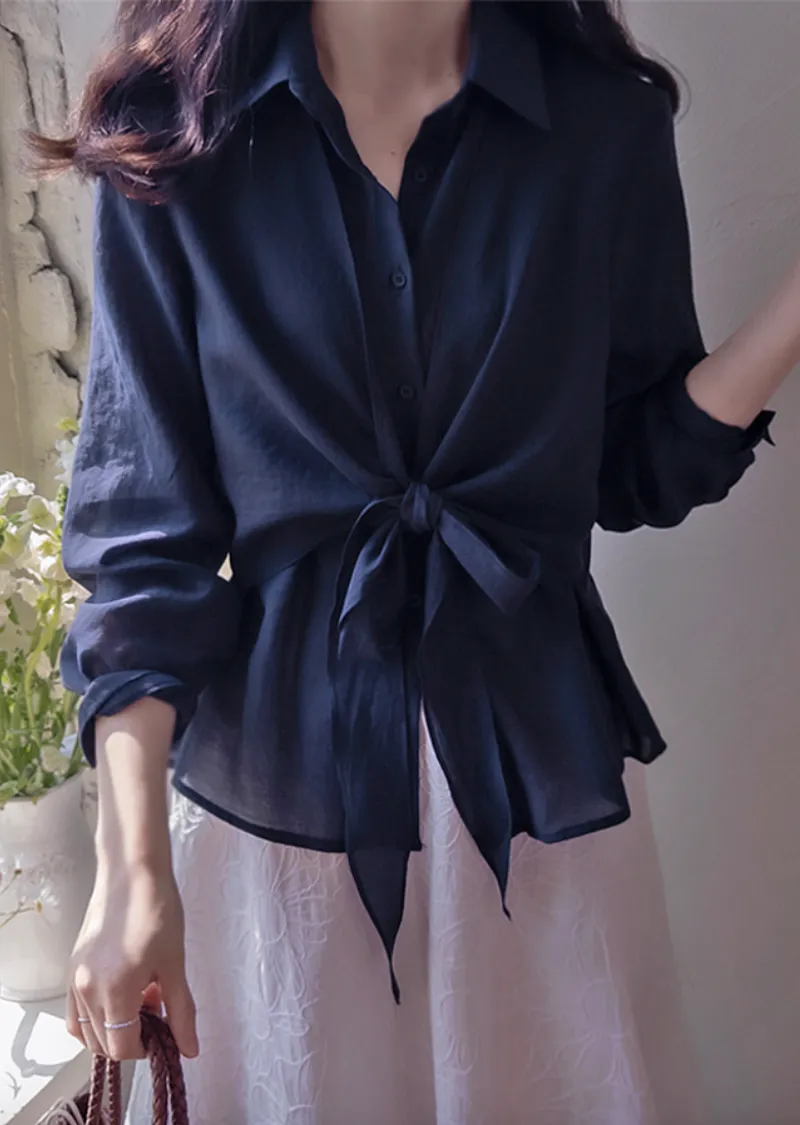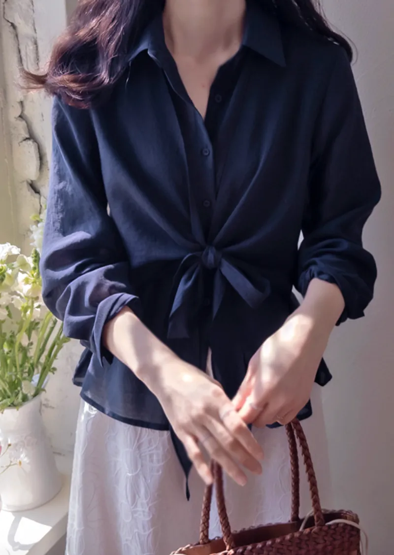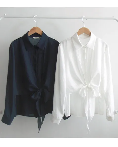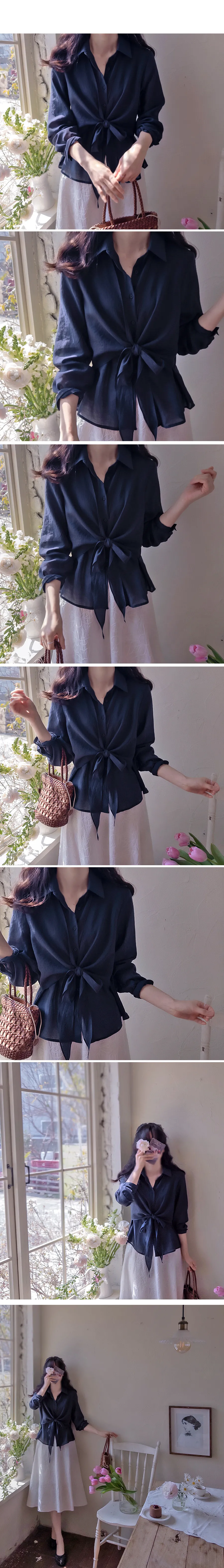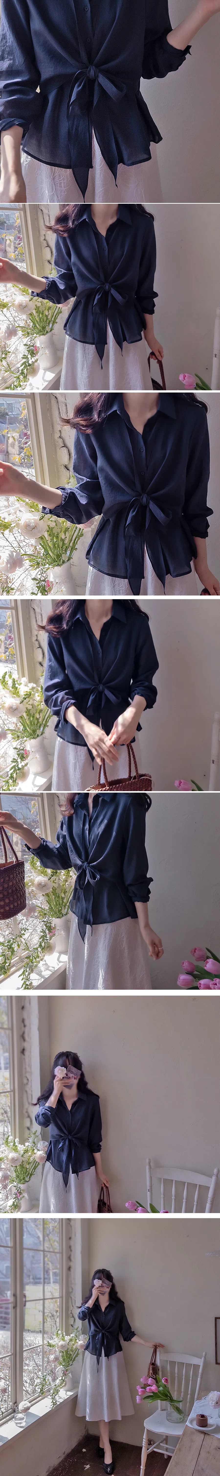 柔美簡約前側裹身綁帶飄逸排扣上衣