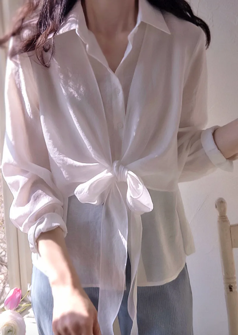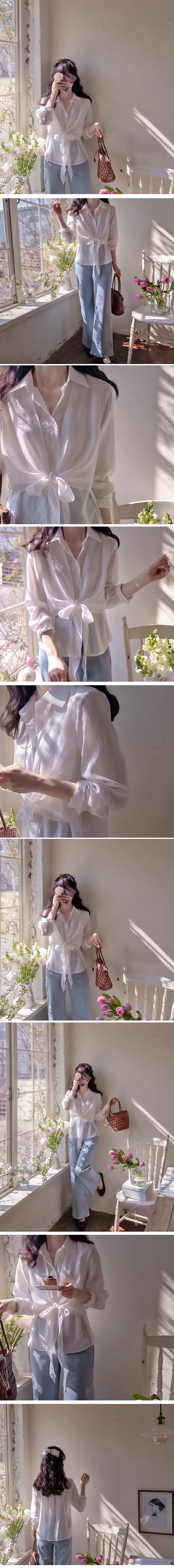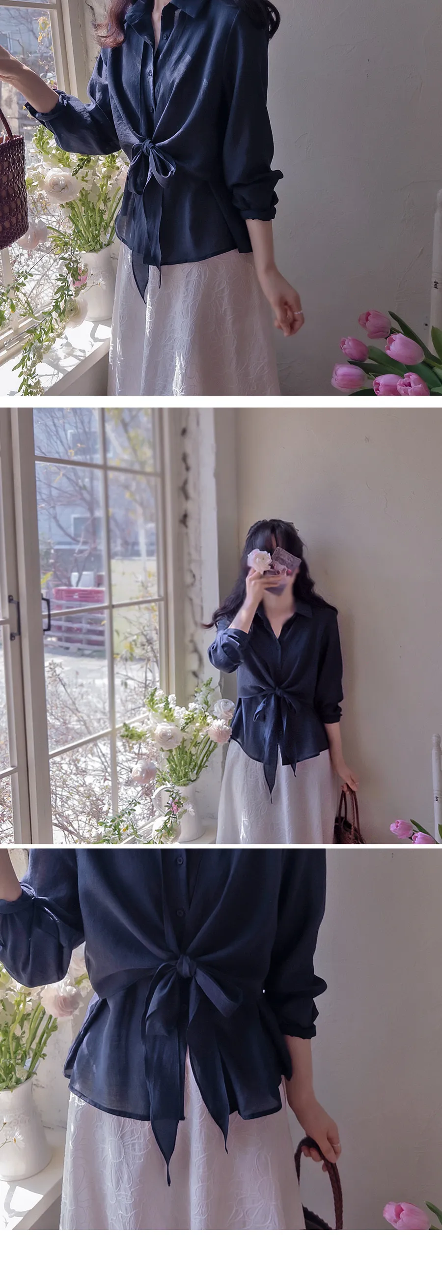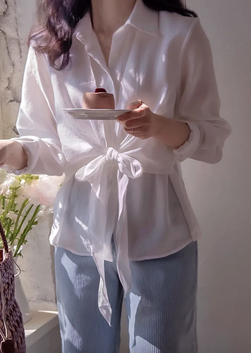 柔美簡約前側裹身綁帶飄逸排扣上衣