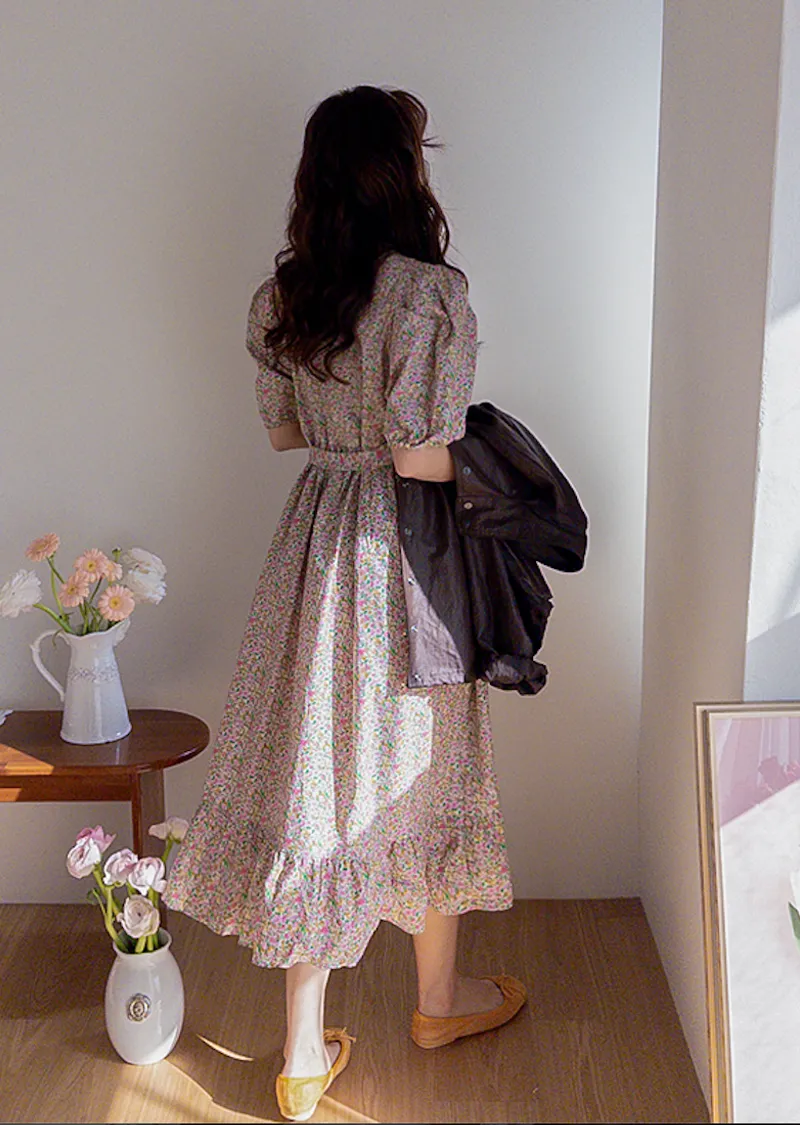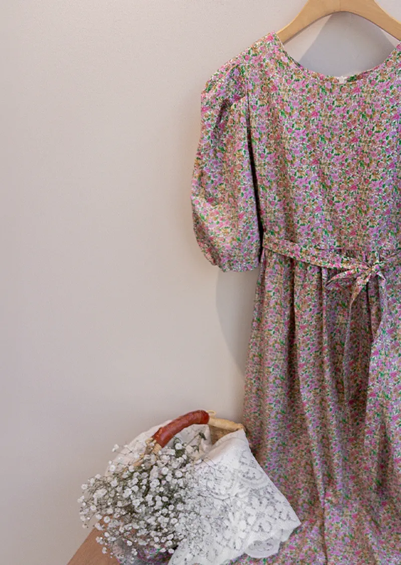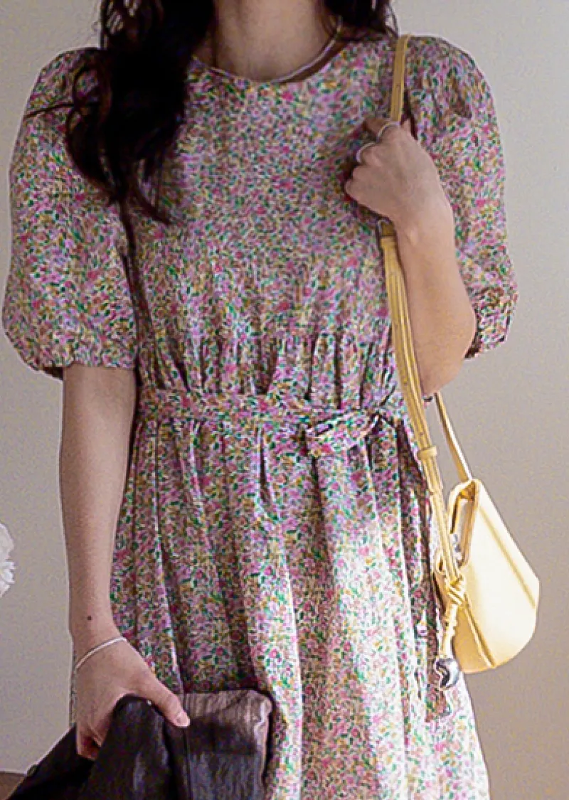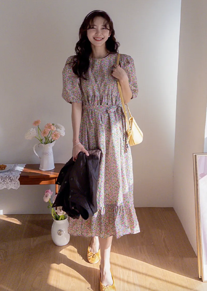 精緻輪廓蓬鬆肩線腰綁帶荷葉摺邊裙擺柔美花朵連身裙