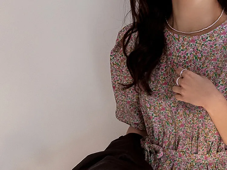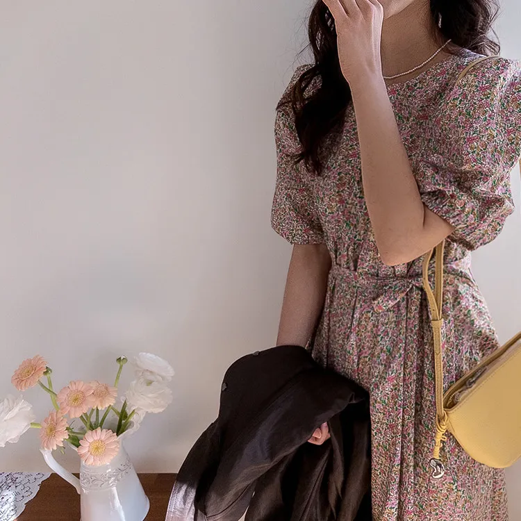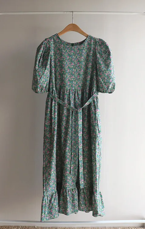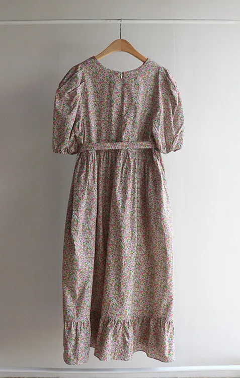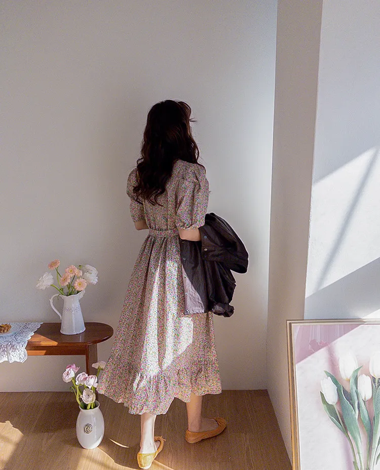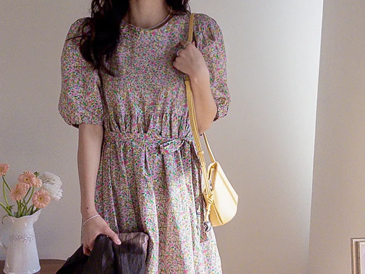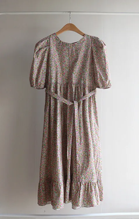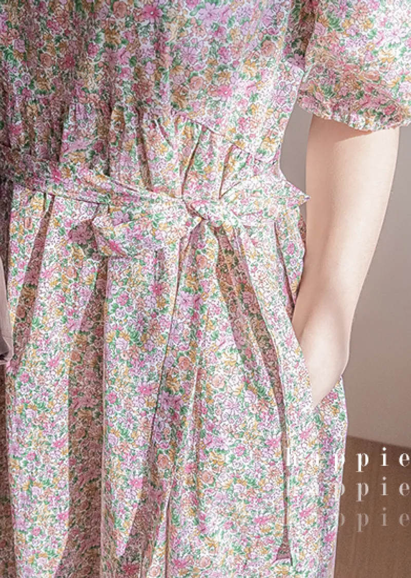 精緻輪廓蓬鬆肩線腰綁帶荷葉摺邊裙擺柔美花朵連身裙