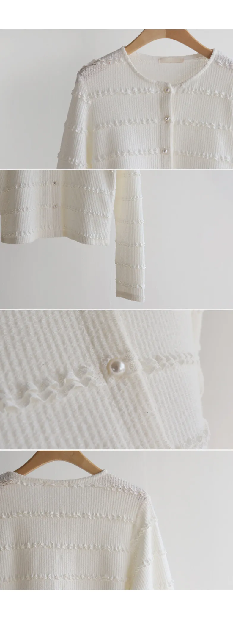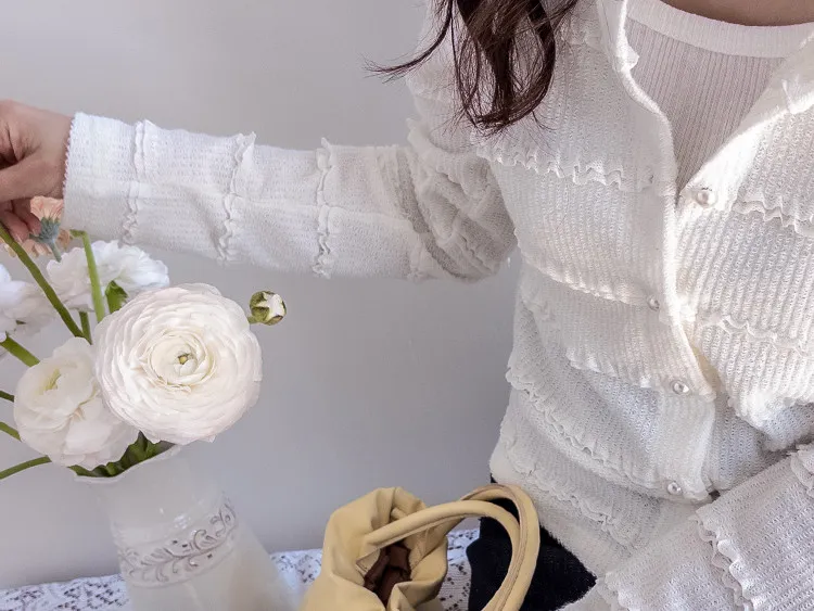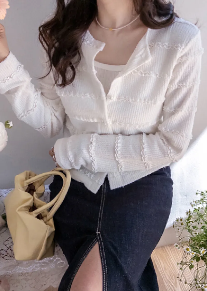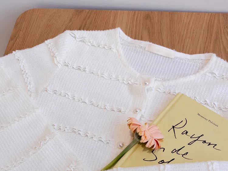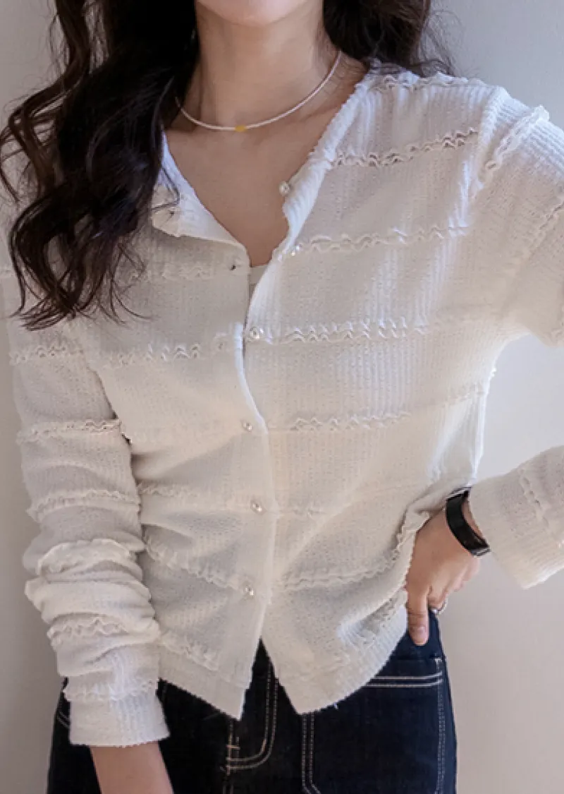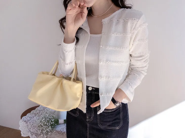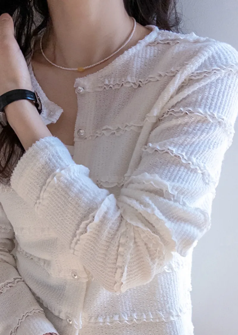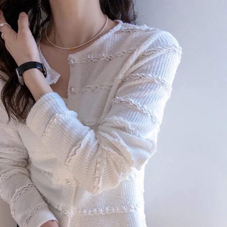 柔美立體摺邊褶皺紋理珍珠鈕扣開衫