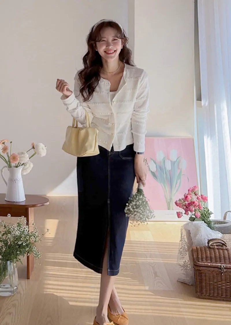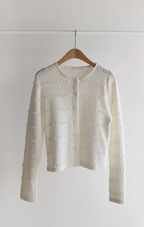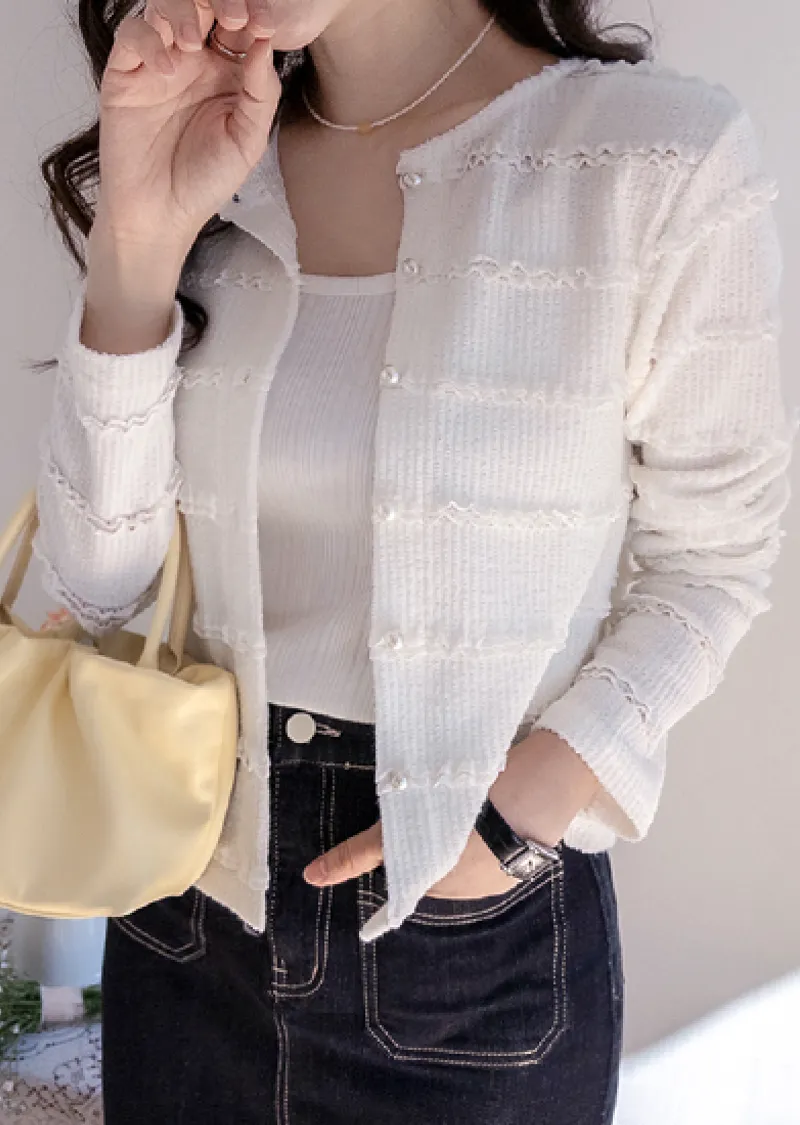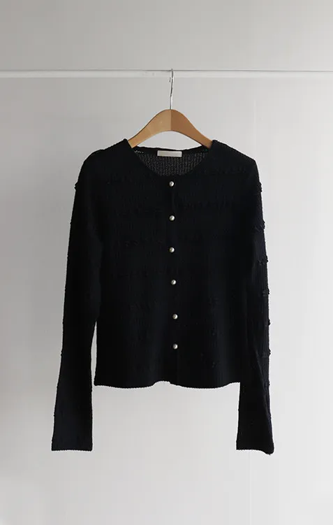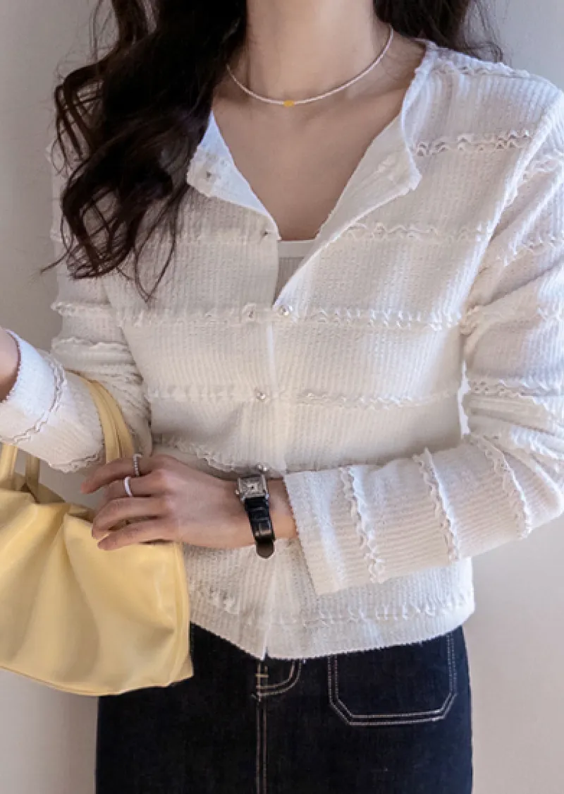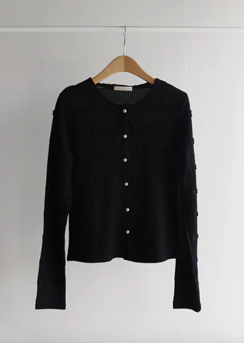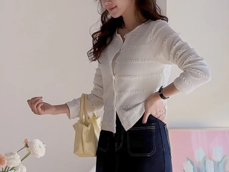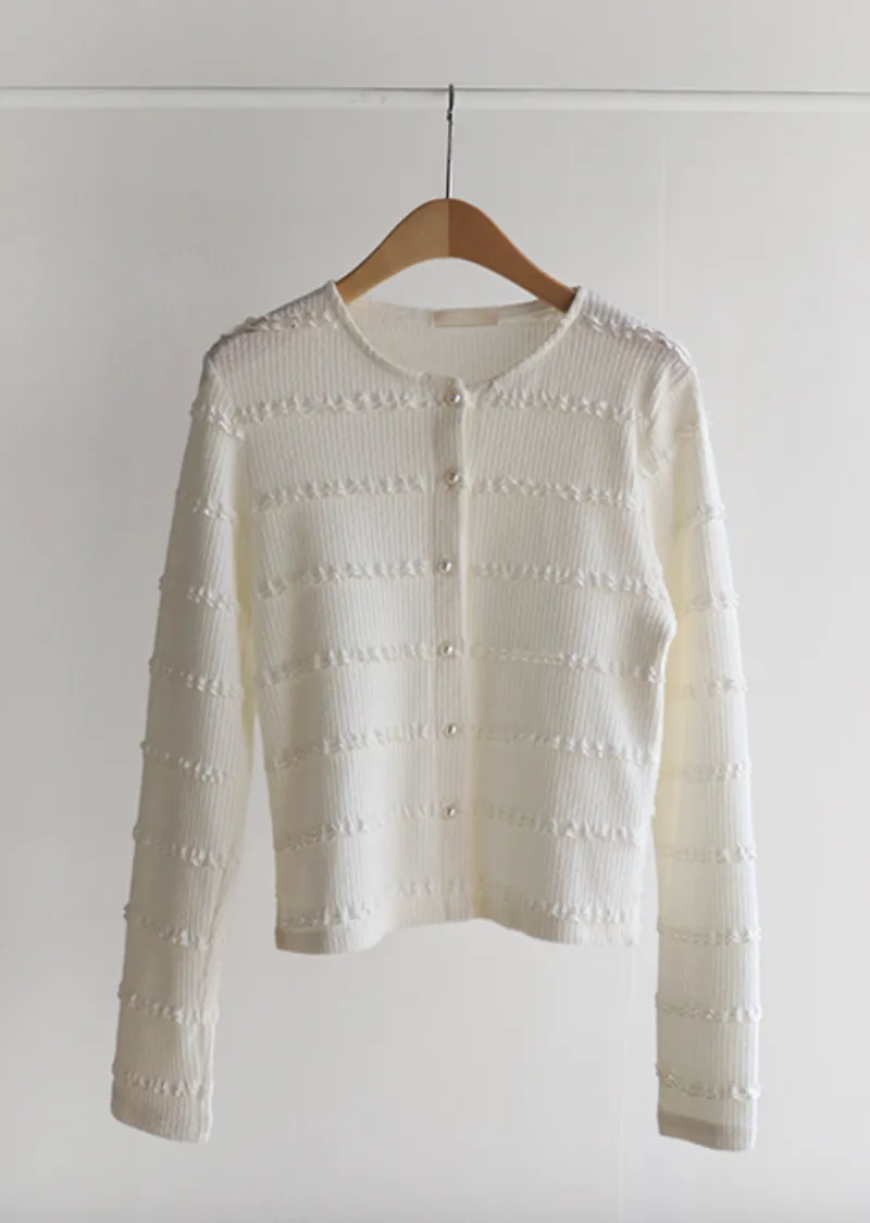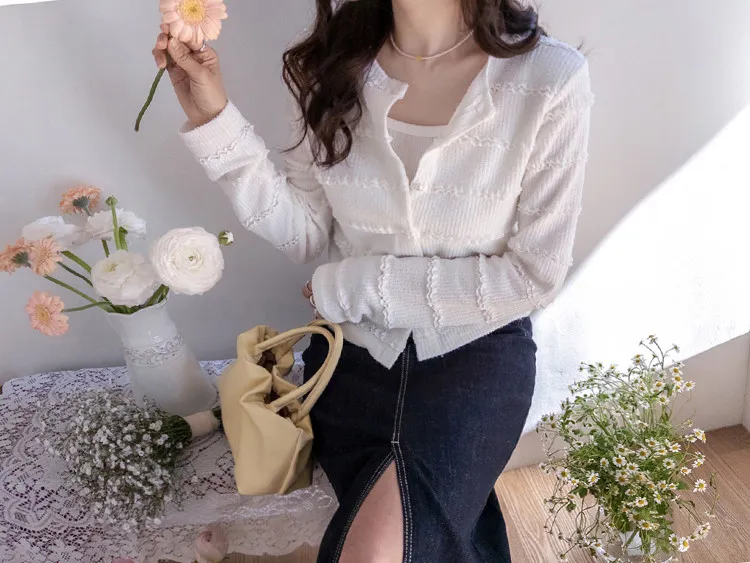 柔美立體摺邊褶皺紋理珍珠鈕扣開衫